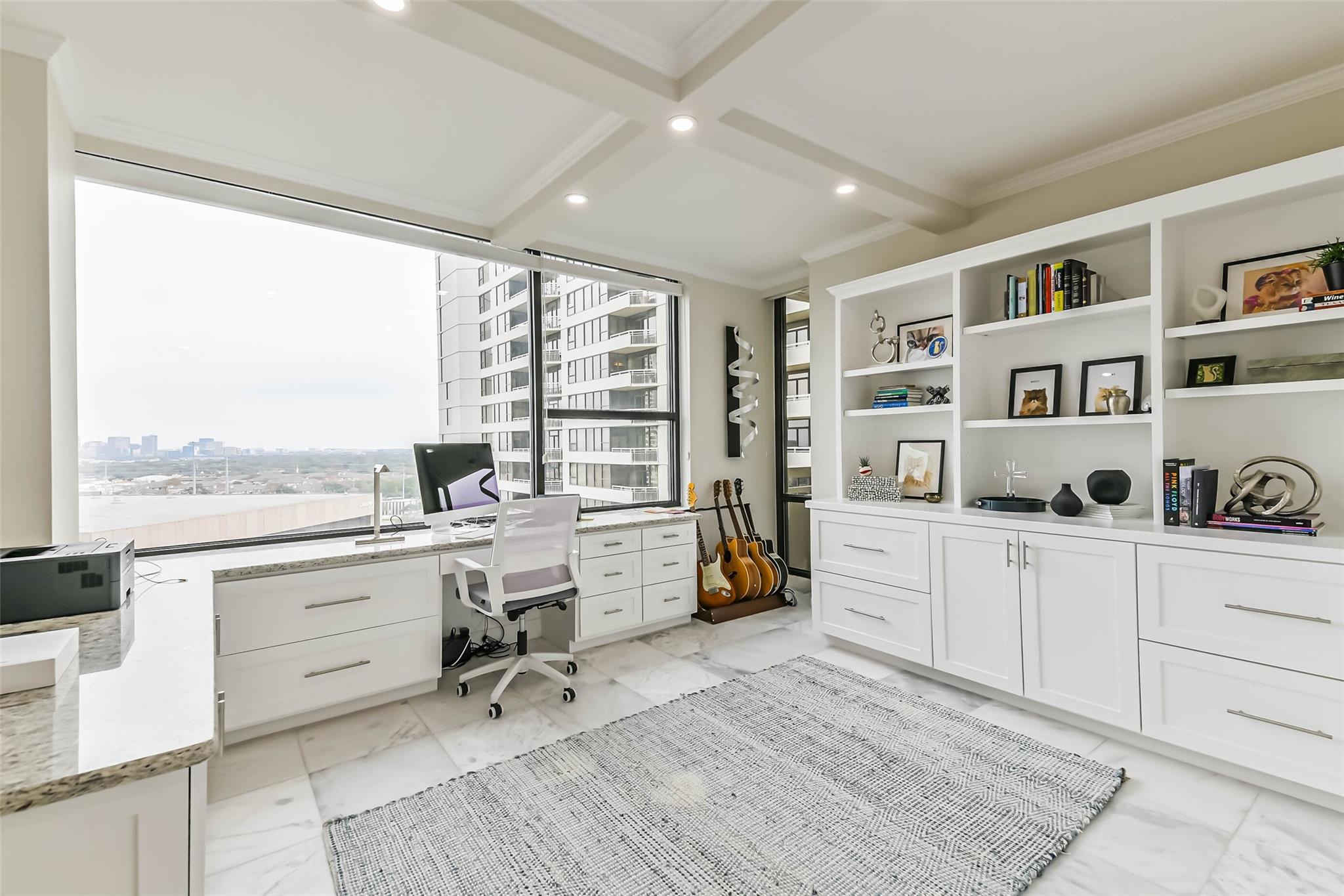 This truly special home enjoys incredible views east and southwest of the Texas Medical Center and Greenway Plaza. Recent marble floors throughout add to the light and airy vibe of this beautifully renovated unit. Taken to the studs in the Spring of 2020, the renovation included air duct cleaning, thermostat, heating element and water filtration system for both bathrooms and kitchen. The custom kitchen features quartz countertops and drawers and cabinets with soft close, undercount lighting and built-in wine rack. The two bathrooms include walk-in showers with ceramic tile surround, river rock tile floors and frameless glass enclosures. The large primary suite has a walk-in closet with custom storage. The secondary bedroom is currently equipped as an excellent home office. Enjoy the wonderful location with exceptional service and security provided by the popular Greenway community.