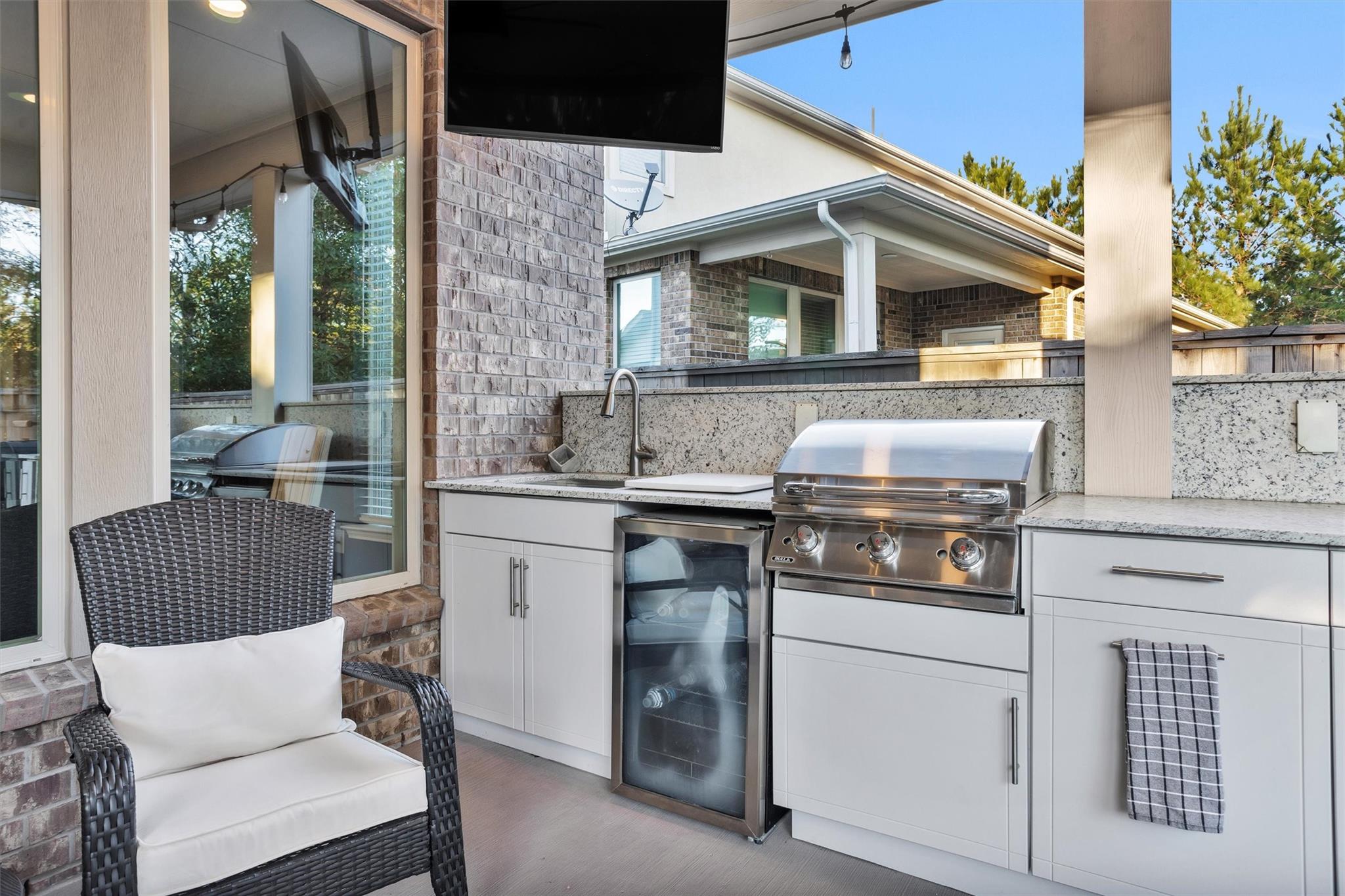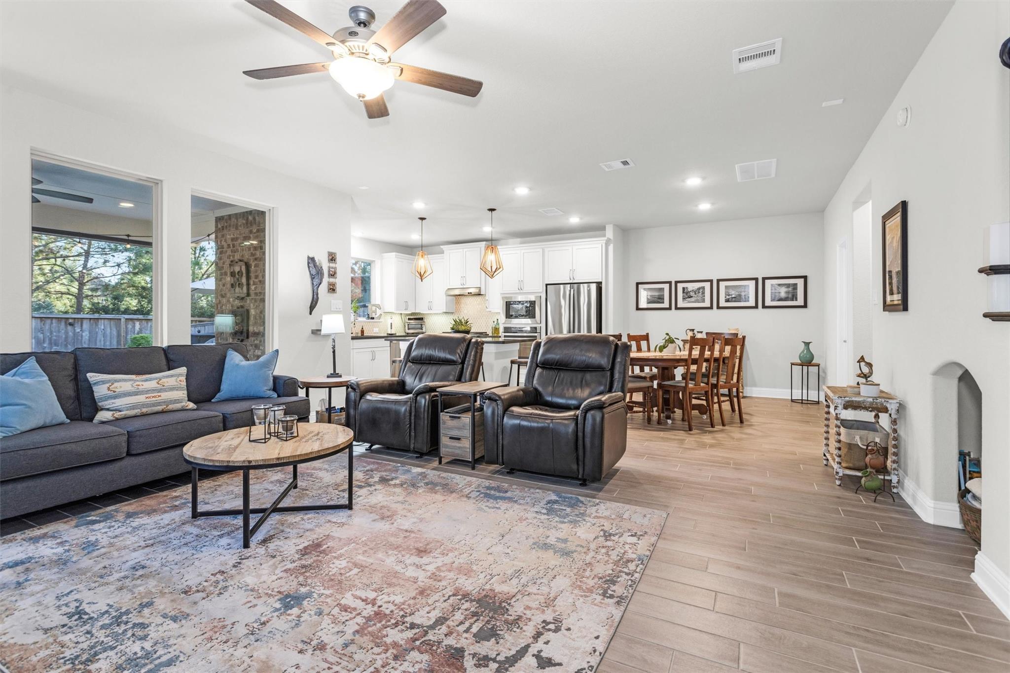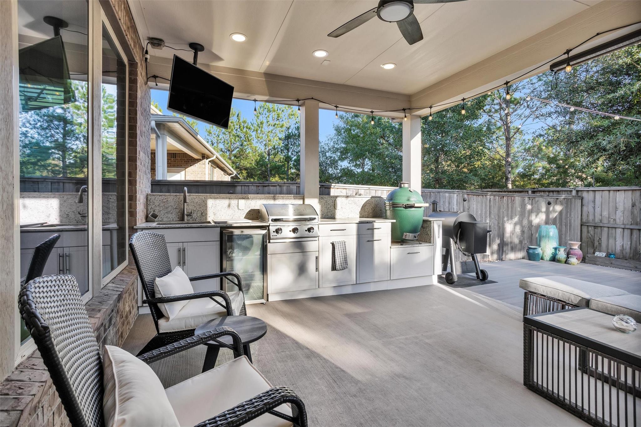 Welcome to luxury living in this Beazer townhome situated in the sought-after Sterling Ridge neighborhood of The Woodlands. This 3-bedroom, 2.5-bath residence showcases a grand entrance with high ceilings and an open layout complemented by wood-look tile flooring. The chef's kitchen is the focal point of the home, featuring a spacious island, premium Timberlake cabinetry, Silestone "Charcoal Soapstone" counters, and a butler's pantry. The family room offers views of the private backyard through expansive windows. Upstairs, a versatile loft and a primary suite with a tray ceiling and spa-like bath awaits. The backyard oasis is a "dream" with no rear neighbors, an extended covered patio, over 400 sq. ft. of Trex decking, a hot tub, and a custom outdoor kitchen with a Large Green Egg, SS griddle, Treager Grill/smoker, custom landscape lighting front & back. Energy-efficient features include spray foam insulation and a tankless water heater. HOA covers insurance & front yard maintenance.