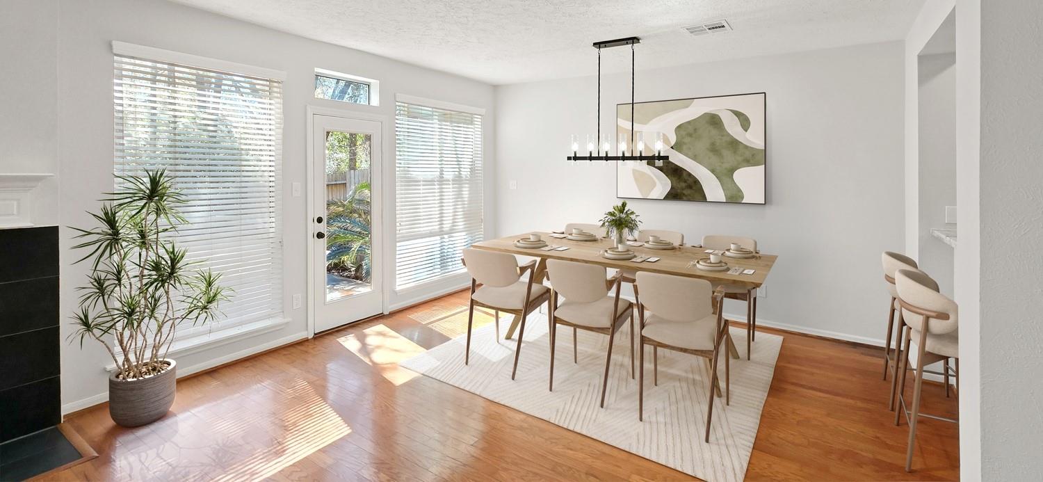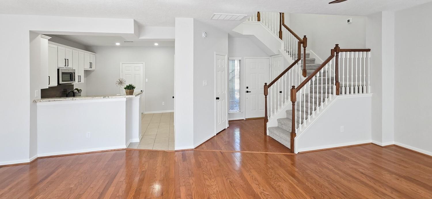 Updated 3-bedroom, 2.5-bath townhome located in the Valley Oaks section of Village Alden Bridge in The Woodlands. This refined residence offers fresh paint, new plush carpet, tile flooring, and curated designer lighting that elevate the home’s modern appeal. An elegant formal dining space transitions seamlessly into the open-concept kitchen and living area, creating an effortless setting for both intimate dinners and upscale entertaining. The kitchen is beautifully appointed with shaker-style cabinetry, granite countertops, and stainless steel appliances. The serene primary suite provides a private retreat featuring a spa-inspired ensuite bath with a soaking tub and frameless glass shower. Two additional spacious bedrooms share a well-appointed full bath. Outdoors, enjoy a private backyard escape complete with a flagstone patio and expansive wood deck designed for stylish outdoor living.A rare opportunity for low-maintenance luxury in one of the area’s most desirable communities.