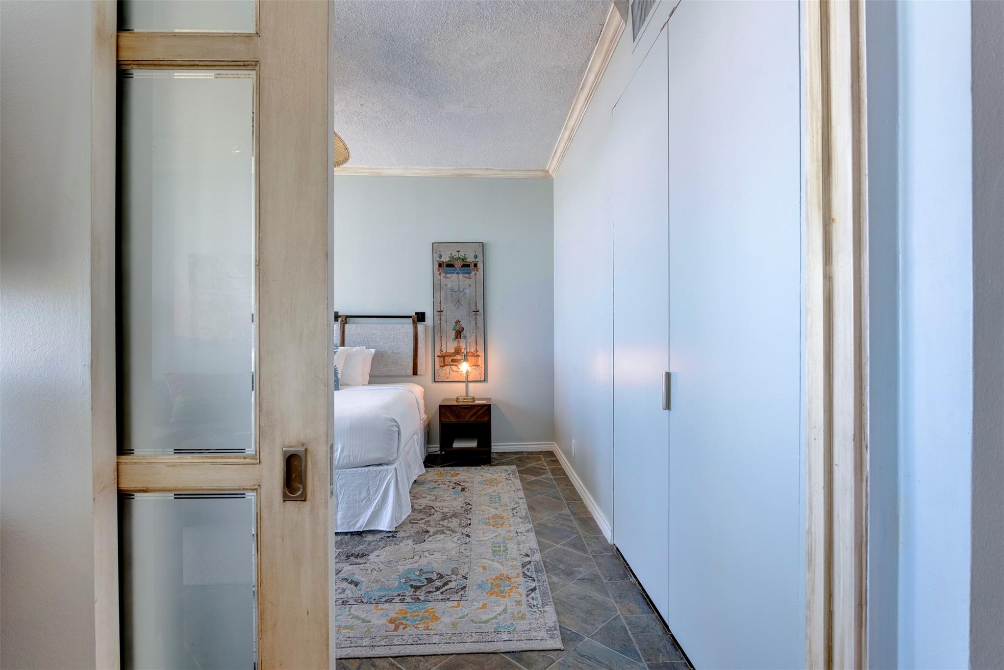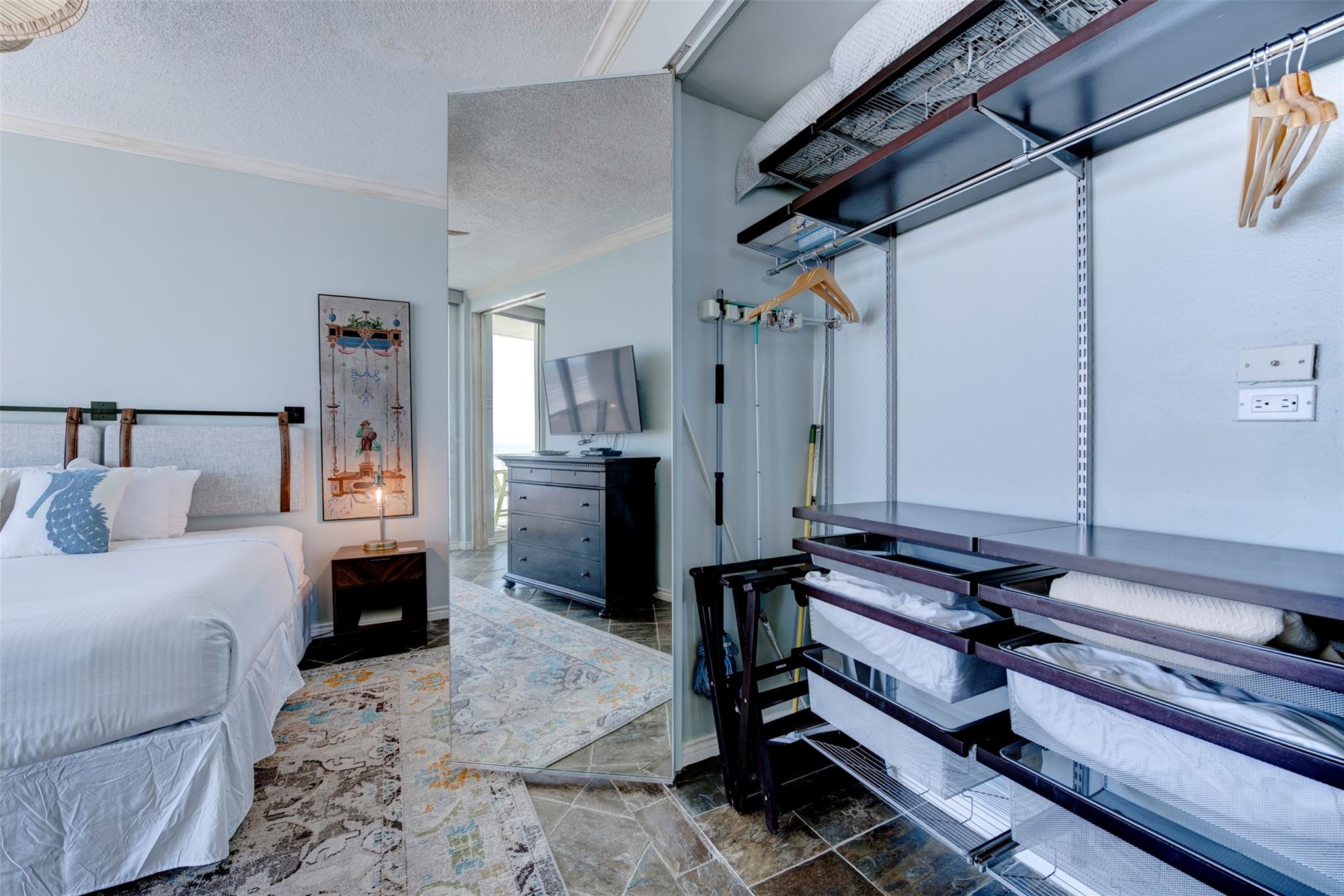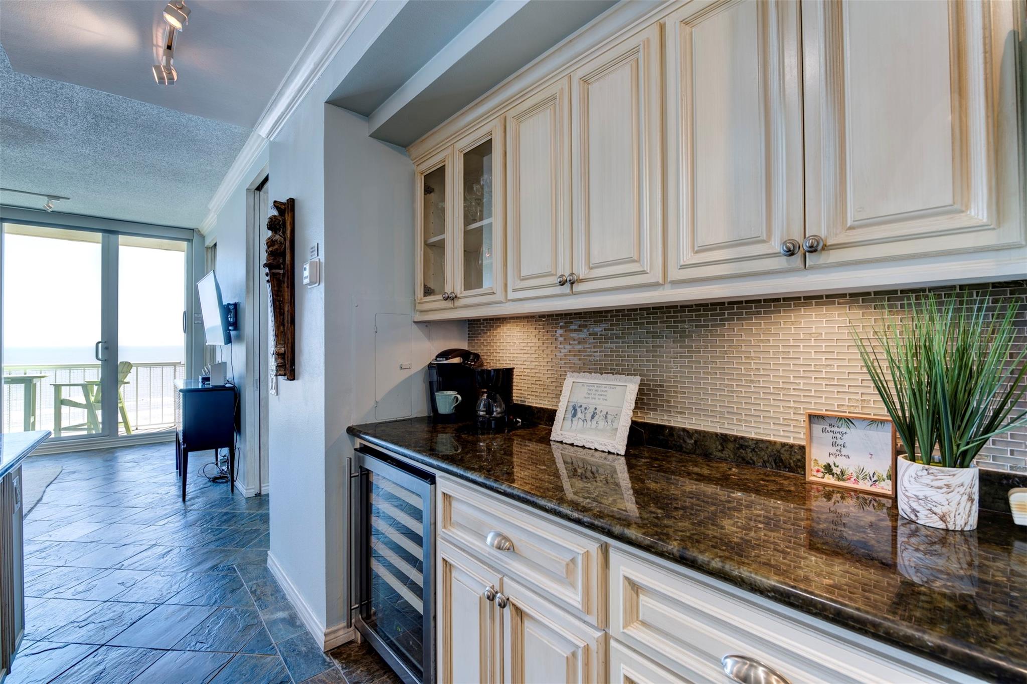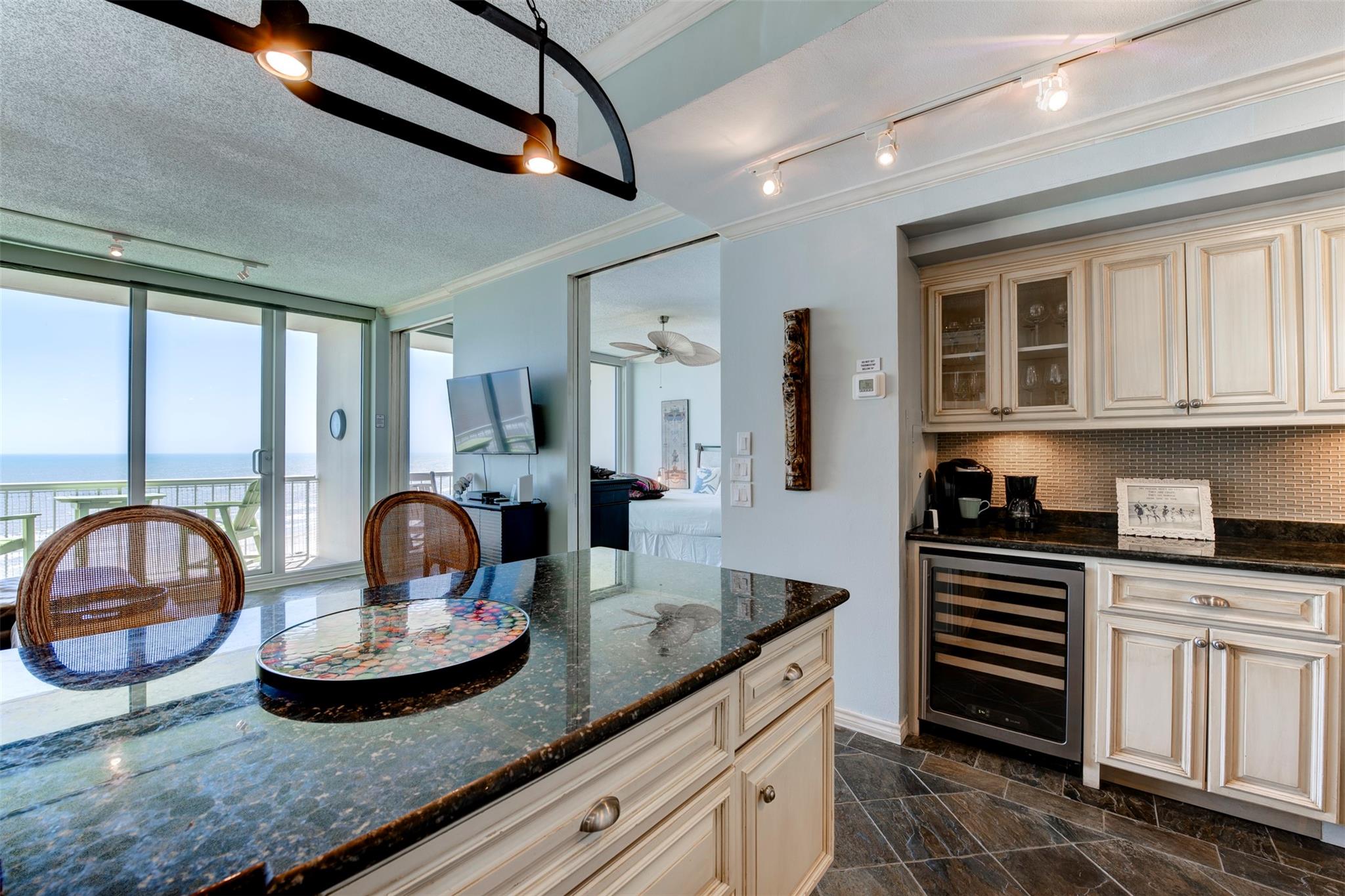 Top-floor beachfront condo offering a serene coastal retreat at The Galvestonian. This beautifully updated unit features high ceilings and floor-to-ceiling glass walls, providing stunning ocean and horizon views from every room. The open layout includes slate flooring throughout and abundant natural light. The upgraded kitchen boasts granite countertops, custom cabinetry, tiled backsplash, dry bar, and wine fridge—ideal for entertaining. The primary suite features dual pocket doors for an open flow to the living area, maximizing views and light. The spa-like bathroom includes a glass-tiled walk-in shower, updated fixtures, and modern finishes. Enjoy two private balconies, electric blackout shades, and furnishings included for a turnkey experience. With direct access to East Beach, amenities include a heated pool, fire pit, picnic area, fitness center, and 24/7 staffed lobby. Excellent rental history!