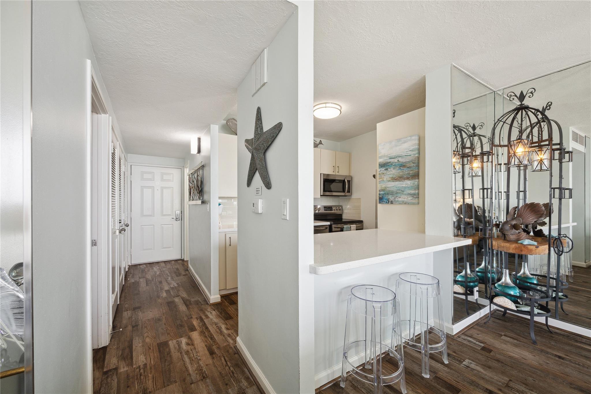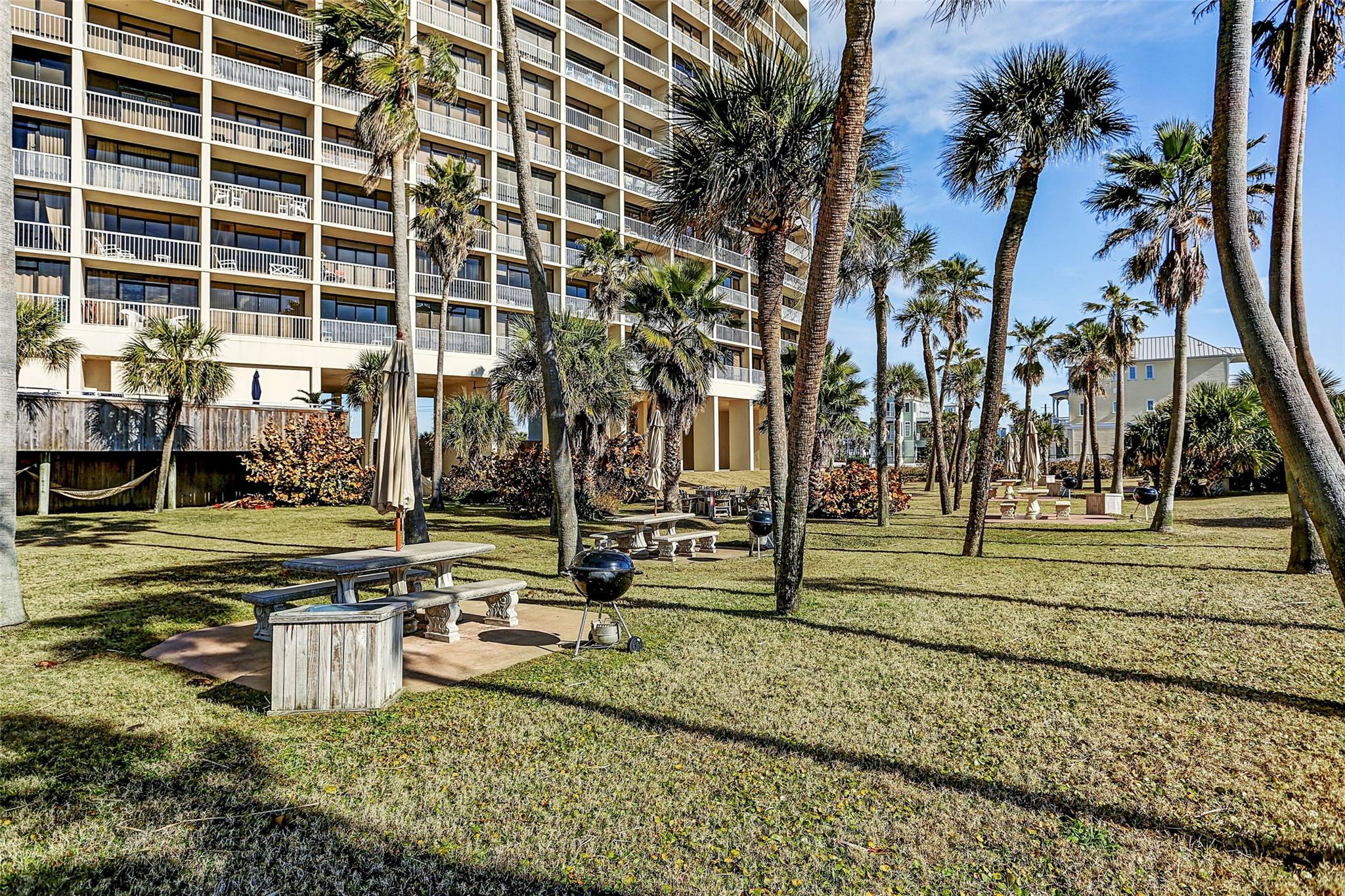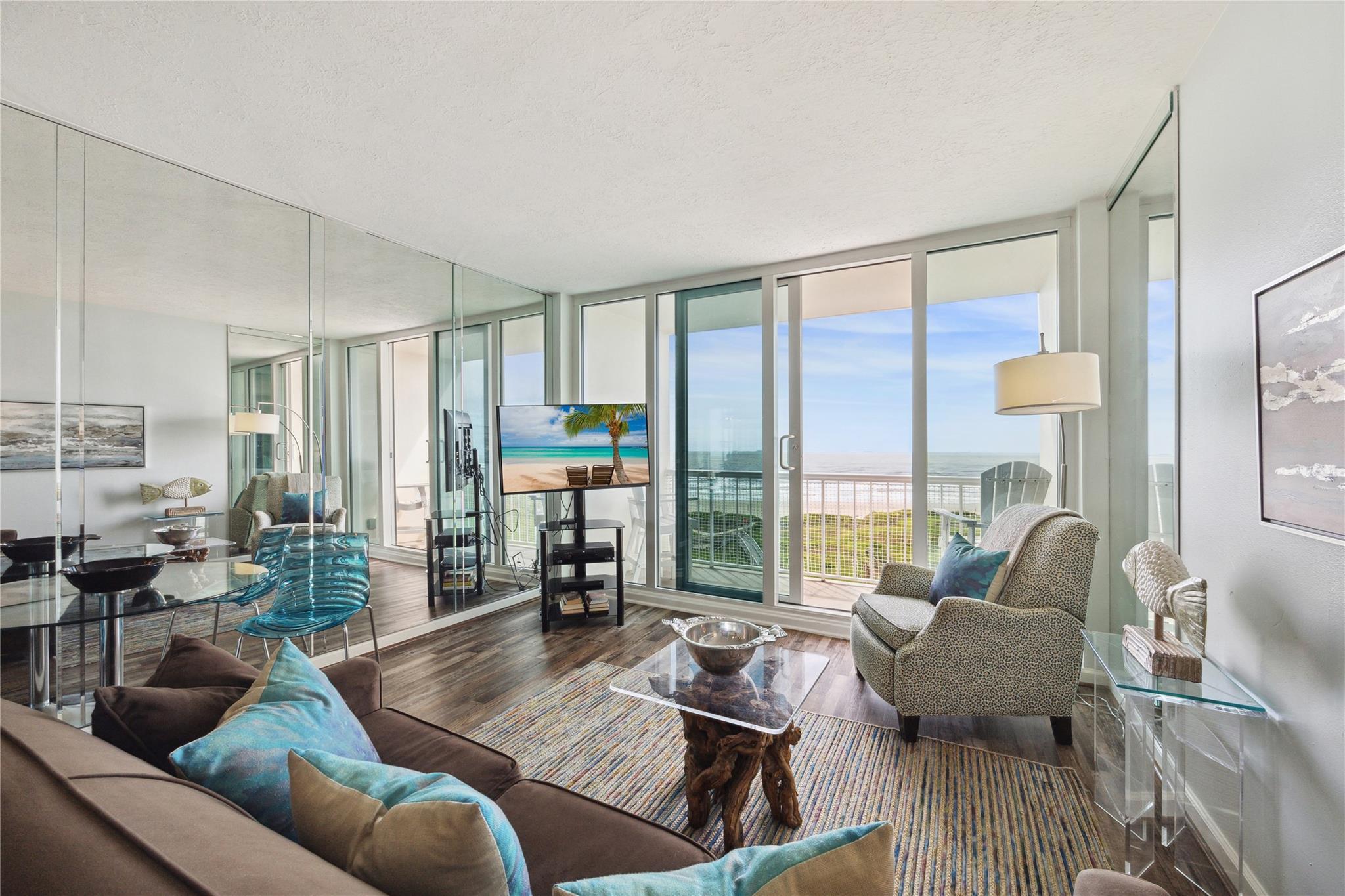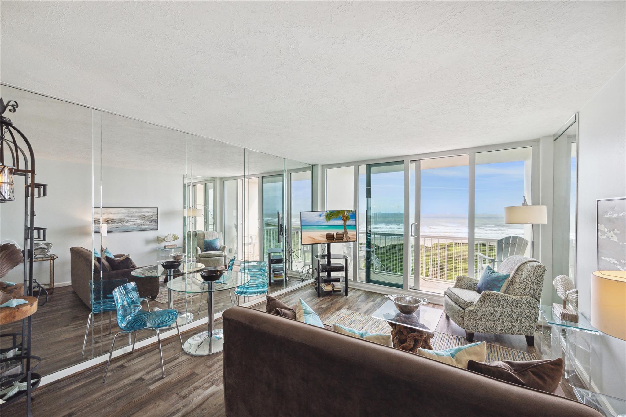 Excellent opportunity to own a stellar condo in the coveted beachfront Galvestonian. Expansive terrace of this distinctive island residence boasts glorious vistas of the azure blue ocean, the bay & majestic cruise & cargo ships. Stunning “hardwoods look” wide plank laminate flooring, a breathtaking “wall of glass” opening to the terrace, designer upgrades & exquisite finishes are prominent thruout. Fab open plan-ideal for coastal entertaining! Divine living room distinguished by exceptional mirrored wall, outstanding queen-size sofa bed & inviting Gulf-side terrace. The terrace is ideal venue to admire spectacular island sunrises while you sip a delicious cappuccino. Superb chef’s kitchen appointed w/high-caliber appliances (inc. a 5-burner glass top Frigidaire range & new Samsung French door refrigerator), gorgeous quartz counters, gleaming subway glass tile backsplashes & a breakfast bar. Marvelous primary bedrm. Luxurious hall bath. Excellent short term rental income poten