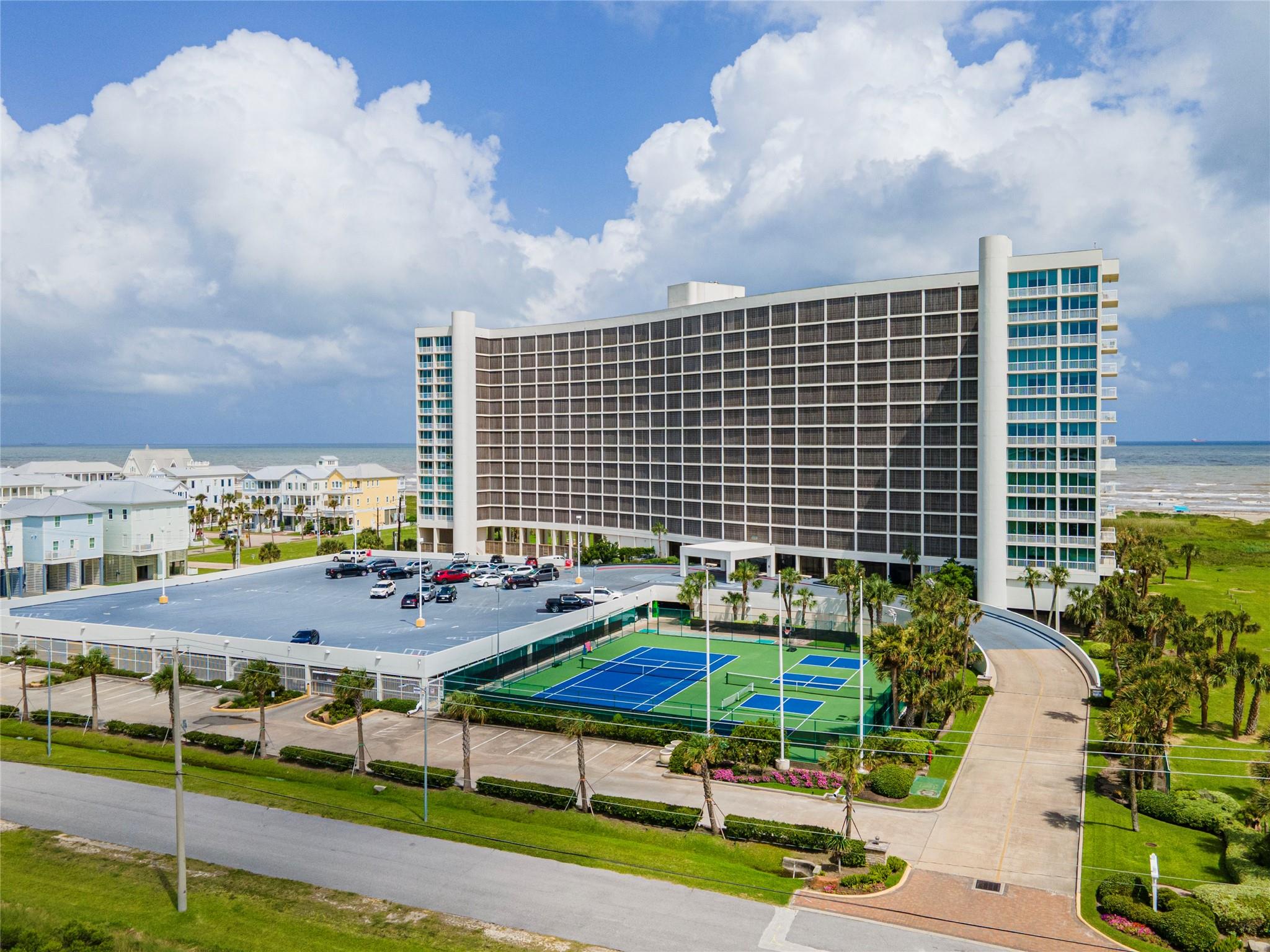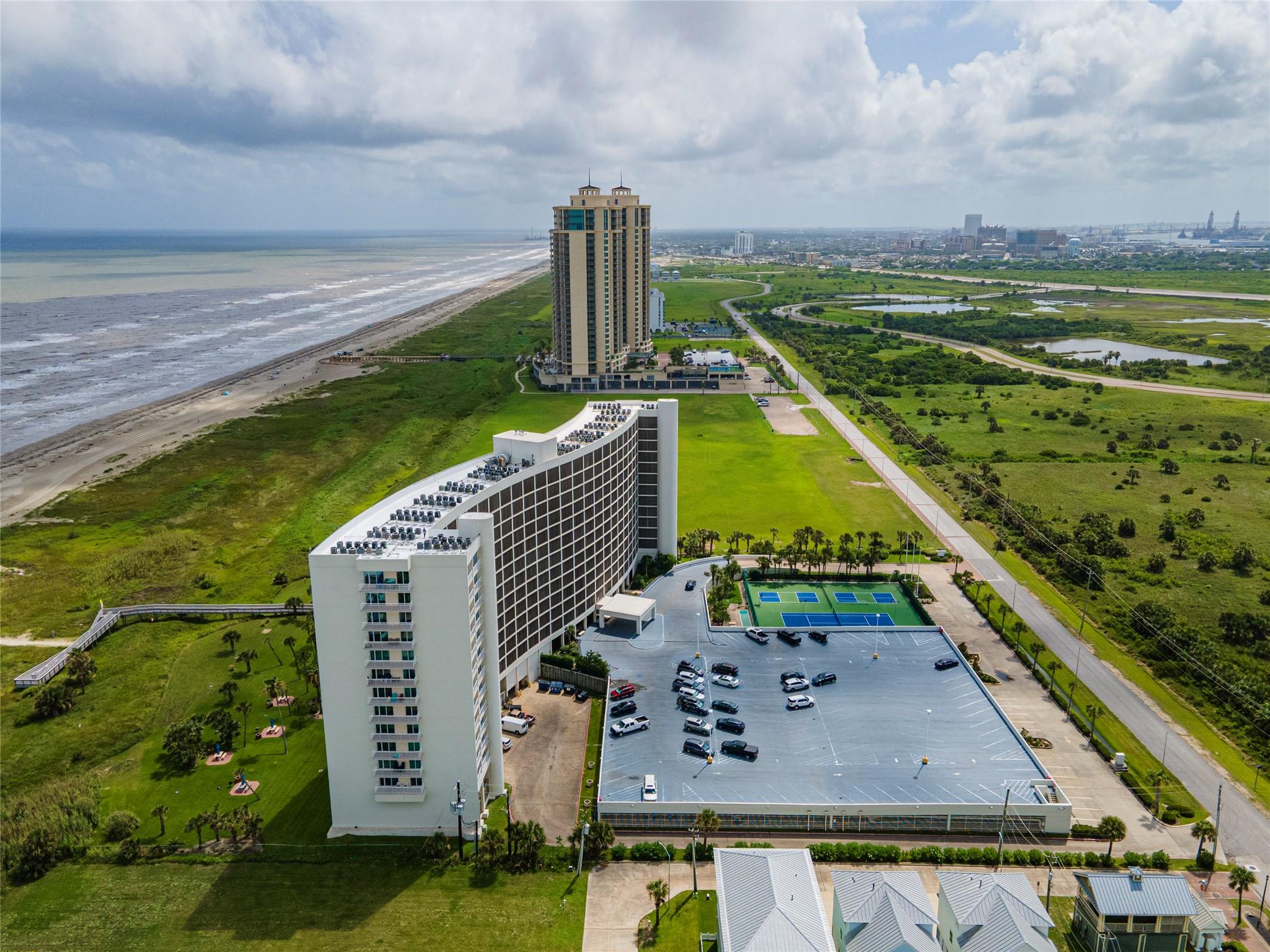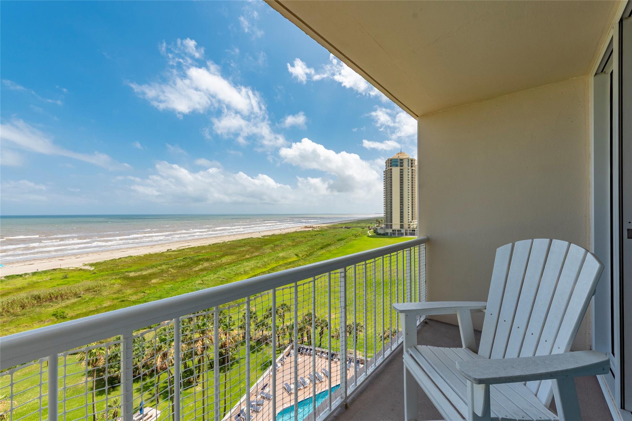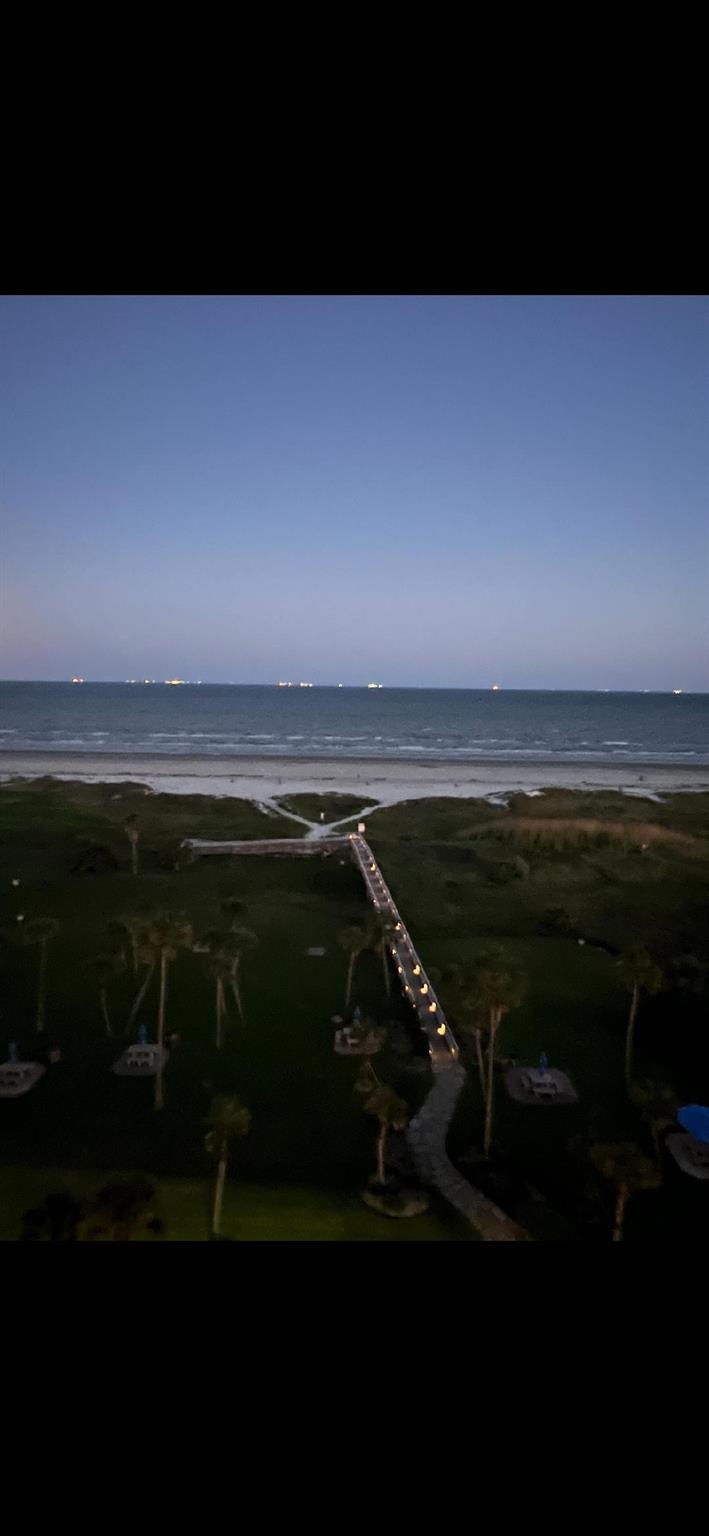Amazing Gulf and Beach Views from the Beachfront balcony and living room. Enjoy the Ocean Breeze and beautiful Landscaped grounds with palm trees. Watch Pelicans gliding and ships sailing by. Gorgeous sunrises and spectacular sunsets! East Beach is just a few steps away. This condo has a Great Location on the 8th floor and only the 3rd unit from the elevator. Great Open Living Room. Kitchen has a Breakfast bar and granite counters. Bedroom has a king size bed, 2 side tables and a dresser. The living room has a queen size sleeper sofa. The Galvestonian has a stunning lobby, heated pool and spa, lounge chairs, a fitness room, BarBQ pits with picnic tables, tennis courts, pickle ball, gorgeous landscaping and lots of fun holiday events. Cruise ships and Pleasure Pier can be seen from this unit. Close to the Historic Strand and Famous Gaveston Restaurants. All Interior furniture and kitchen dishes, glasses, silverware, pots and pans are included.