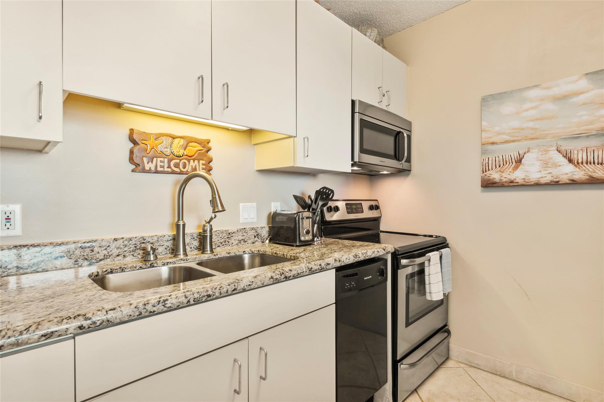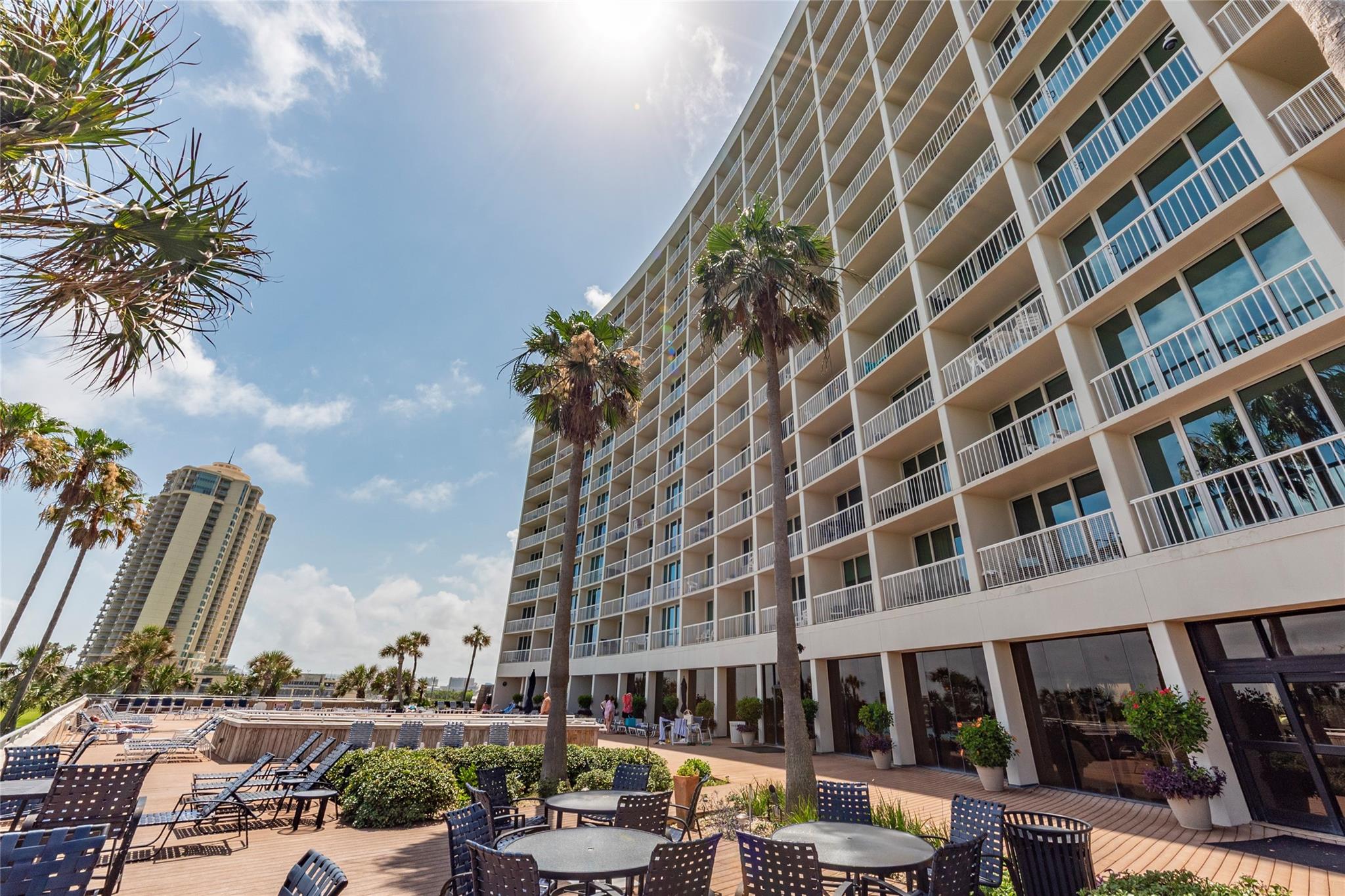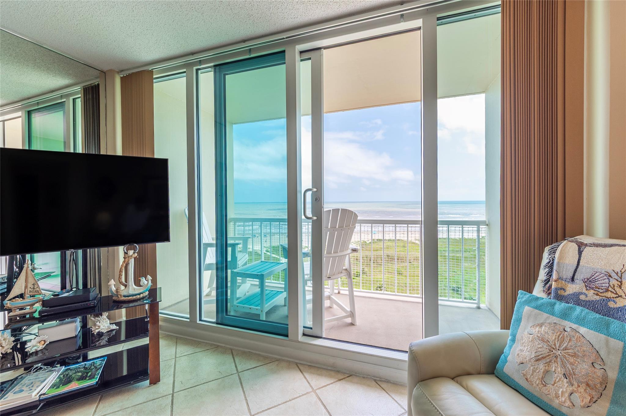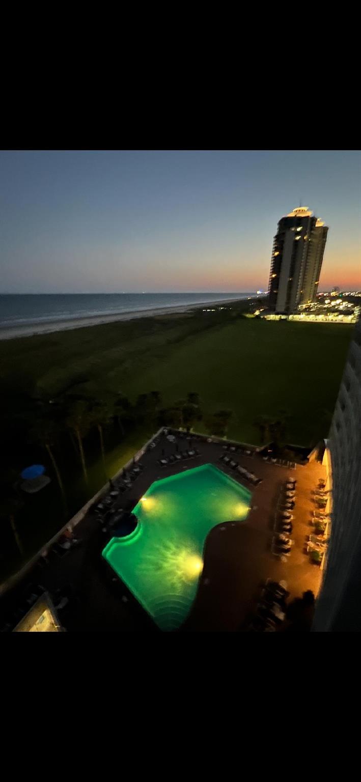 Amazing Gulf and Beach Views from the Beachfront balcony and living room. Enjoy the Ocean Breeze and beautiful Landscaped grounds with palm trees. Watch Pelicans gliding and ships sailing by. Gorgeous sunrises and spectacular sunsets! East Beach is just a few steps away. This condo has a Great Location on the 8th floor and only the 3rd unit from the elevator. Great Open Living Room. Kitchen has a Breakfast bar and granite counters. Bedroom has a king size bed, 2 side tables and a dresser. The living room has a queen size sleeper sofa. The Galvestonian has a stunning lobby, heated pool and spa, lounge chairs, a fitness room, BarBQ pits with picnic tables, tennis courts, pickle ball, gorgeous landscaping and lots of fun holiday events. Cruise ships and Pleasure Pier can be seen from this unit. Close to the Historic Strand and Famous Gaveston Restaurants. All Interior furniture and kitchen dishes, glasses, silverware, pots and pans are included.