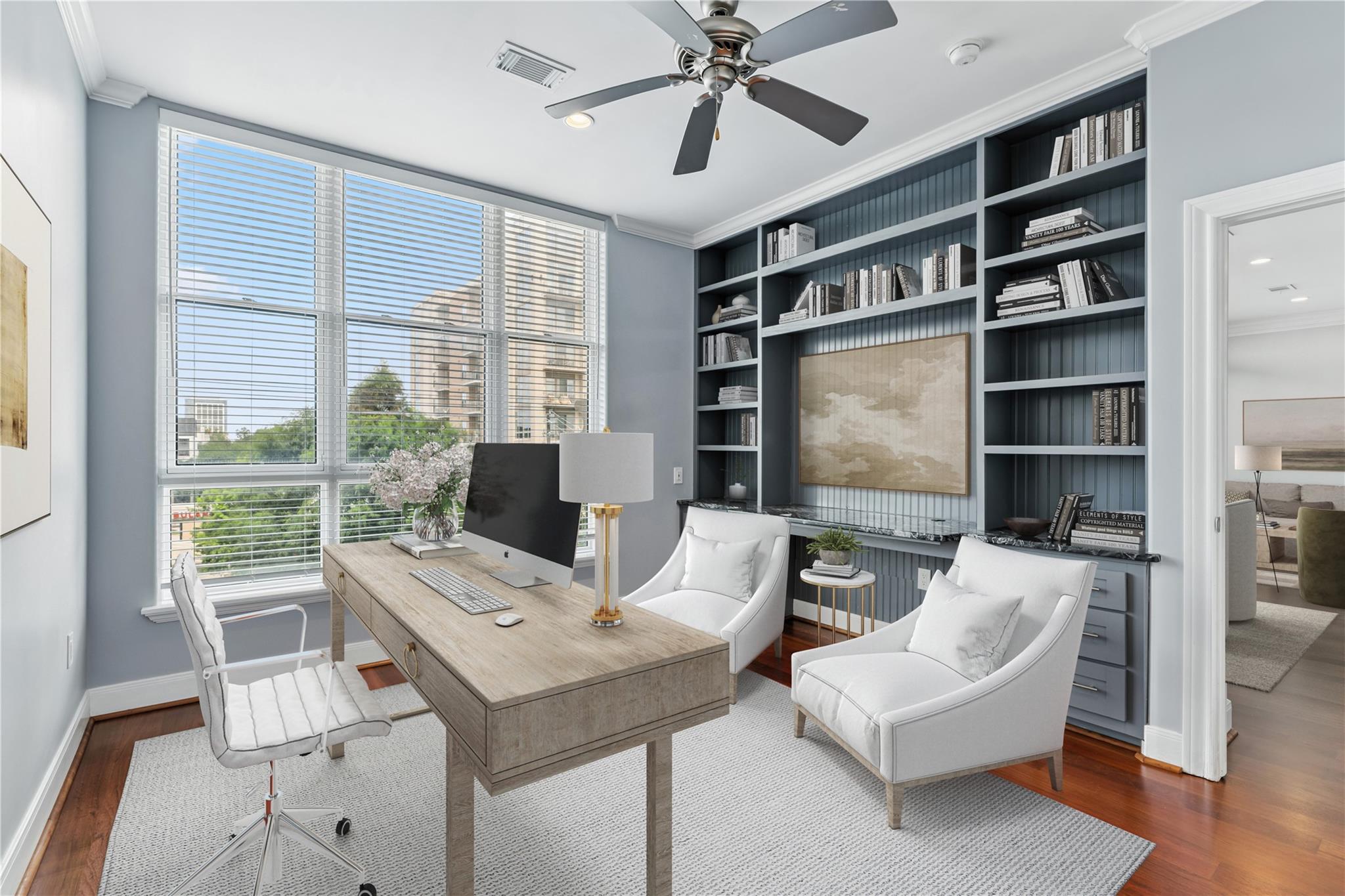 Lock & leave living in the heart of Montrose with a generous split floor plan. Beautifully maintained with recently (25’) refinished solid Brazilian Cherry hardwood floors throughout. The open island kitchen wows with tons of storage, stainless steel appliances and granite counters. The spacious primary has an updated ensuite bath with granite counters, double sinks, stone floors, a separate shower, and a whirlpool tub and great walk-in closet. Secondary bedroom offers a walk-in closet and wall of custom built-in’s. Enjoy treetop and Galleria views from the oversized, private balcony. Utility closet features full sized washer and dryer. Terrific location offers great walkability. Close to downtown, Buffalo Bayou hike and bike trails, world class shopping dining… Controlled building and parking entrance.