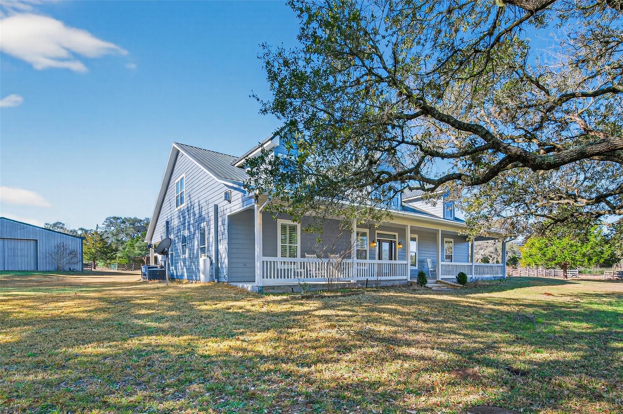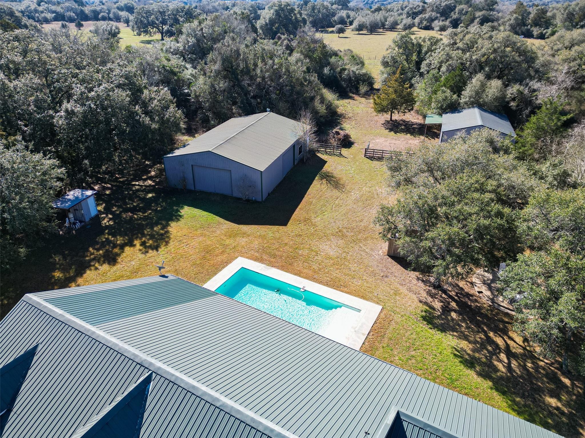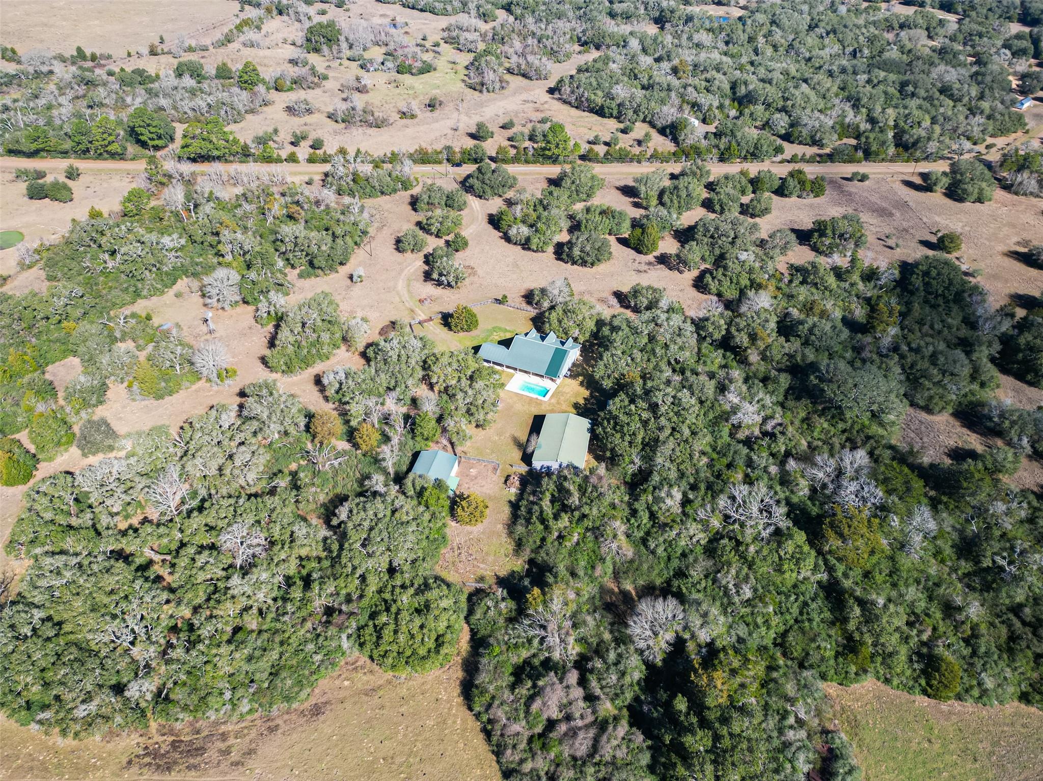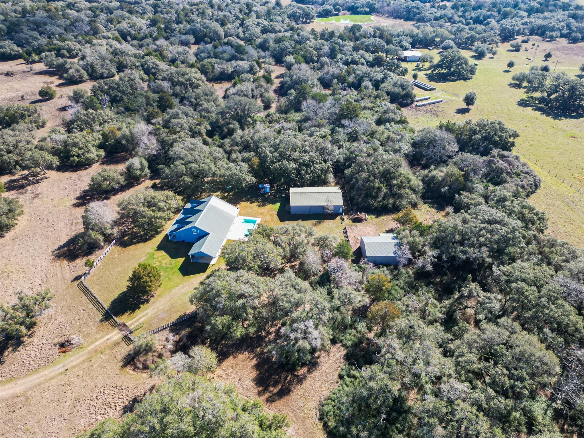 23.6 unrestricted acres in Cat Spring featuring a 3,549 SF farmhouse with private in-ground pool, barn, 2 horse stalls, cross fencing, workshop, PLUS barndominium-style full guest quarters, in addition to listed sq ft! Built in 2009, this home offers open-concept living, breakfast bar, 3 bedrooms downstairs including primary suite with double sinks, separate shower, vanity area, and walk-in closets. Upstairs is built to impress with 8 built-in bunk beds, full bath including 2 showers, urinals, second kitchenette, and second laundry room (with bonus secret room!) —ideal for large gatherings or multi-use living. Attached 2-car carport, gated driveway, 2 water wells, septic, central electric HVAC, ag exemption in place. Horses allowed. Cleared pasture and wooded acreage. No restrictions.