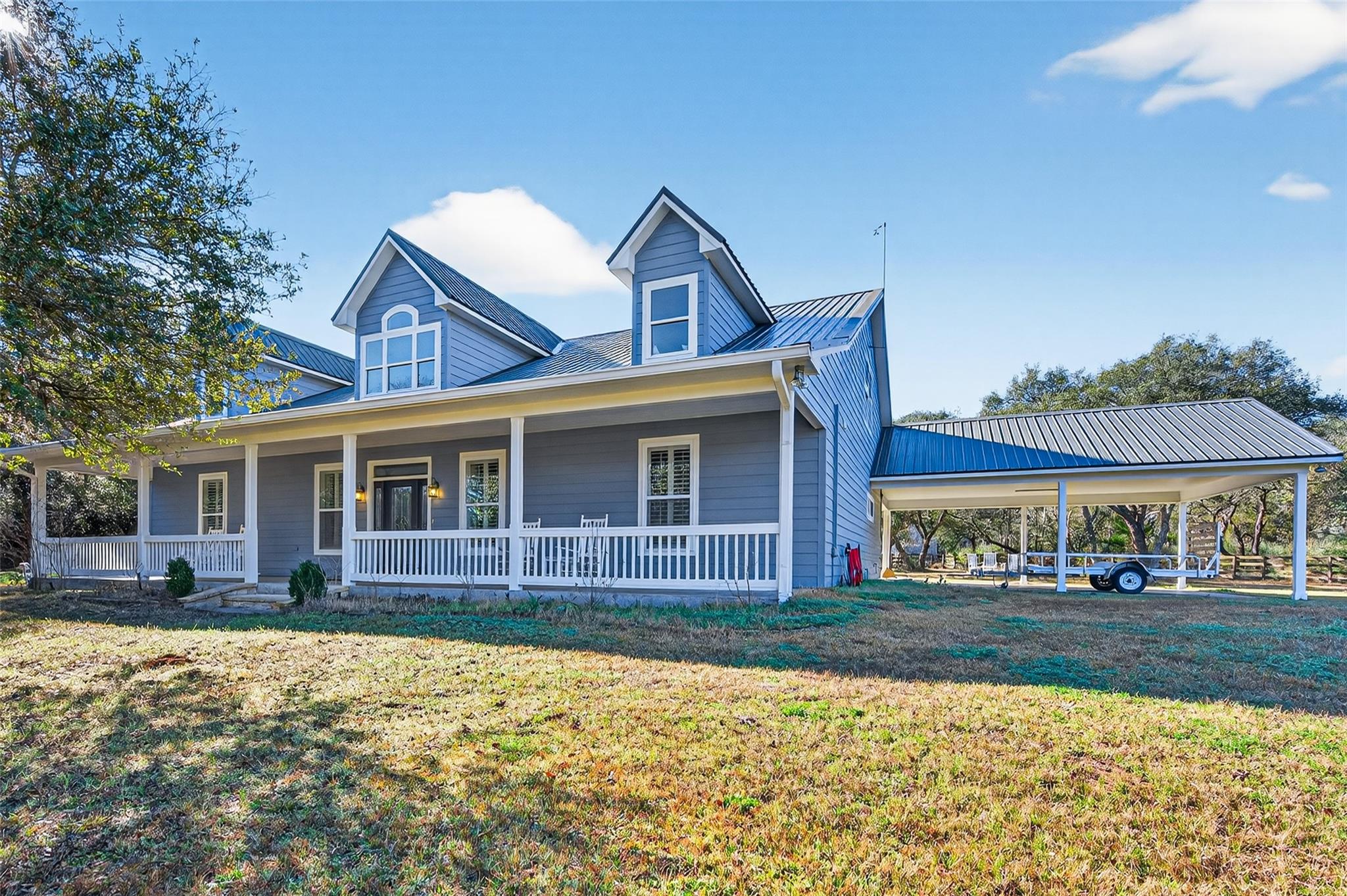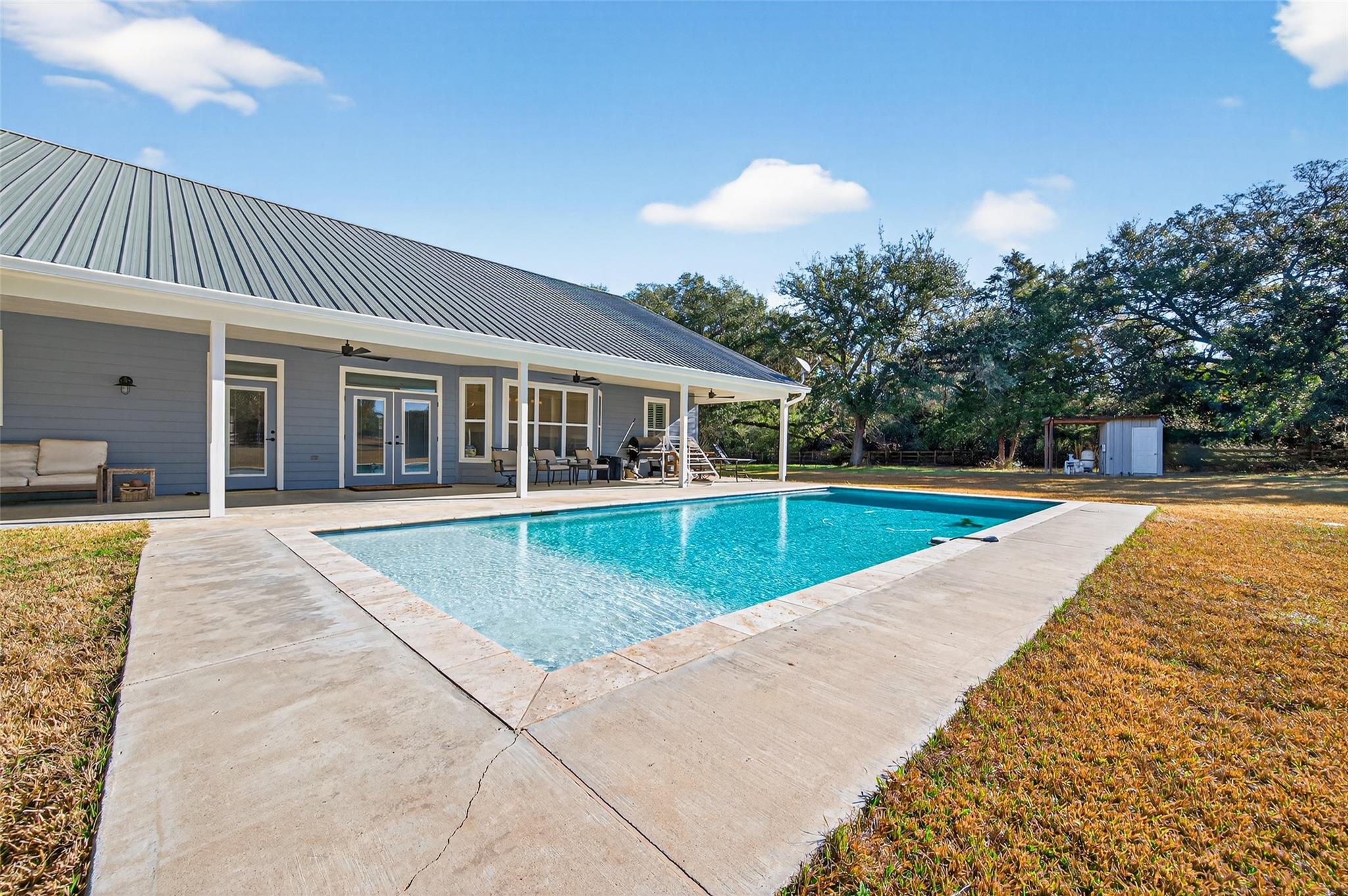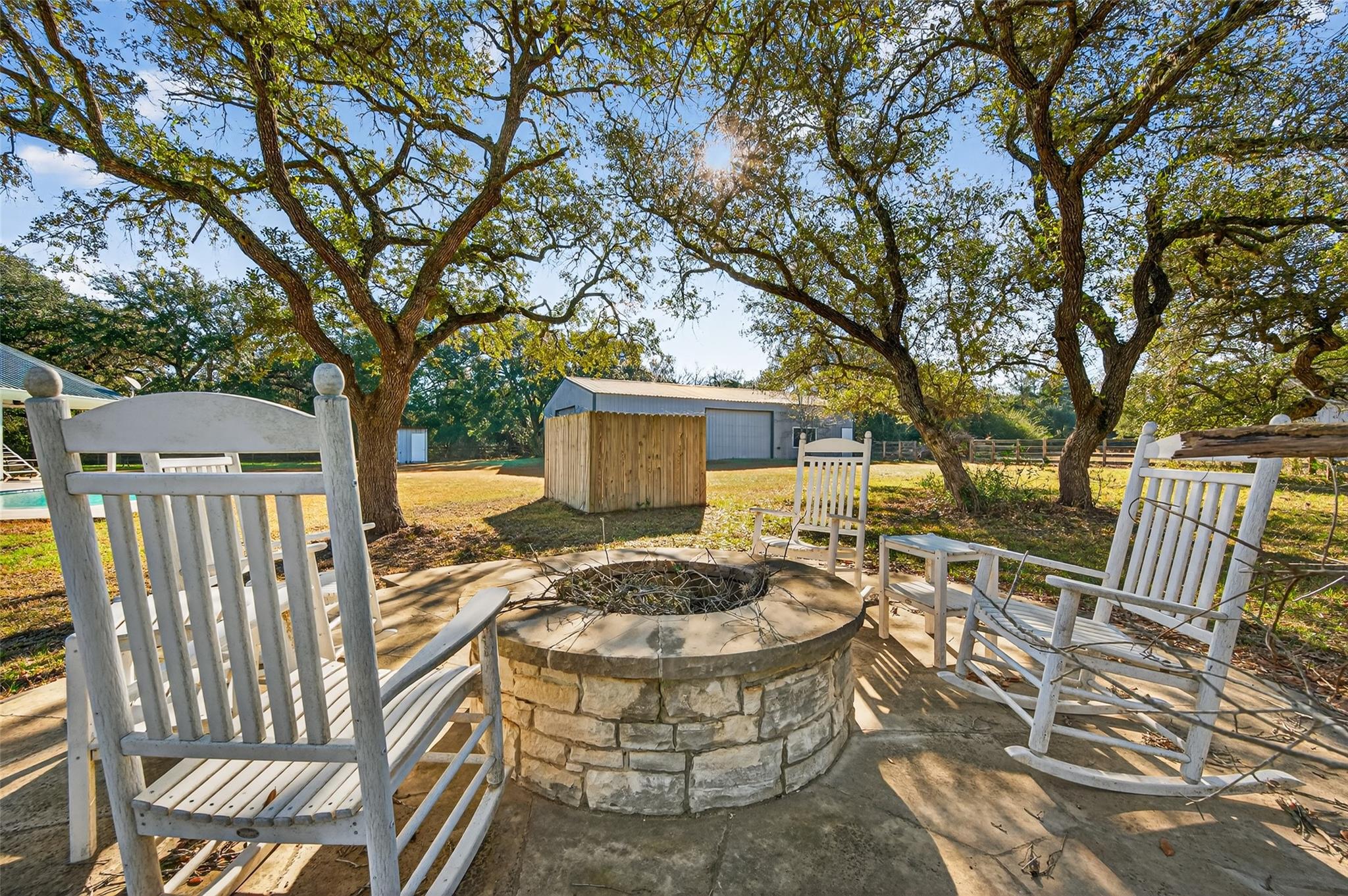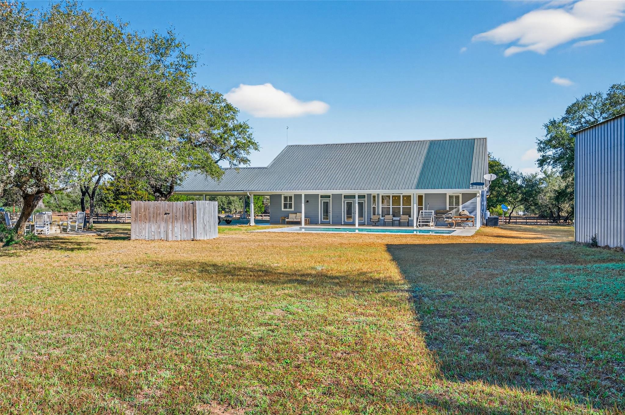 23.6 unrestricted acres in Cat Spring featuring a 3,549 SF farmhouse with private in-ground pool, barn, 2 horse stalls, cross fencing, workshop, PLUS barndominium-style full guest quarters, in addition to listed sq ft! Built in 2009, this home offers open-concept living, breakfast bar, 3 bedrooms downstairs including primary suite with double sinks, separate shower, vanity area, and walk-in closets. Upstairs is built to impress with 8 built-in bunk beds, full bath including 2 showers, urinals, second kitchenette, and second laundry room (with bonus secret room!) —ideal for large gatherings or multi-use living. Attached 2-car carport, gated driveway, 2 water wells, septic, central electric HVAC, ag exemption in place. Horses allowed. Cleared pasture and wooded acreage. No restrictions.