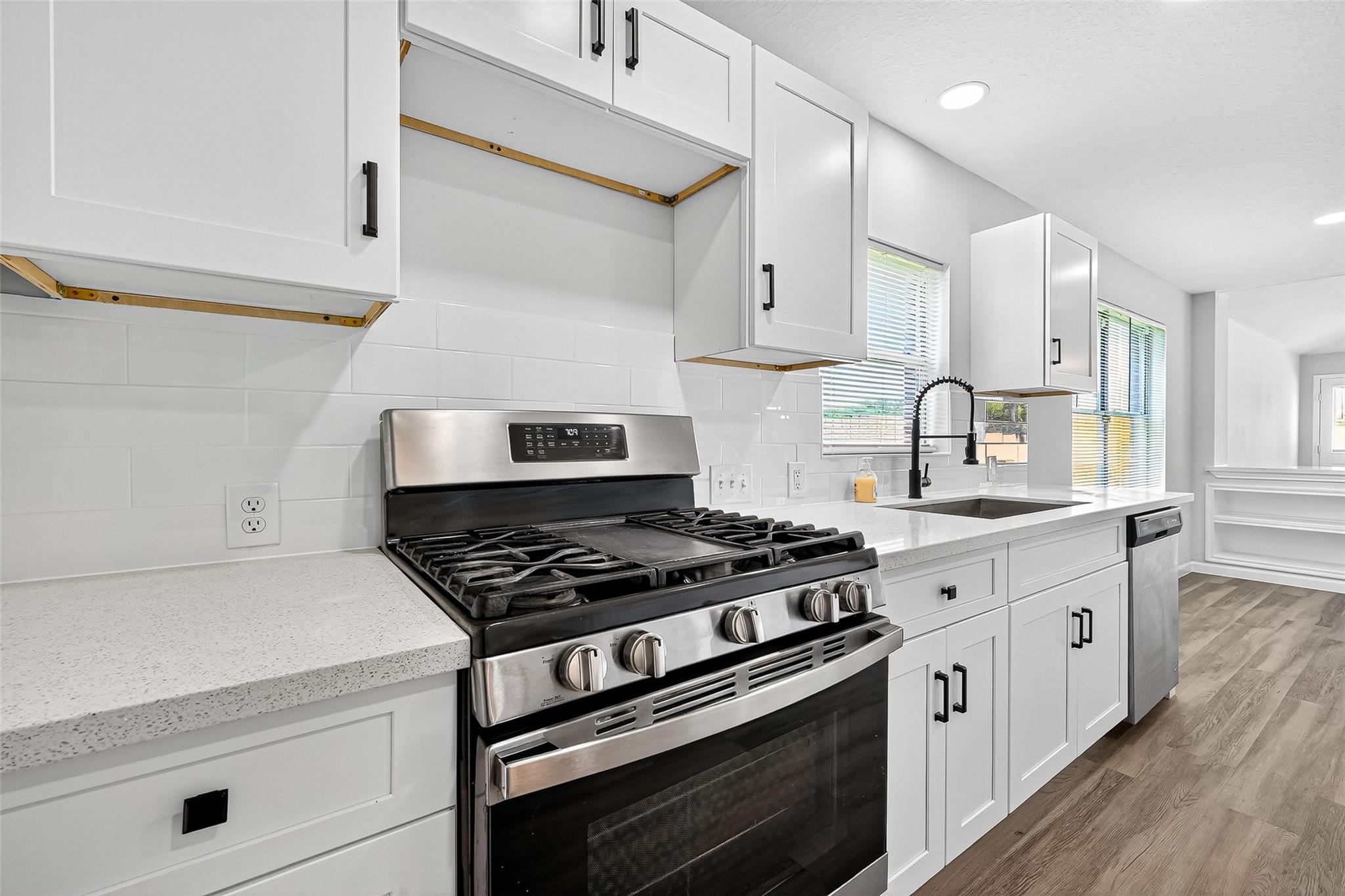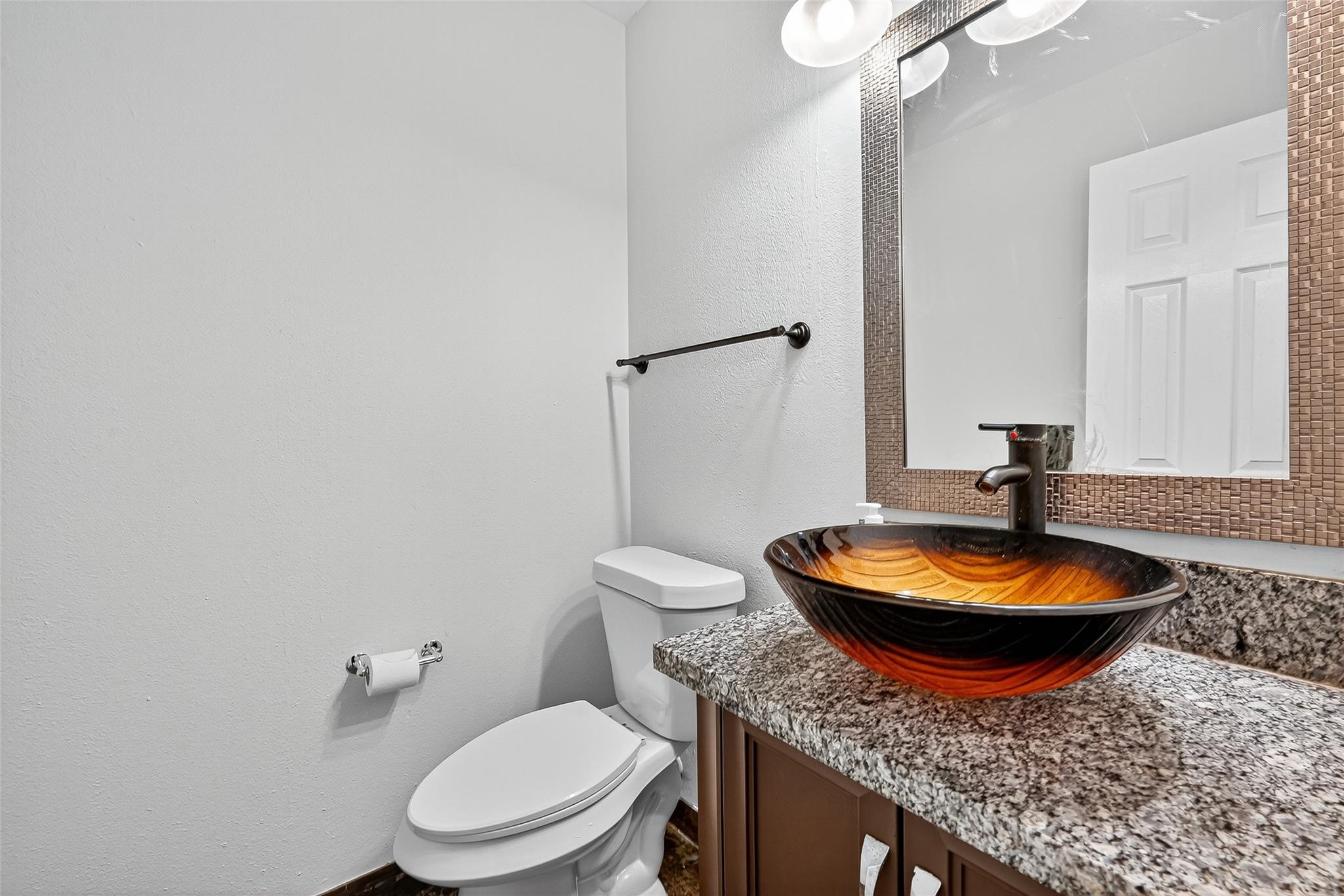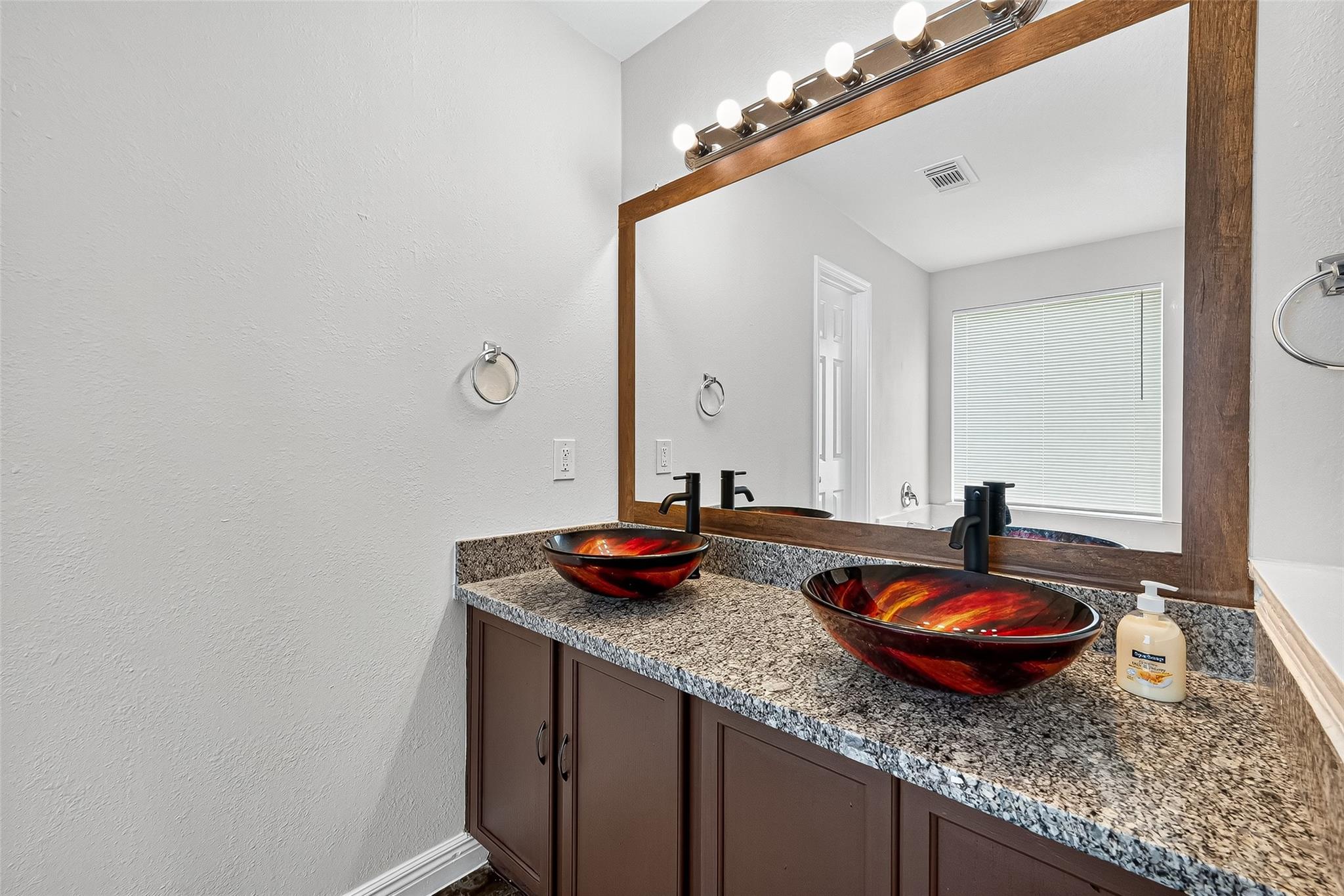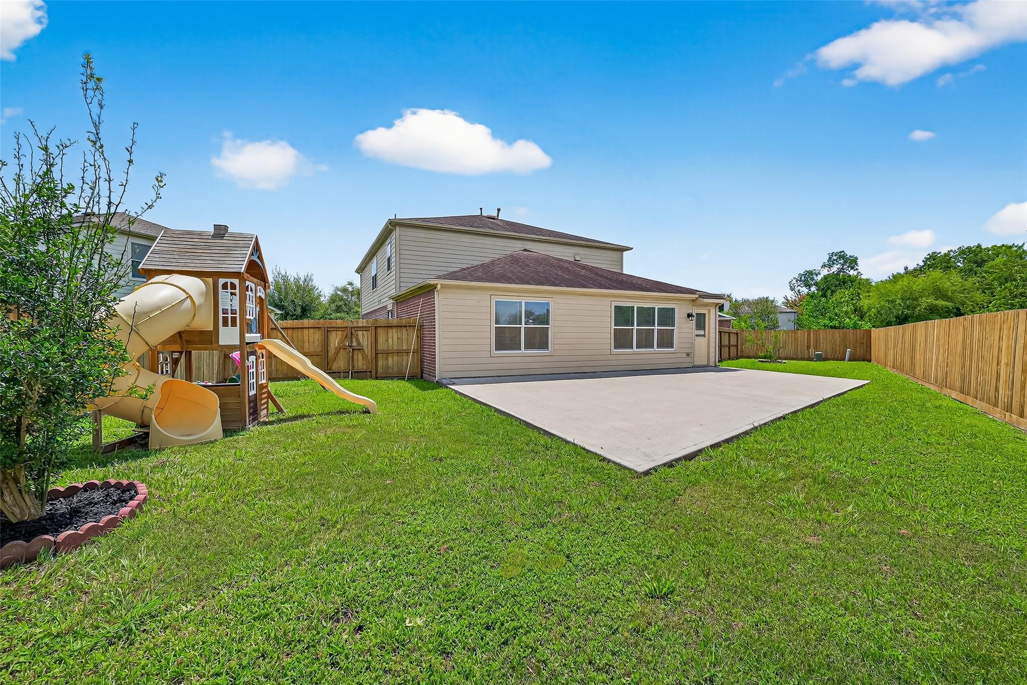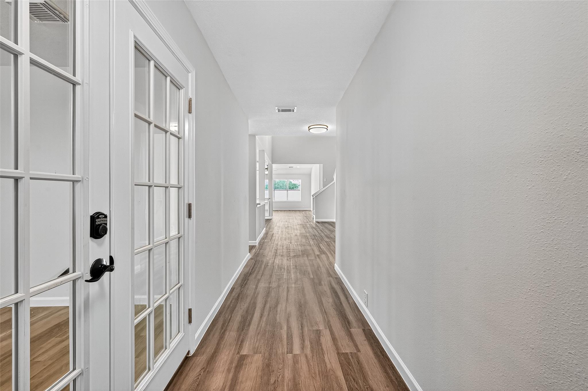 Beautifully updated home in Sugar Grove, tucked away on a quiet cul-de-sac with no back neighbors and a huge backyard. This move-in ready property features new vinyl flooring downstairs, a completely renovated kitchen with brand-new quartz countertops, modern backsplash, and new cabinets. The spacious primary suite is on the main floor with a soaking tub, separate shower, and dual sinks. Upon entry, a formal sitting room with French doors offers flexibility for an office or study. Upstairs includes three bedrooms, a large game room, a study nook with built-in shelves, and a full bath. Roof replaced in 2020. Zoned to top-rated FBISD schools and conveniently close to Hwy 6, shopping, dining, and parks. Enjoy space, privacy, and style in this exceptional home! Room dimensions are approximated!