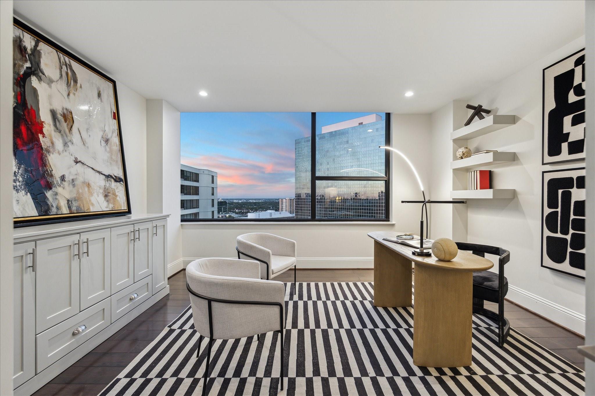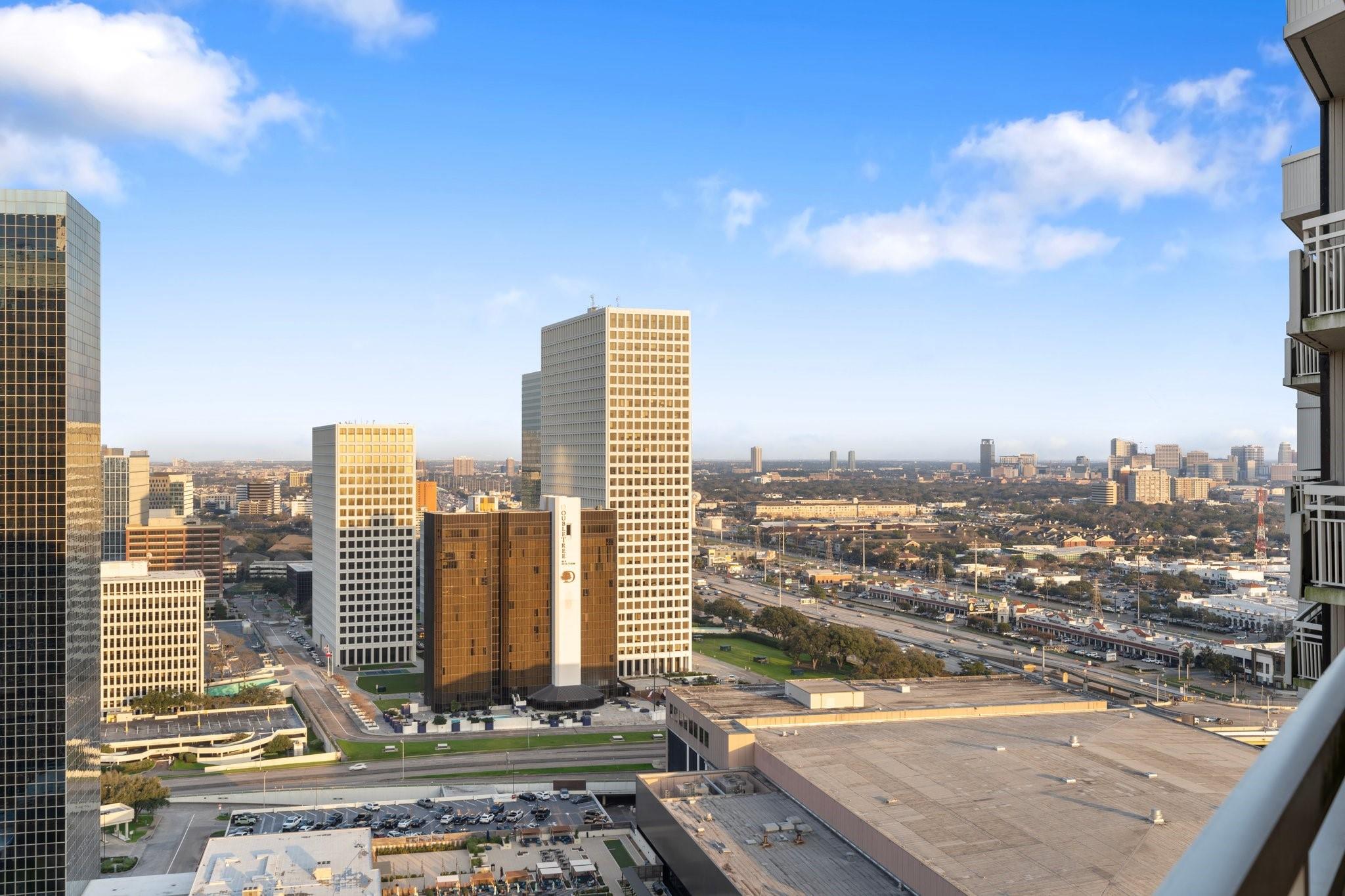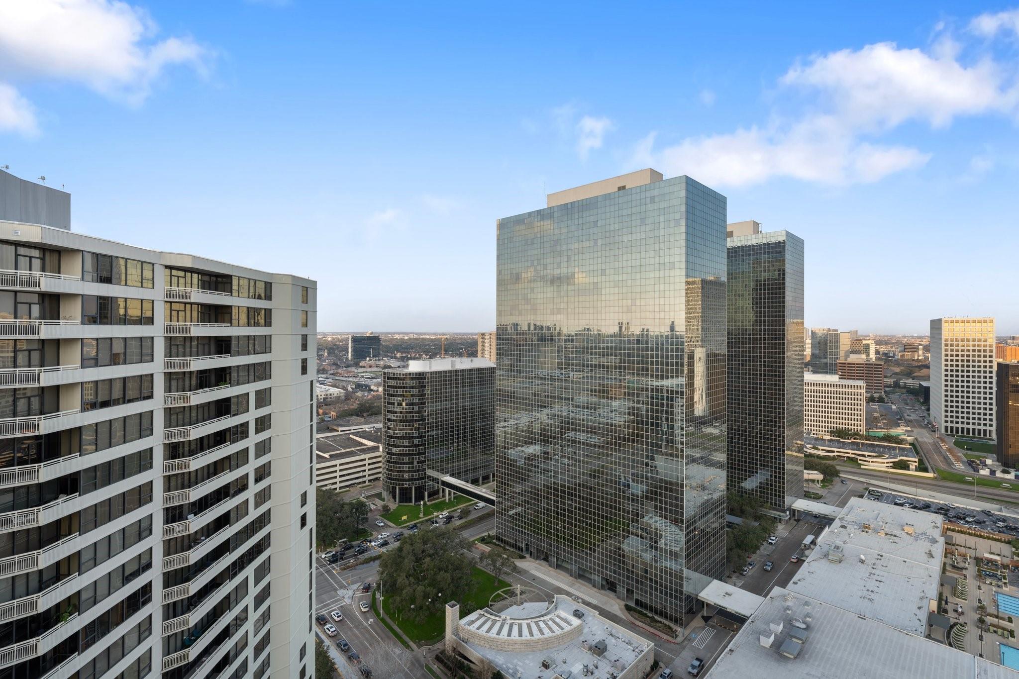 Renovated 29th floor penthouse offering expansive living areas and premium quality finishes. Open kitchen with custom cabinetry, Thermador appliances, Quartz counters and generous storage. Beautiful hardwood floors, custom millwork, designer lighting, automatic window blinds, two private balconies and sweeping views of the Galleria skyline and Greenway Plaza. Primary suite with a wall of built-in cabinetry, renovated bathroom with marble surround soaking tub, sit down vanity, walk-in closet and separate cedar closet. Second bedroom with office nook. Guest bathroom with steam shower. Dry bar with wine refrigerator, walk-in laundry room with generous storage. Full service high rise living with doorman, valet, porter, 24 hour security and heated pool. Convenient location within close proximity to shopping, dining, the Texas Medical Center, Downtown and the Galleria.