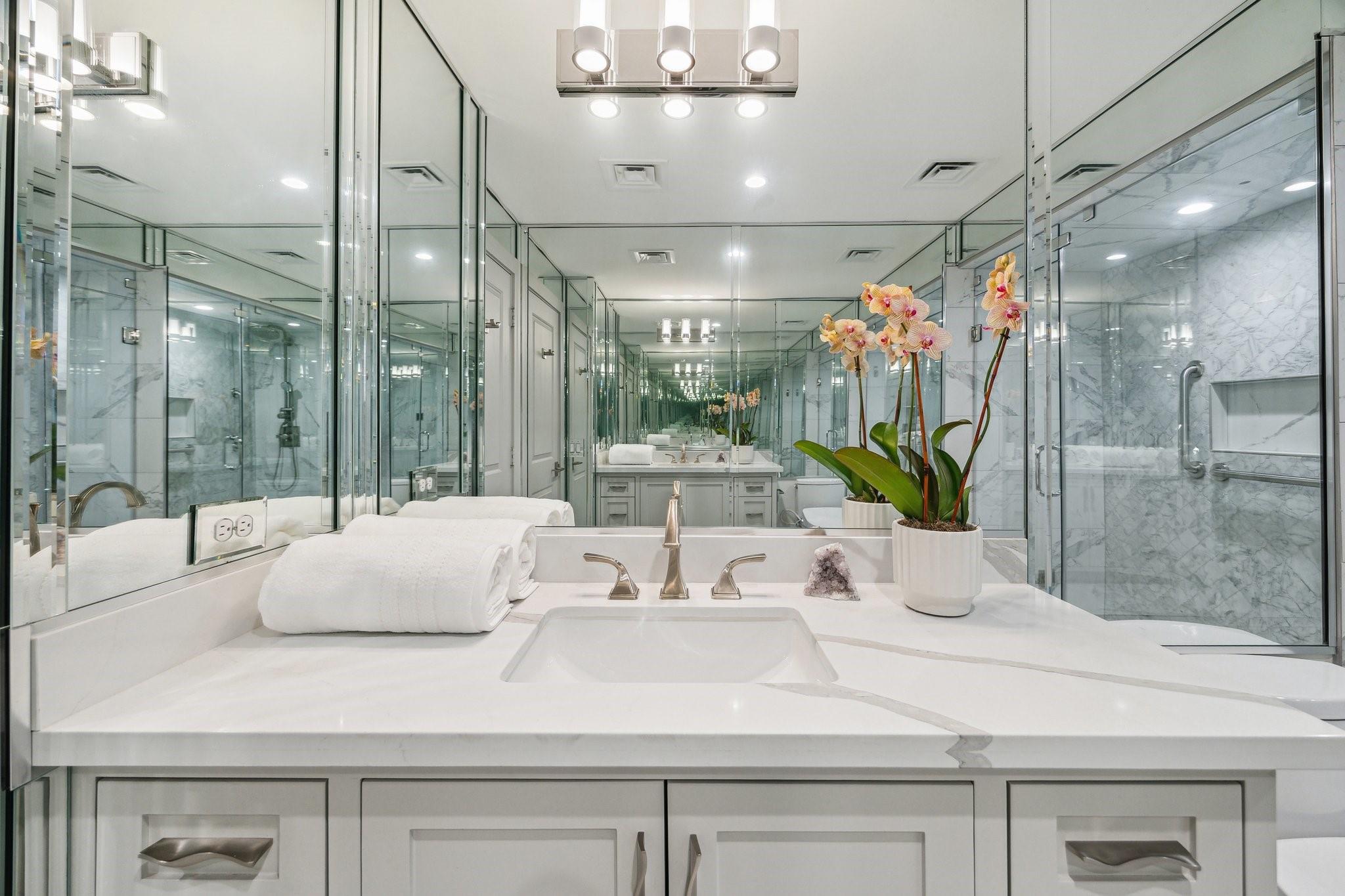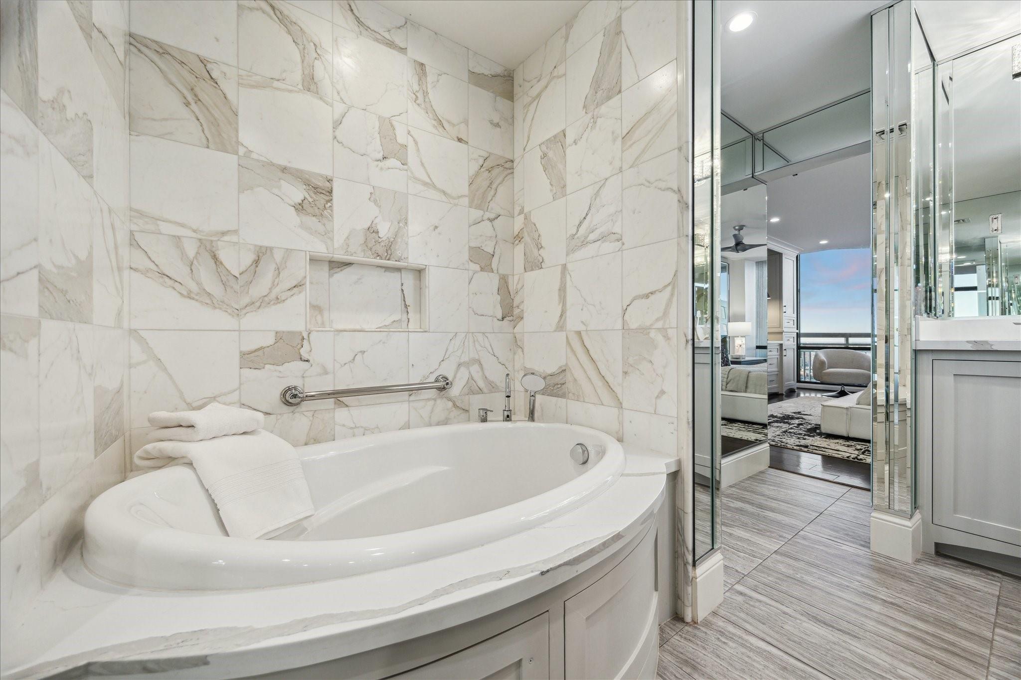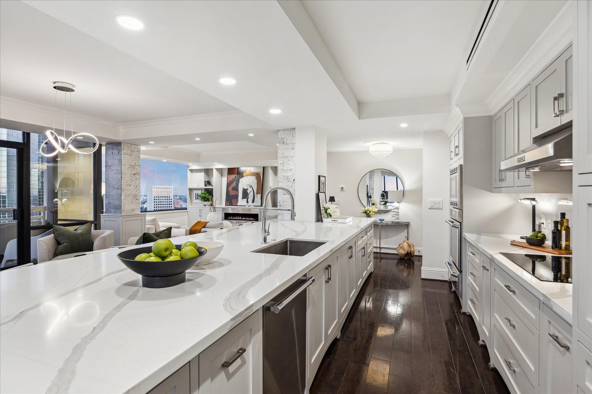 Renovated 29th floor penthouse offering expansive living areas and premium quality finishes. Open kitchen with custom cabinetry, Thermador appliances, Quartz counters and generous storage. Beautiful hardwood floors, custom millwork, designer lighting, automatic window blinds, two private balconies and sweeping views of the Galleria skyline and Greenway Plaza. Primary suite with a wall of built-in cabinetry, renovated bathroom with marble surround soaking tub, sit down vanity, walk-in closet and separate cedar closet. Second bedroom with office nook. Guest bathroom with steam shower. Dry bar with wine refrigerator, walk-in laundry room with generous storage. Full service high rise living with doorman, valet, porter, 24 hour security and heated pool. Convenient location within close proximity to shopping, dining, the Texas Medical Center, Downtown and the Galleria.