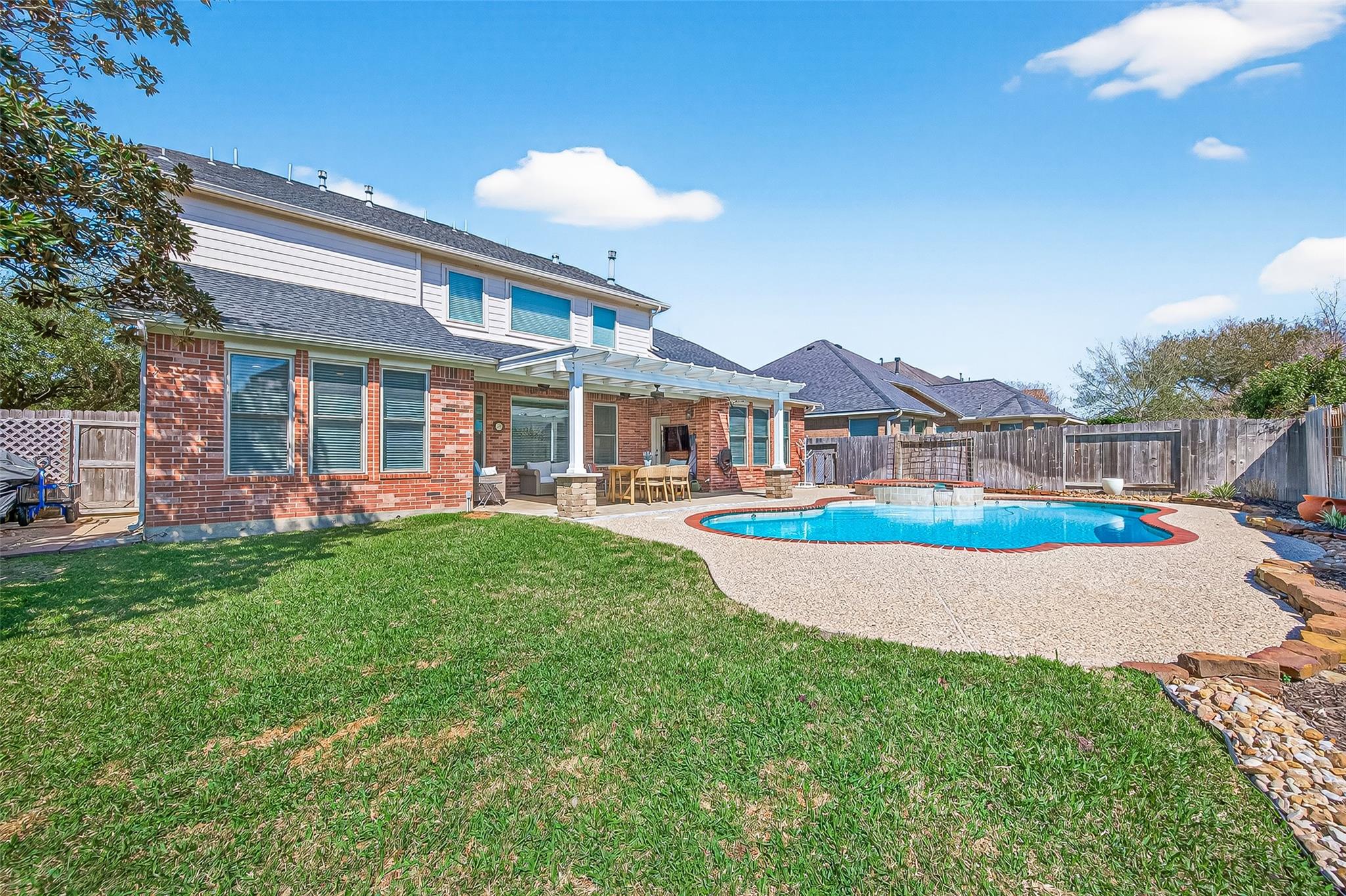ExteriorRoof:CompositionFoundation:SlabPrivate Pool:YesPrivate Pool Desc:Gunite,In GroundExterior Type:BrickLot Description:CornerWater Sewer:Water DistrictArea Pool:YesExterior:Back Yard Fenced,Covered Patio/Deck,Patio/Deck,Porch,Spa/Hot Tub,Sprinkler System
