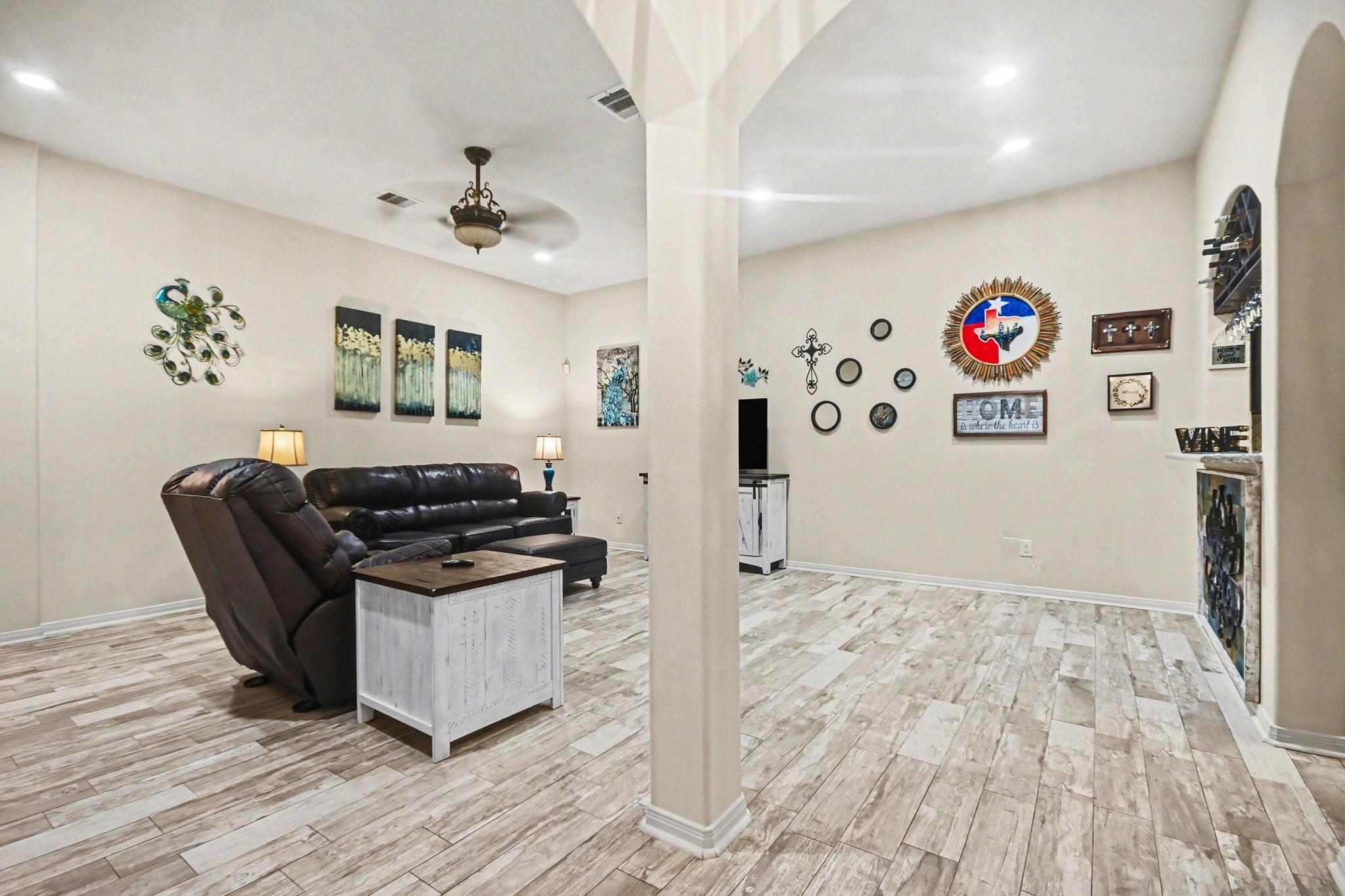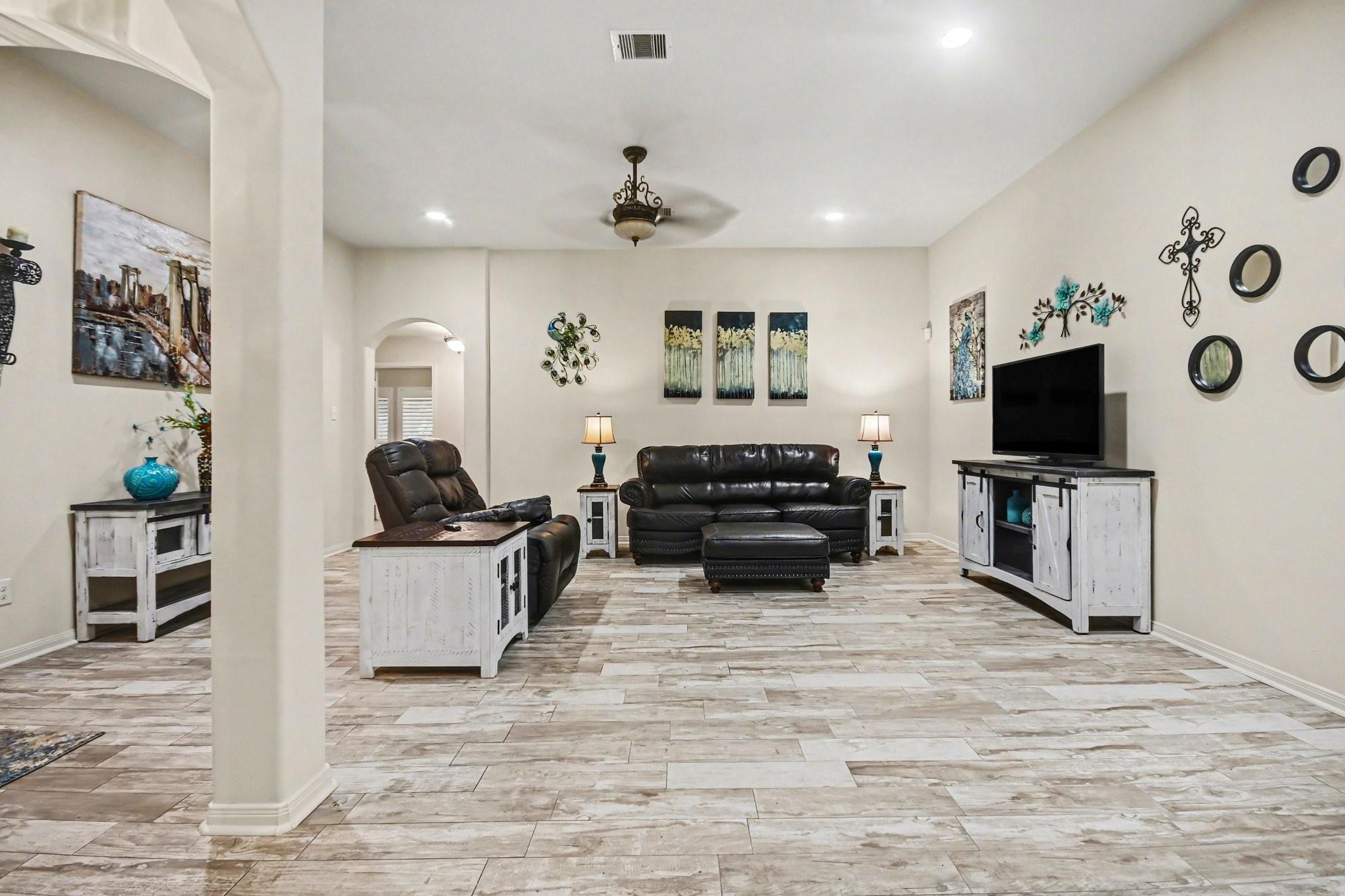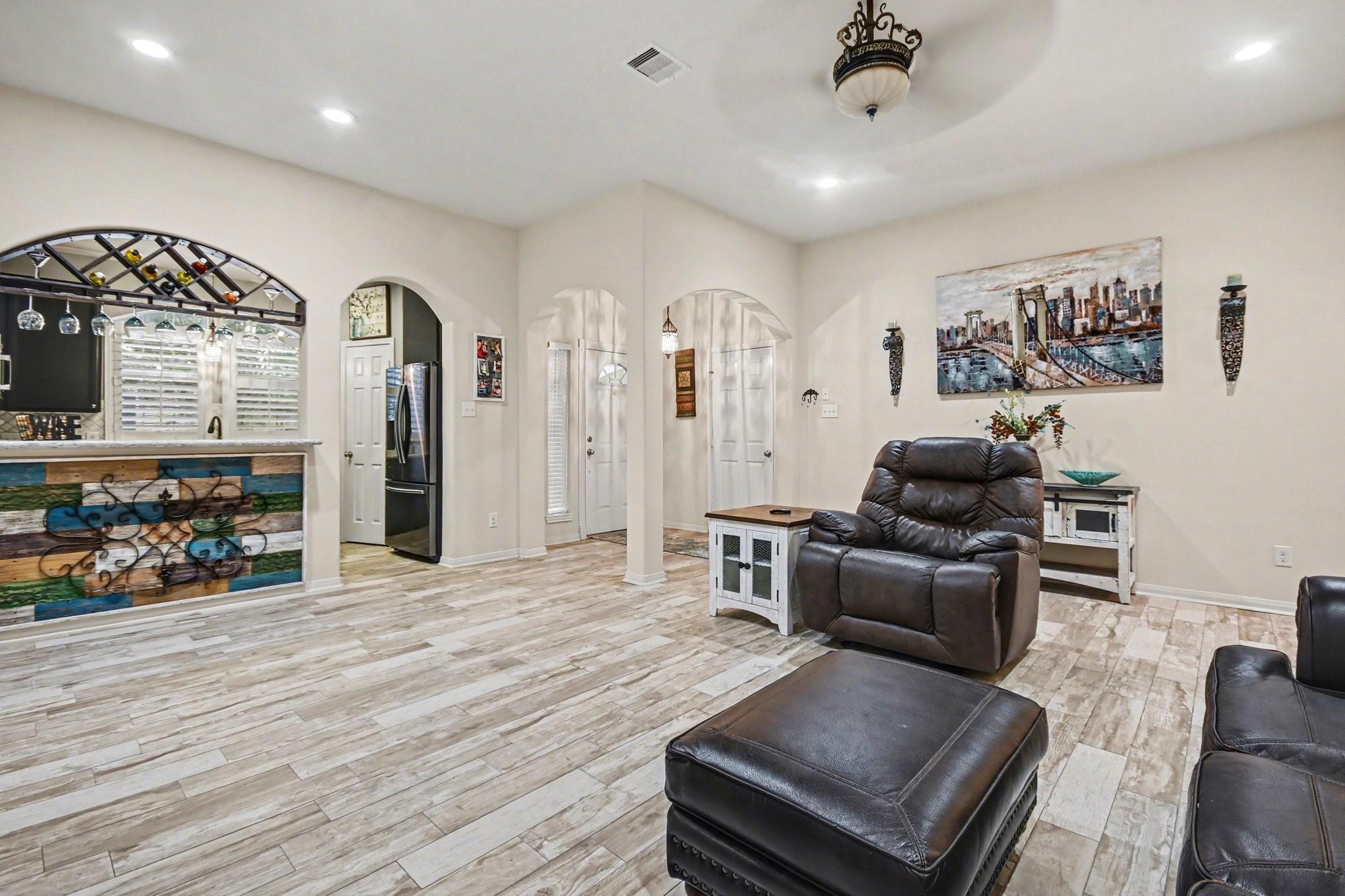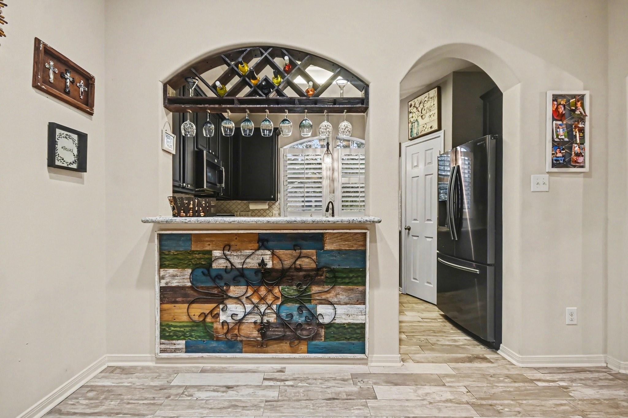 Charming one-story townhome hidden in a secluded area near Beltway 8, Hwy 3, and I-45*Step inside to an inviting layout with beautiful wood like tile, high ceilings, and elegant arched accents that add architectural character*The kitchen features gorgeous quartz countertops/backsplash, updated stainless steel appliances, stunning 42-inch wood cabinets, and a built-in wood wine/glass above the breakfast bar*The spacious primary suite includes a walk-in closet with a built-in safe and a connected, sizable bath of modern luxury*All led ceiling lights & fans have been updated*2025 40-year Roof*2024 High Efficiency A/C*Enjoy the convenience of an indoor laundry room and a 2-car garage for ample storage*Outside, unwind in your private backyard for relaxing or your favorite Texas barbecue*Solar screens help keep the home energy-efficient* Plantation shutters* SS Refrigerator For Sale Move-in ready, beautifully maintained, a must-see one-of-a-kind GEM! Call today for a private showing!