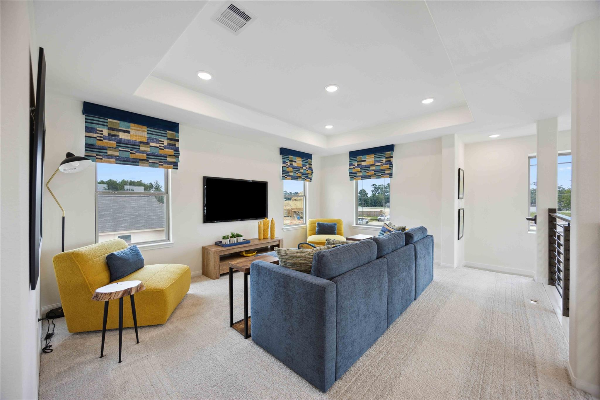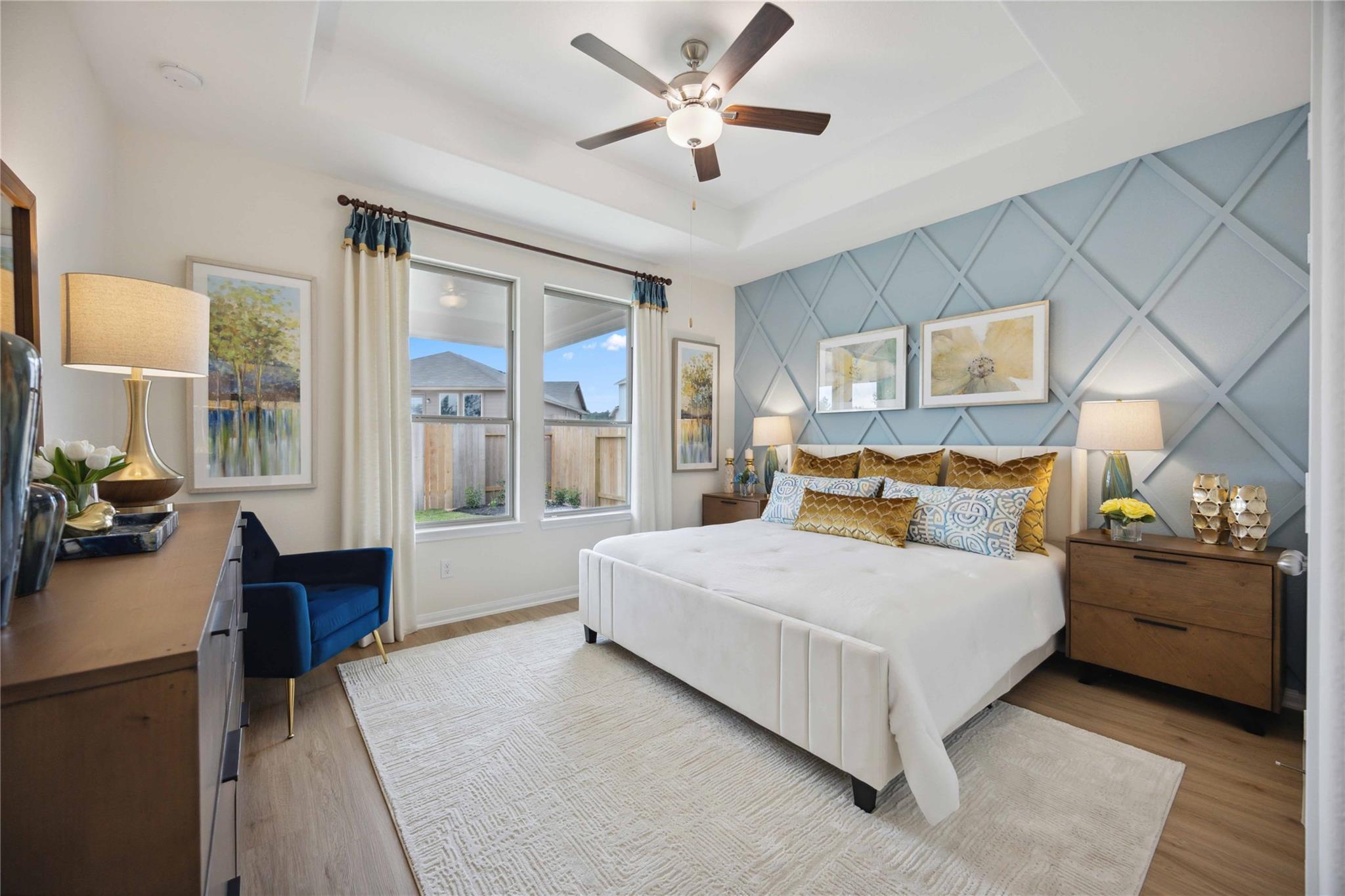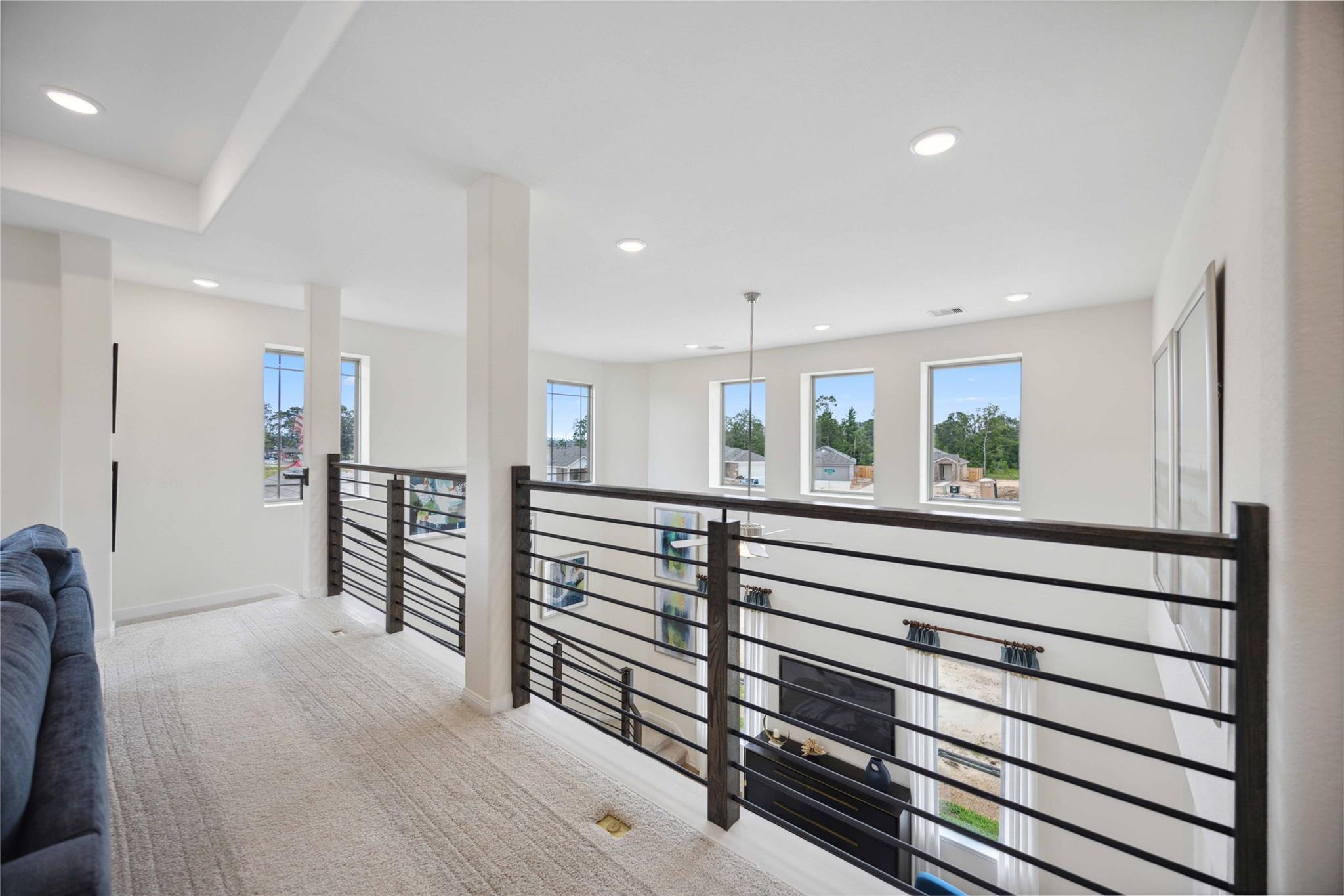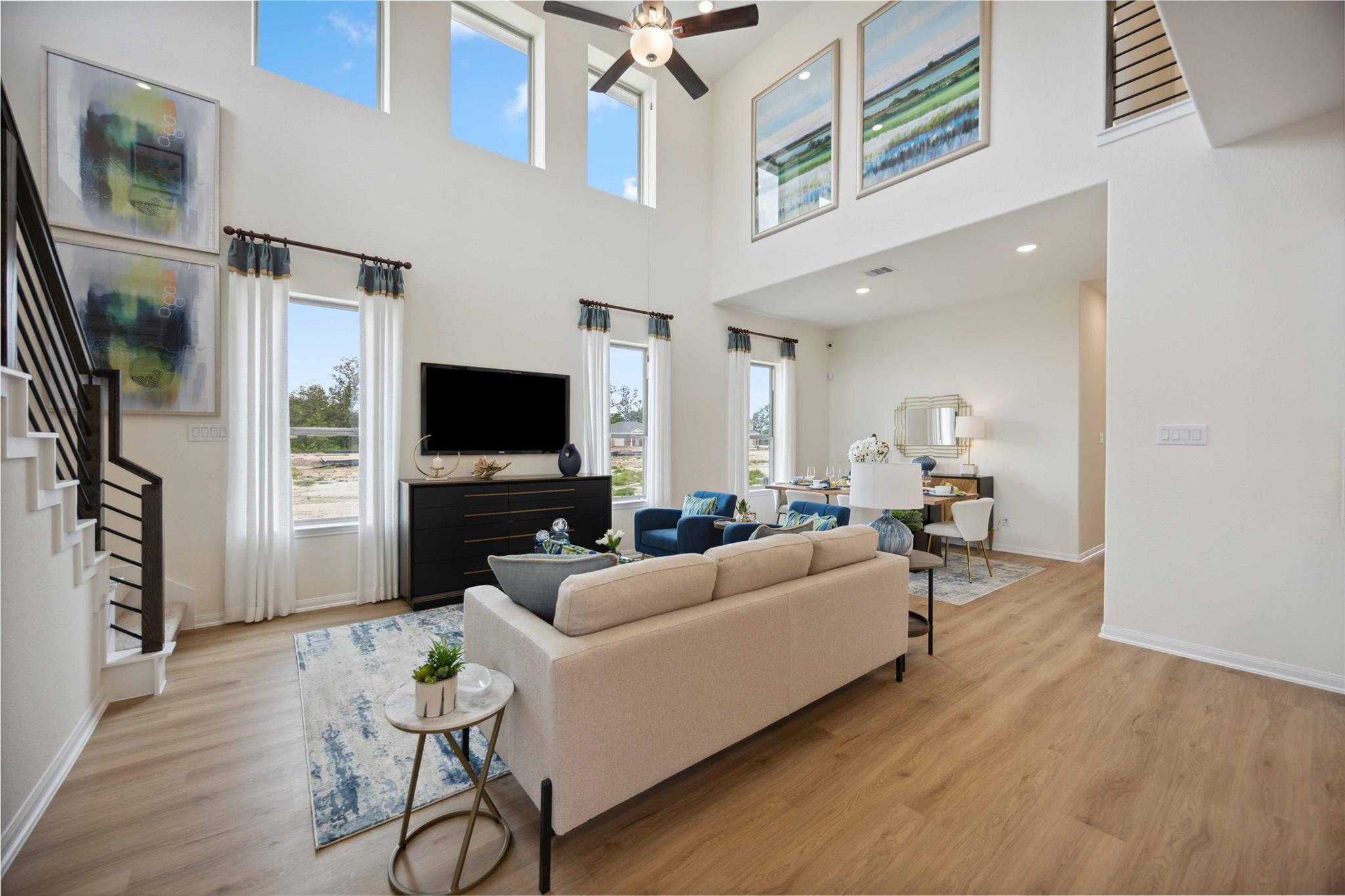 The Mansfield floorplan, designed with 2,416 square feet of thoughtfully designed living space highlighted by soaring 20-foot ceilings in the open family room. This 6-bedroom home includes two bedrooms downstairs, featuring a private owner's suite with a luxury bath offering a separate tib and shower, plus a walk-in closet. A second bedroom on the first floor sits conveniently near a full bath across the hall - perfect for guests or multi-generational living. Upstairs, a versatile gameroom with contemporary iron railing overlooks the living area, creating an open and connected feel. The kitchen showcases granite countertops and flows seamlessly into family room for easy entertaining. Luxury vinyl plank and carpet flooring, an extended covered patio, front yard sprinkler system, and a spacious 2.5-car garage add comfort and convenience. Enjoy small-town charm with quick access to US-59/i-69 and nearby shopping and dining.
