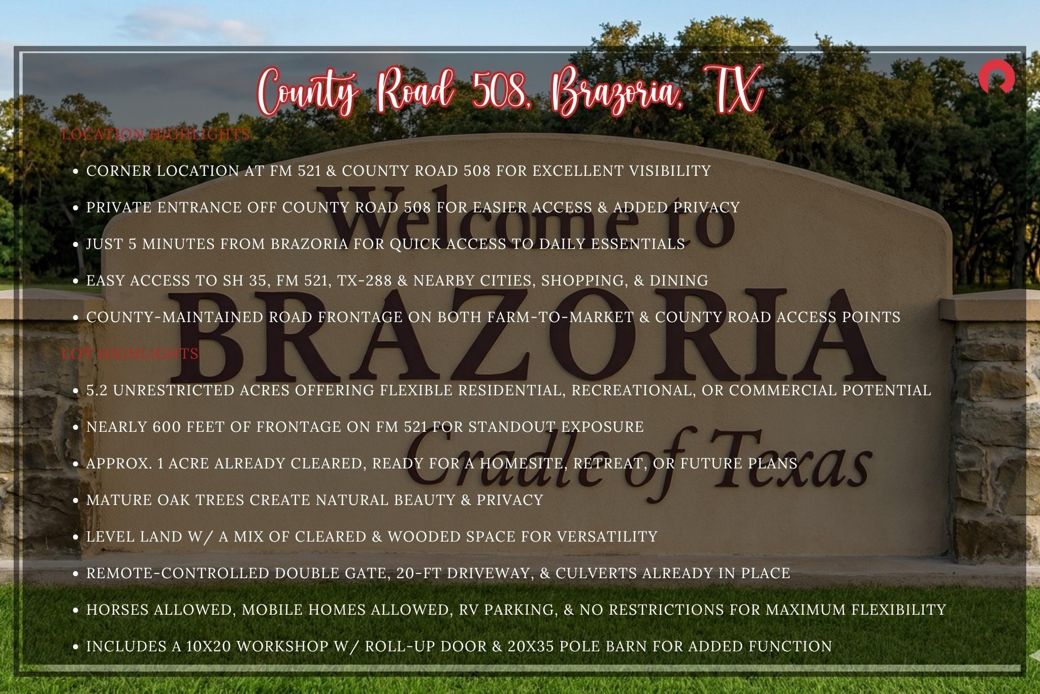 Endless potential awaits on 5.2 unrestricted acres in Brazoria, offering a rare chance to create a private homesite, weekend retreat, or future commercial venture in a highly visible corner location. This property features nearly 600 ft of frontage along FM 521, a private entrance off County Road 508, an acre of cleared land, mature oak trees, level terrain, culverts already in place, & a remote-controlled double gate on a 20-ft driveway for added convenience. Existing improvements include a 10x20 shop w/ roll-up door, 20x35 pole barn, mail delivery already set up, plus space for horses, mobile homes, RV parking, or additional expansion. Located just minutes from Brazoria near SH 36, w/ access toward SH 35 & TX-288, this is a great opportunity for someone seeking flexibility, visibility, privacy, & room to grow in a fast-moving Brazoria County area. Lot size, unrestricted use, road frontage, & location make this one stand out.