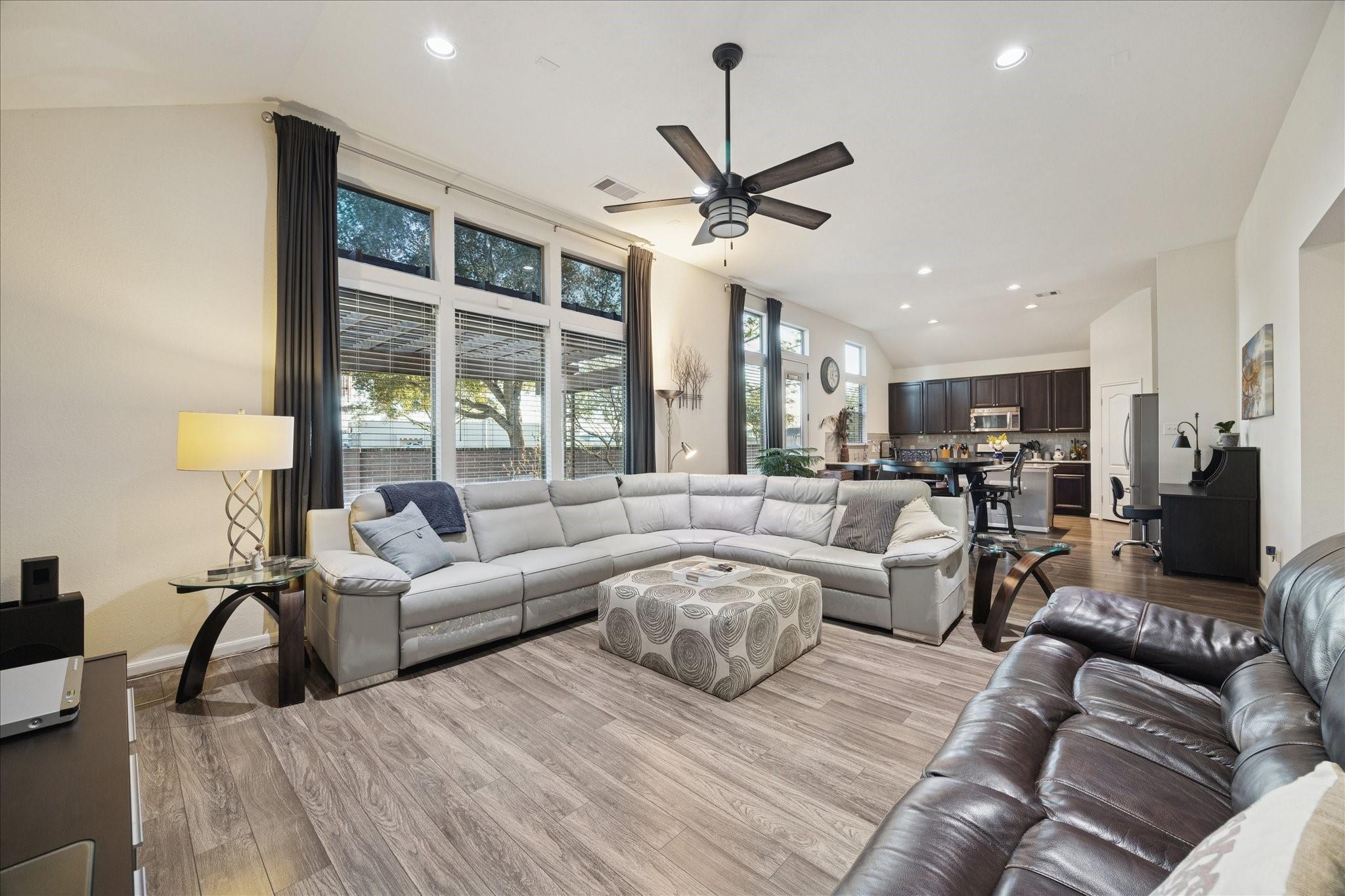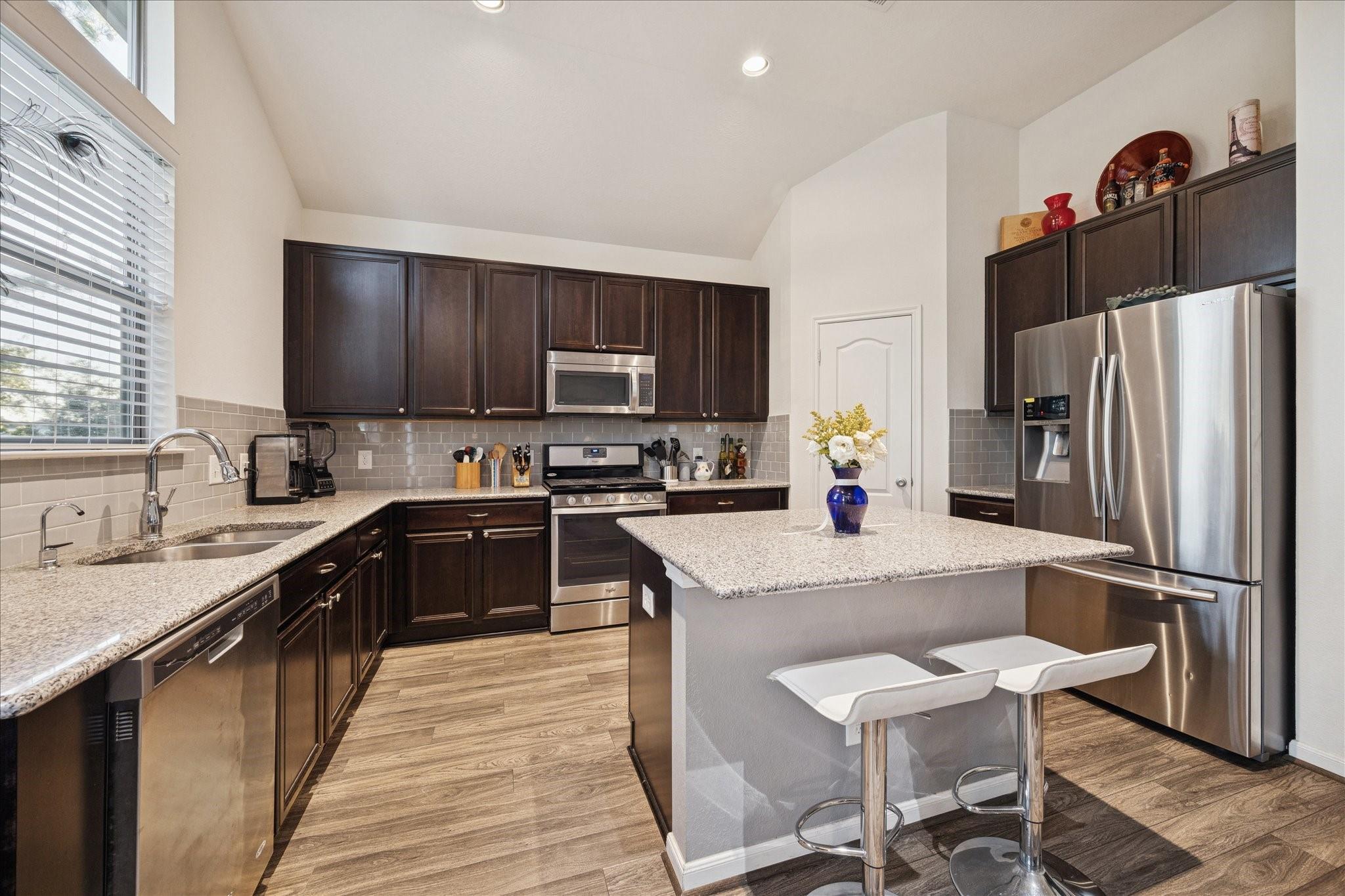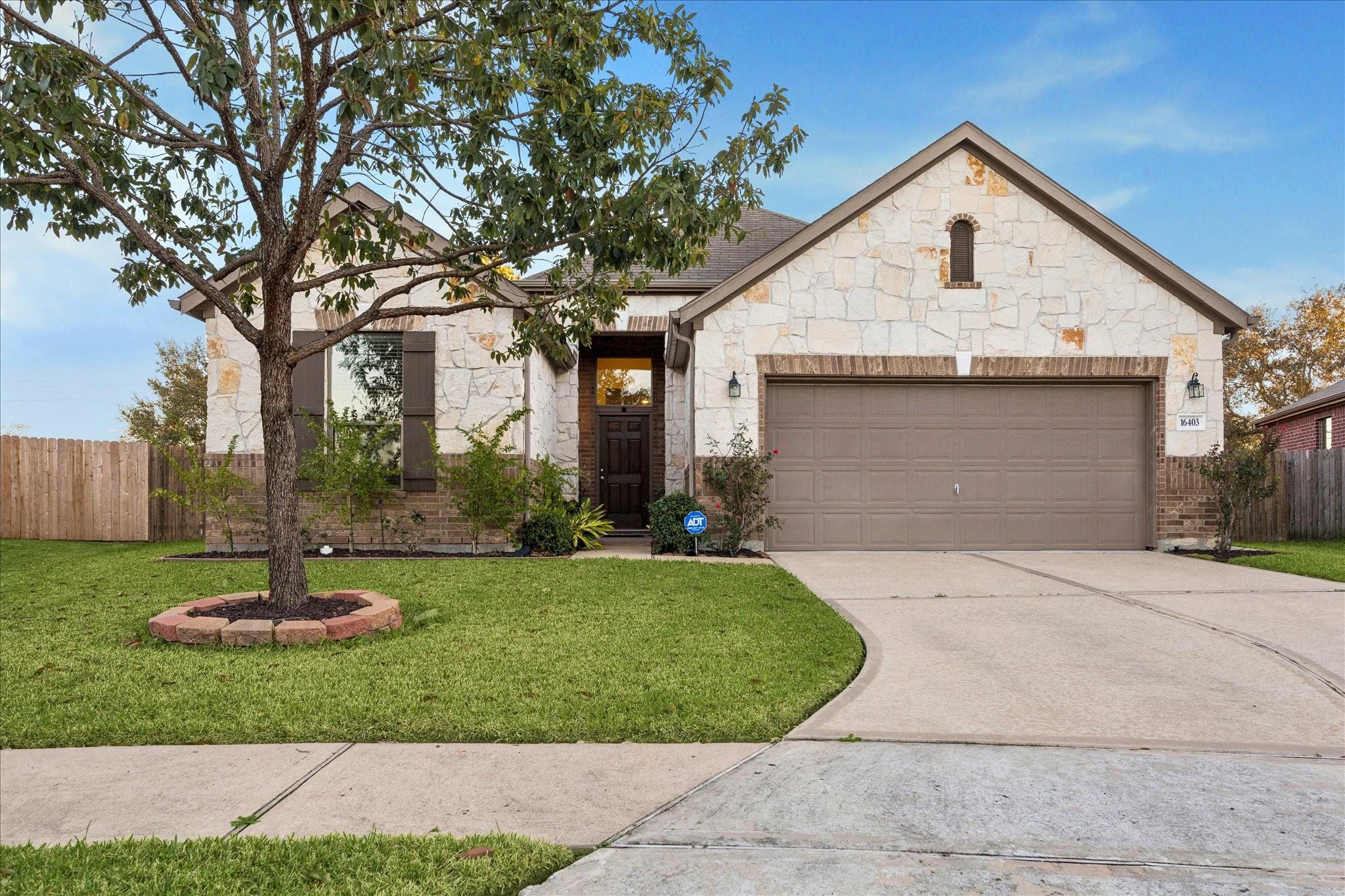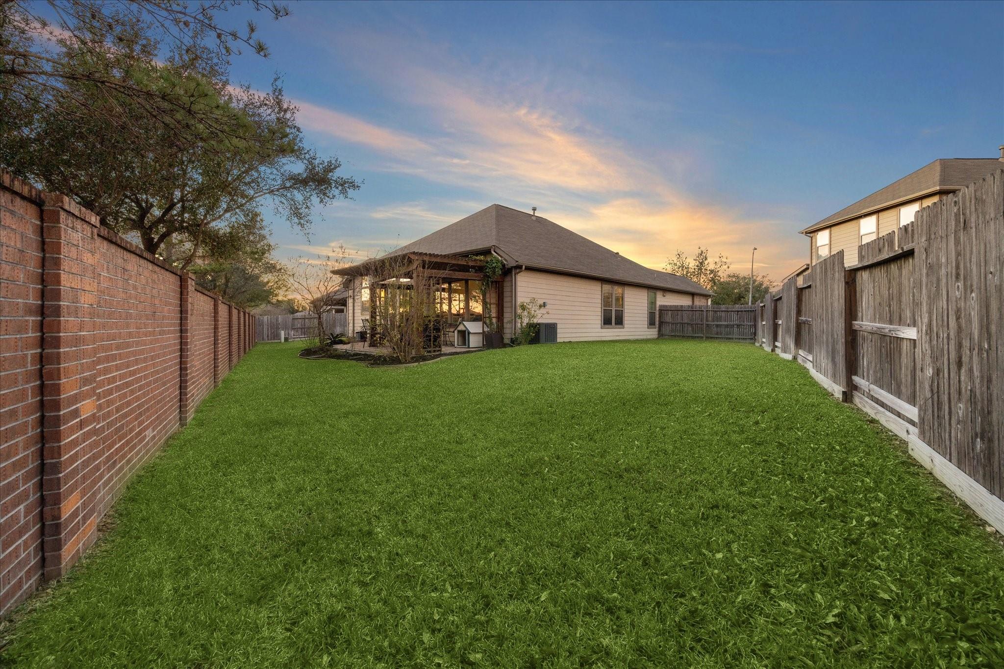 1 story home on an oversized lot in Berkshire Oaks with welcoming curb appeal. Lightly lived in, open concept living and kitchen with high ceilings, 2-inch blinds and low maintenance laminate flooring. Island kitchen with breakfast seating, granite countertops, undermount double sink, subway tile backsplash and stainless Whirlpool appliances. Open but separate formal dining room. Split floor plan. Primary bedroom features neutral colors and a coffered ceiling. Primary bath with dual undermount sinks, walk in shower with built-in seat and large walk-in closet. This home is wired for both sound and security. Fully fenced yard with front and back sprinkler system. Whole house water softener/conditioner! Reverse Osmosis Water Filter in Kitchen. Exterior gutters on all four sides. Stamped concrete back patio with beautiful pergola cover. Recent HVAC (11/2024) Perfect starter home or for someone downsizing. This one won't last, schedule your Tour Today!
