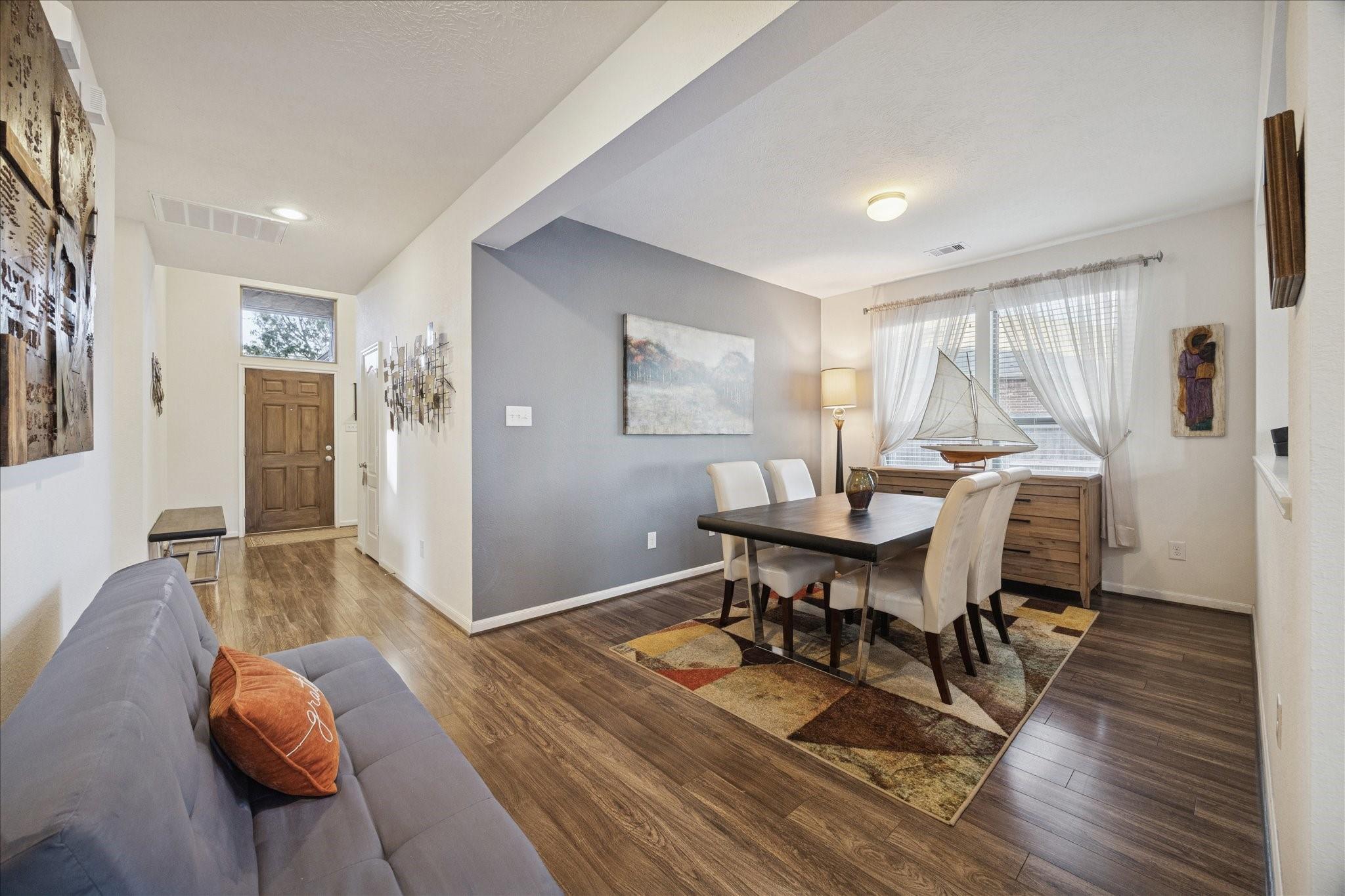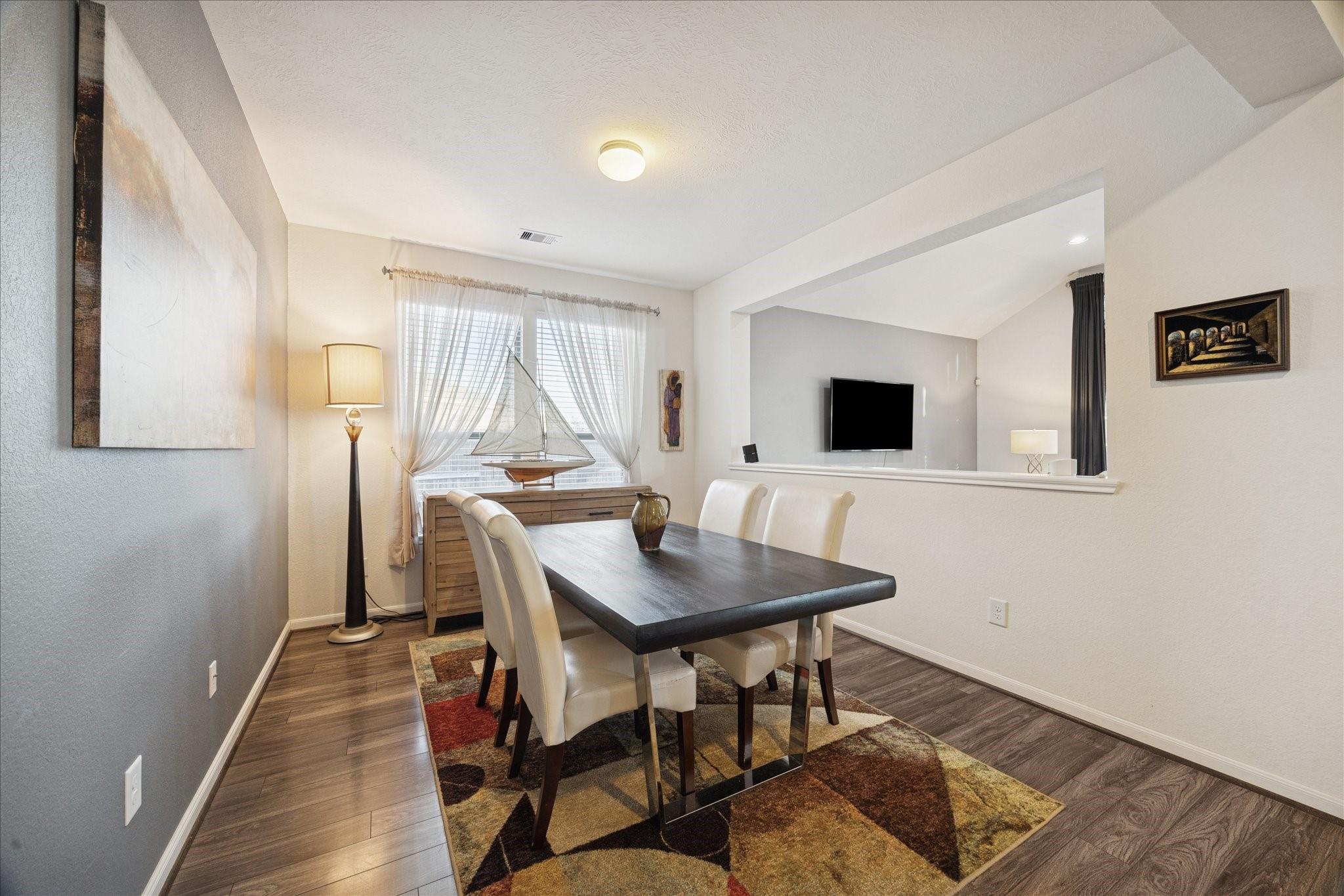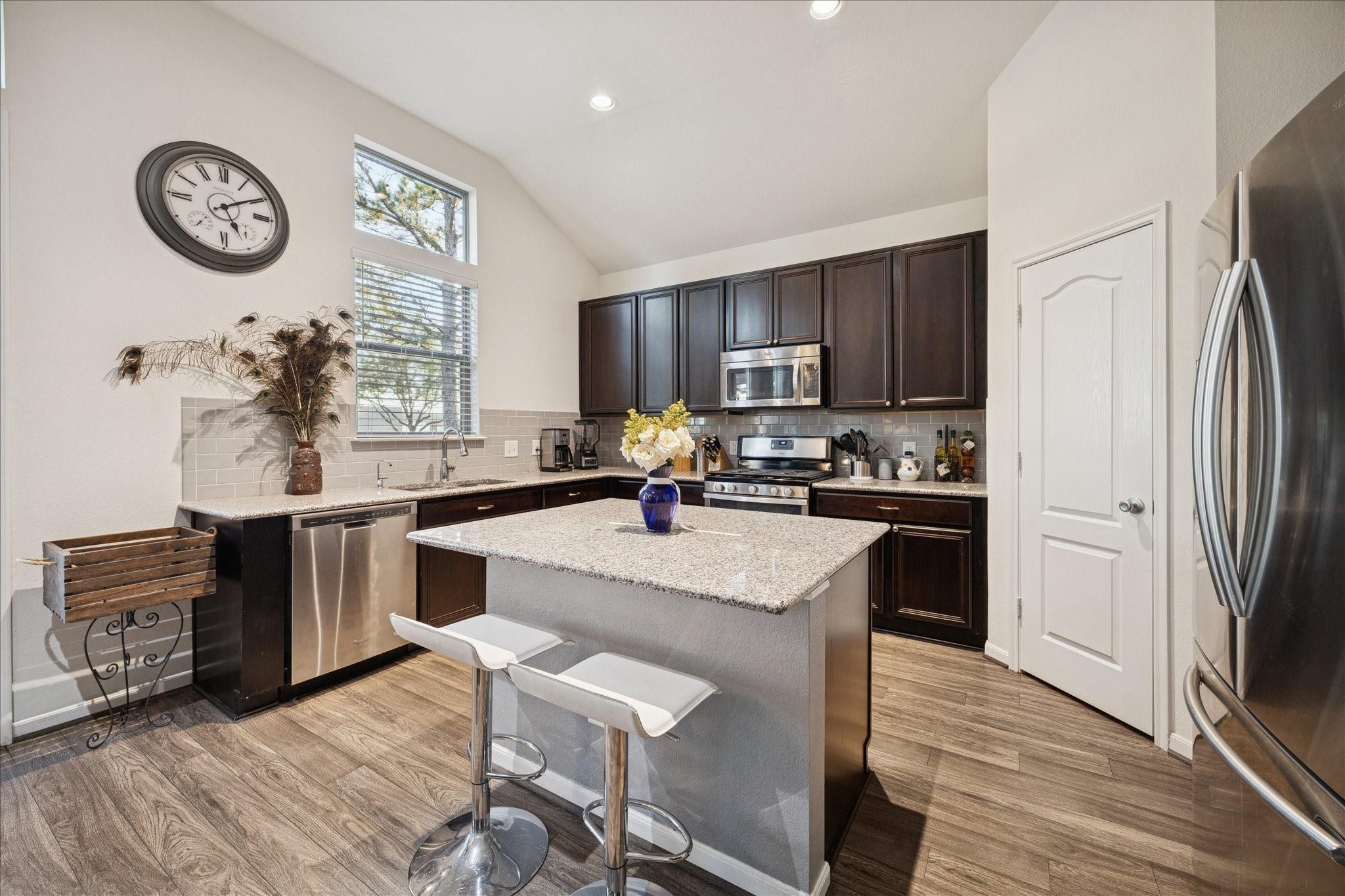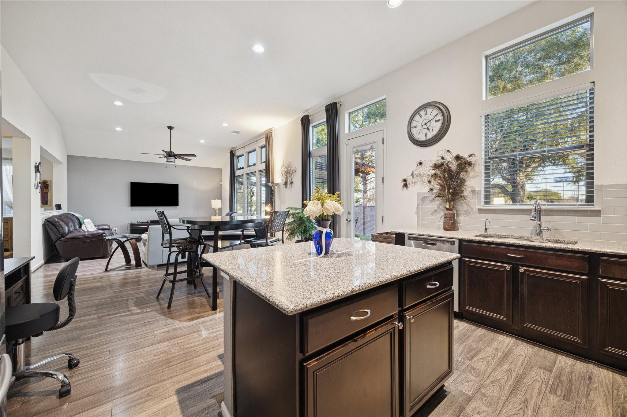 1 story home on an oversized lot in Berkshire Oaks with welcoming curb appeal. Lightly lived in, open concept living and kitchen with high ceilings, 2-inch blinds and low maintenance laminate flooring. Island kitchen with breakfast seating, granite countertops, undermount double sink, subway tile backsplash and stainless Whirlpool appliances. Open but separate formal dining room. Split floor plan. Primary bedroom features neutral colors and a coffered ceiling. Primary bath with dual undermount sinks, walk in shower with built-in seat and large walk-in closet. This home is wired for both sound and security. Fully fenced yard with front and back sprinkler system. Whole house water softener/conditioner! Reverse Osmosis Water Filter in Kitchen. Exterior gutters on all four sides. Stamped concrete back patio with beautiful pergola cover. Recent HVAC (11/2024) Perfect starter home or for someone downsizing. This one won't last, schedule your Tour Today!