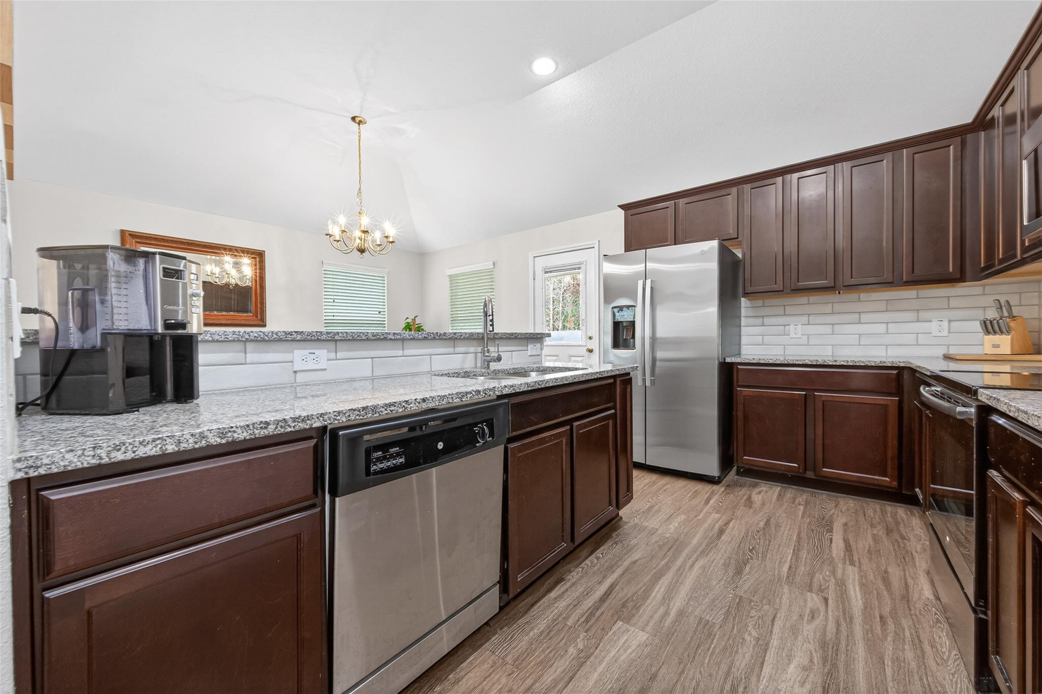 Welcome to this beautiful 2019 brick home in the deed-restricted Kirby Woods subdivision. Situated on a fully fenced 1/3+ acre corner lot, this property features a gated driveway and side yard access with space for RV or camper parking, plus RV hookups. The home offers 4 bedrooms, 2 full baths, and a 2-car garage. Inside, you’ll find a spacious open living and dining area that flows into the kitchen, highlighted by vaulted ceilings and luxury vinyl plank flooring in the main living areas. The oversized primary suite includes a soaking tub, separate shower, double sinks, private toilet area, and walk-in closet. Three additional bedrooms share a well-appointed bath. Enjoy the convenience of an indoor laundry room and a covered back porch just off the kitchen. The enormous backyard includes a storage building and plenty of space to relax or entertain. Enjoy this peaceful country setting with the convenience of town just minutes away.