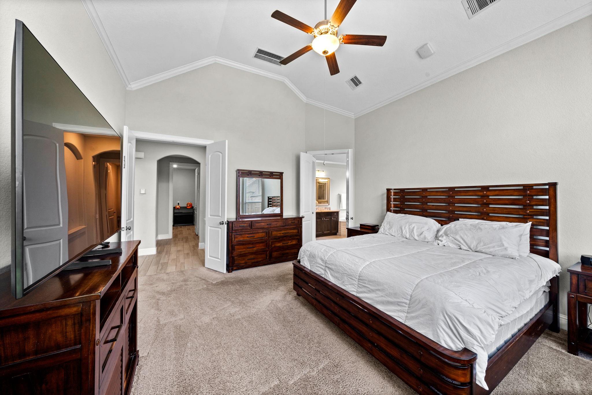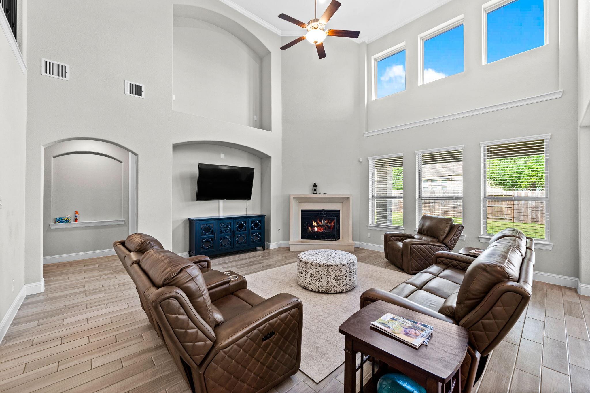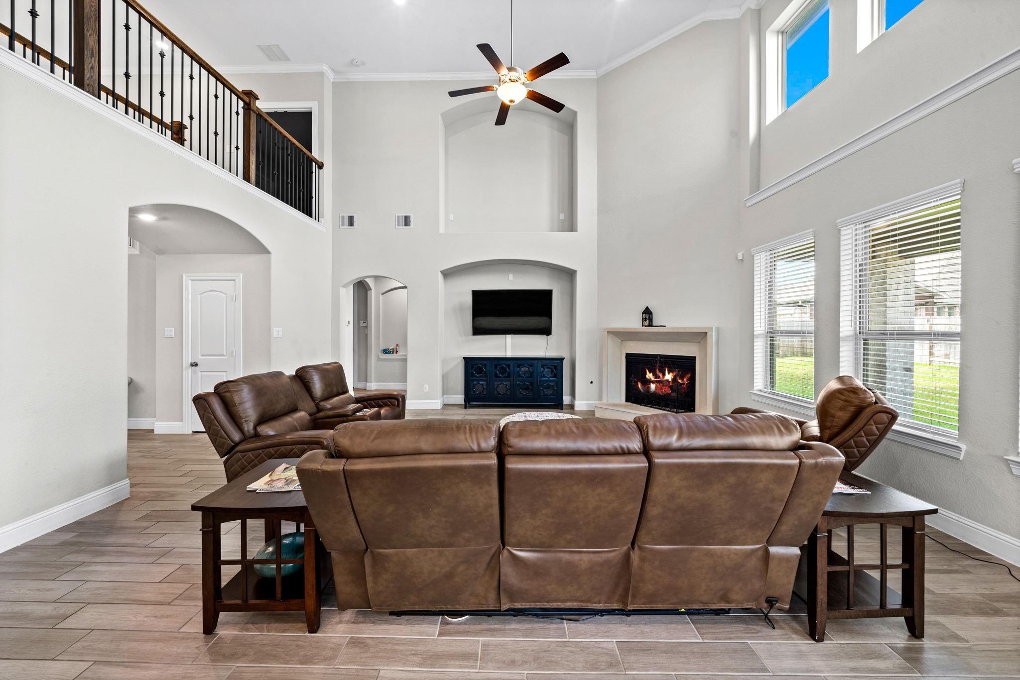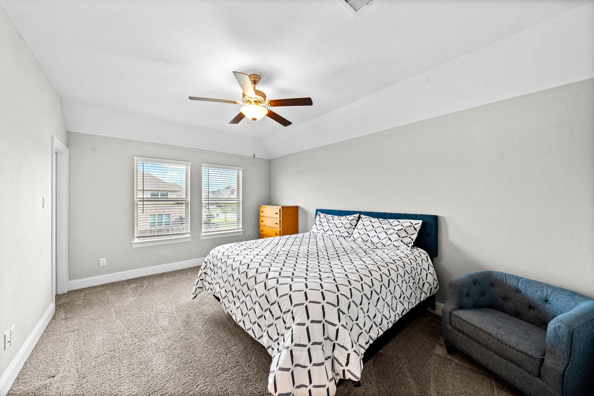 Welcome to your next home! This 4-bed, 4.5-bath residence in Falls at Dry Creek is designed with an effortless, open-concept layout that prioritizes comfort and everyday living. Two bedrooms down, both with full baths, offer flexibility for guests or multi-generational living. Soaring ceilings and a gas fireplace anchor the main living area, opening to a kitchen with oversized island, double ovens, and generous storage. Formal dining and butler’s pantry add function without sacrificing flow. The primary suite is privately tucked at the back with backyard views, dual vanities, soaking tub, and walk-in shower. Upstairs features two additional bedrooms with en-suite baths, plus a large game room and separate media room. Oversized lot with covered patio and room to expand or customize. Community amenities include pool, parks, and clubhouse.