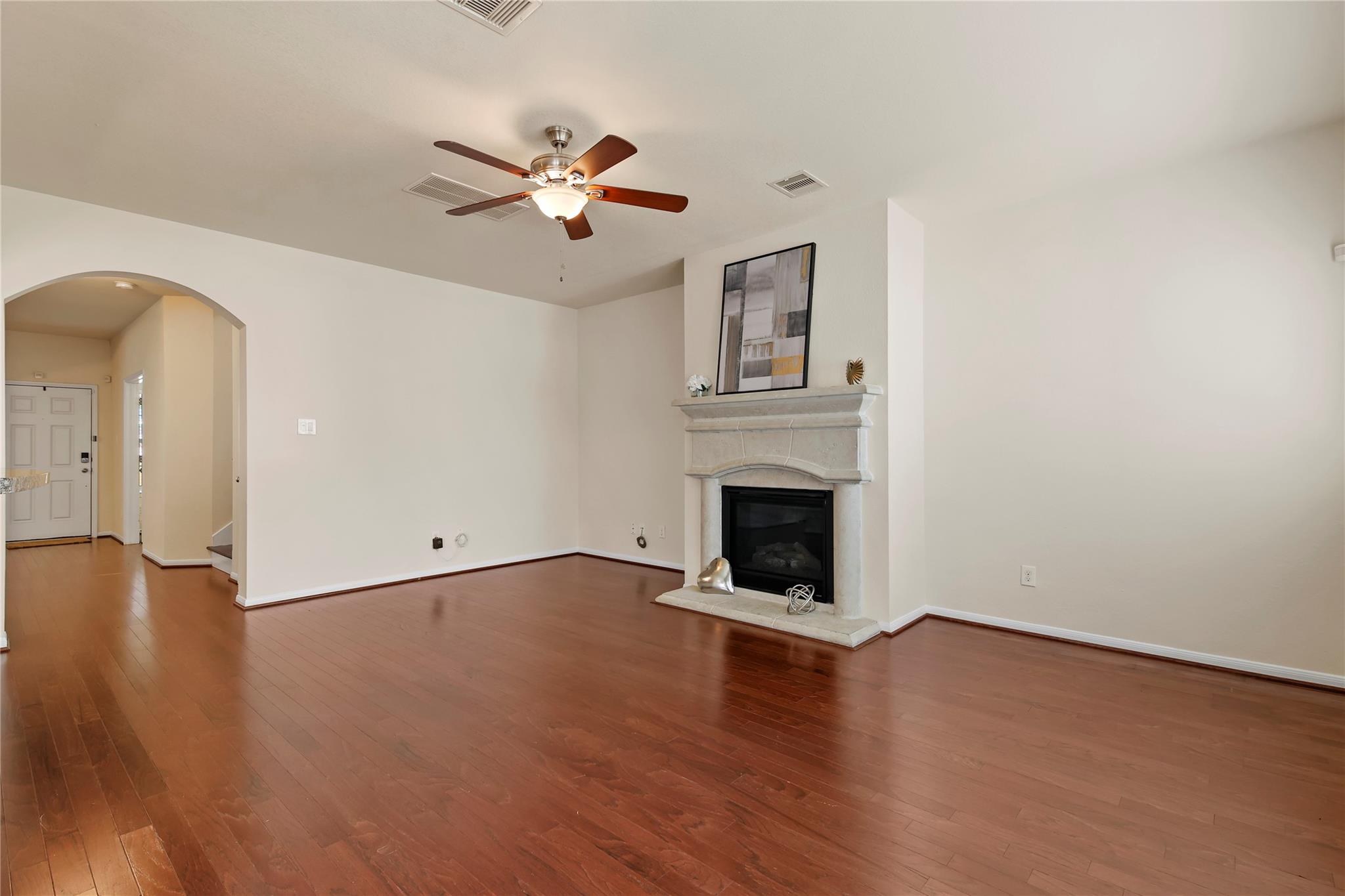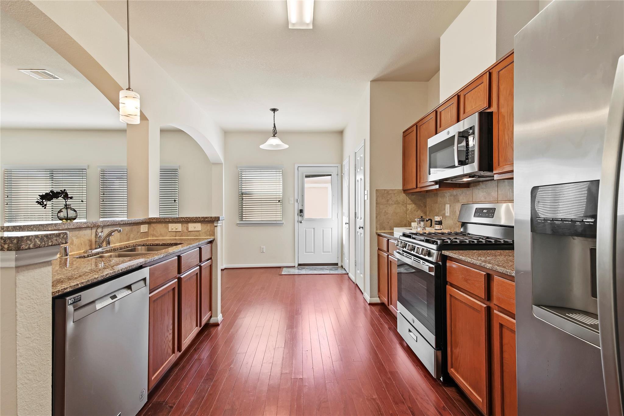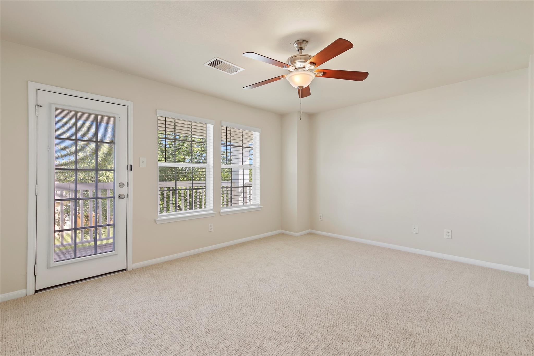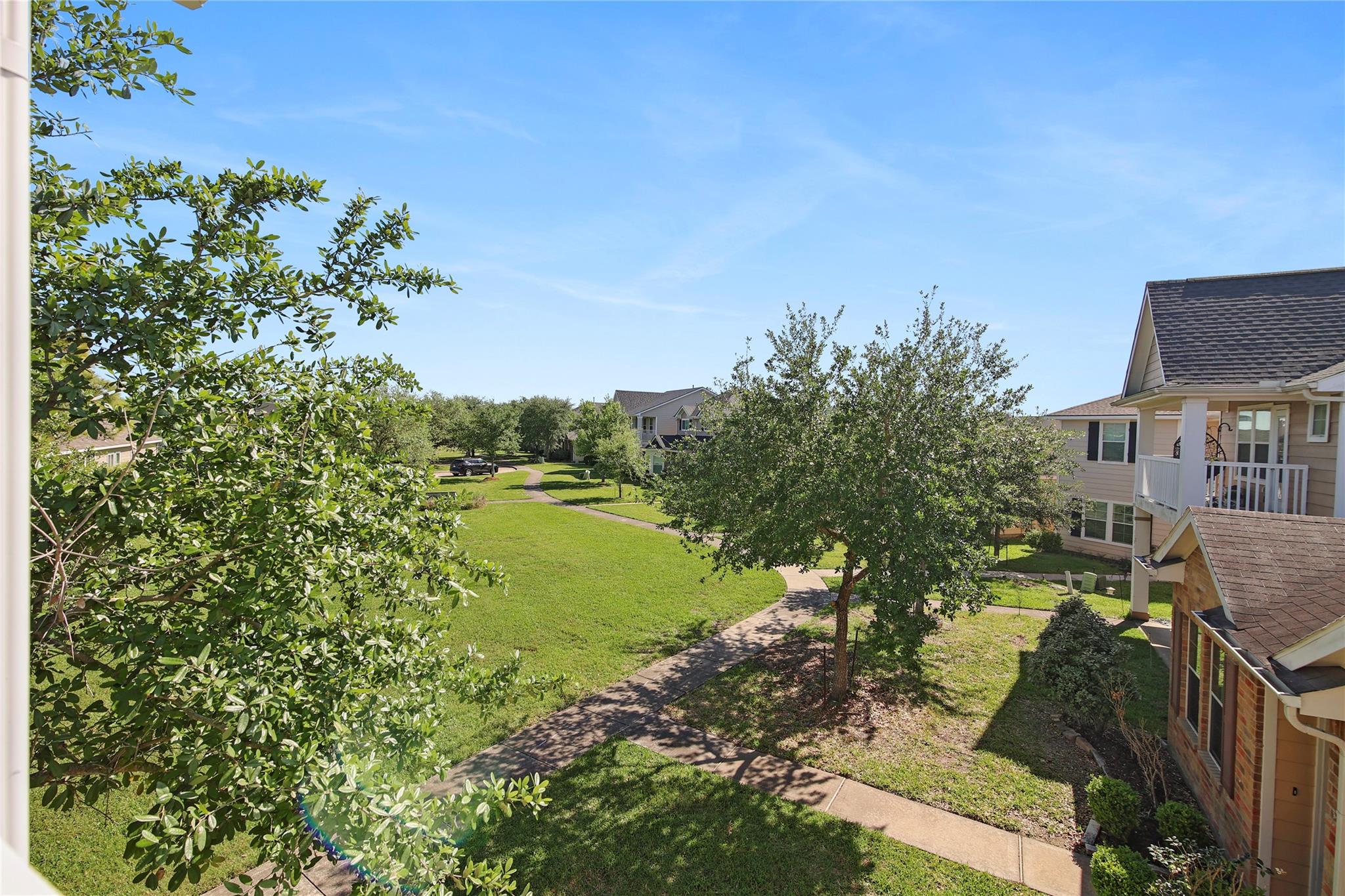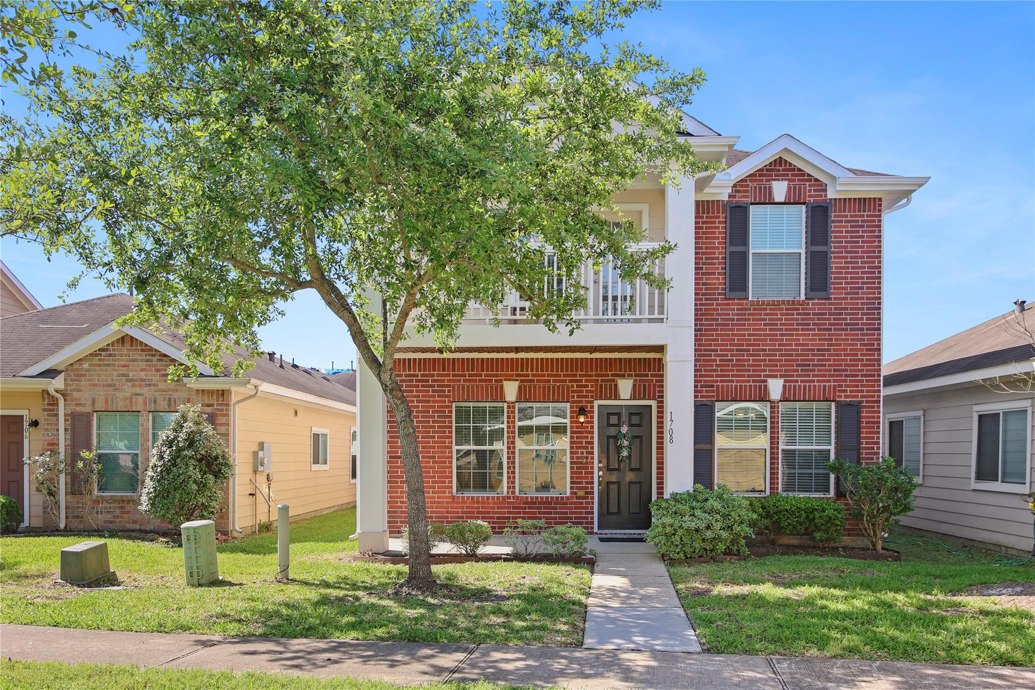 Impeccably maintained, charming residence featuring a balcony overlooking an ample greenspace. Enjoy a coffee on the primary bedroom balcony and unwind around the fireplace! Elegant finishes throughout; wood floors on first level including the stairs. Updates include new carpet, fresh paint inside and out, and new appliances including range microwave and dishwasher. The kitchen boasts granite countertops and a sink in the island and the refrigerator is included! Additional highlights include a formal dining room with arched entry, study with french doors, and game room with shelved closet for storage. The laundry room is equipped with shelves and closet rods. Conveniently located near major routes to the Medical Center and downtown, with plenty of retail options in Pearland, easily accessible from Highway 288. City Park offers a variety of new dining and shopping venues nearby.