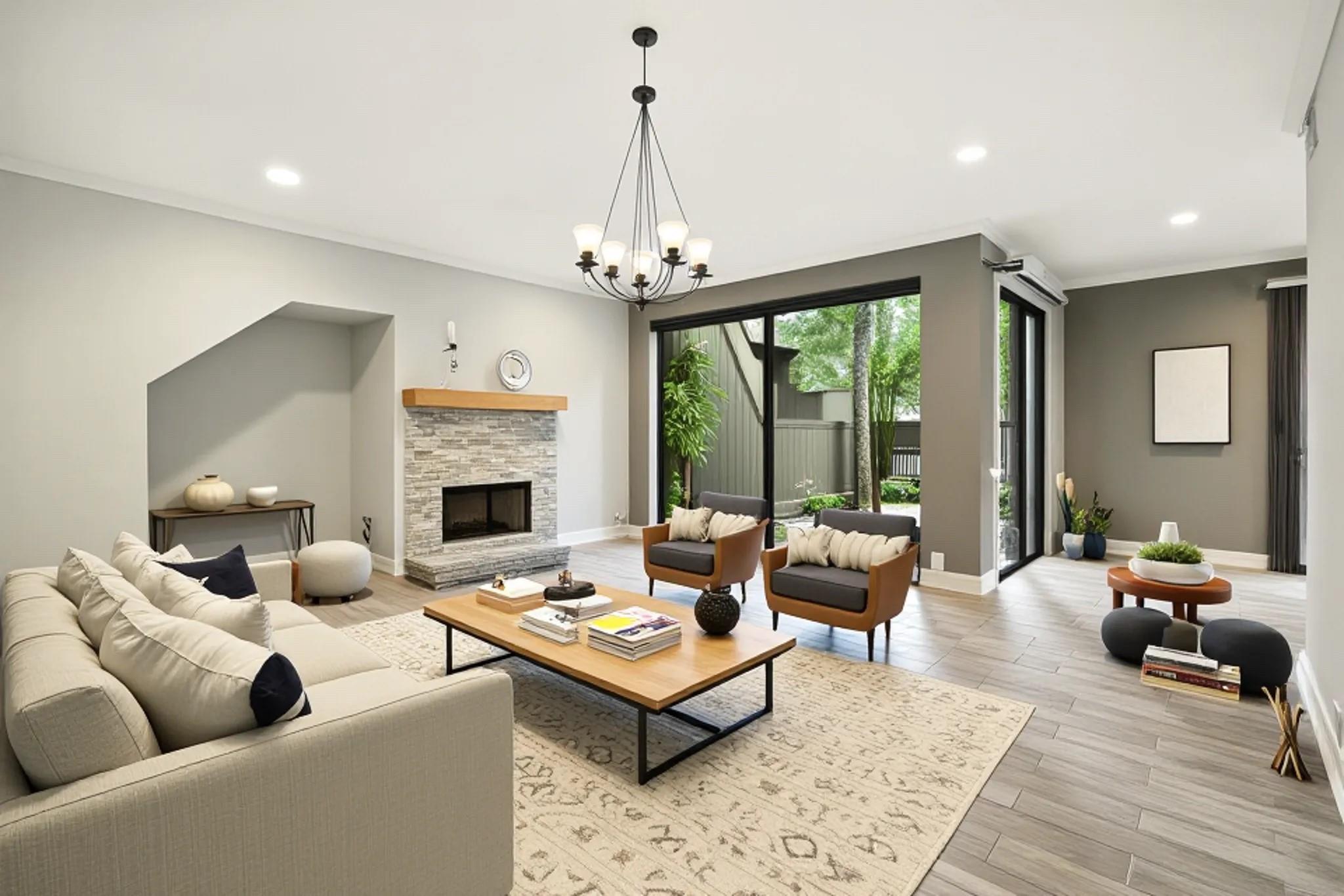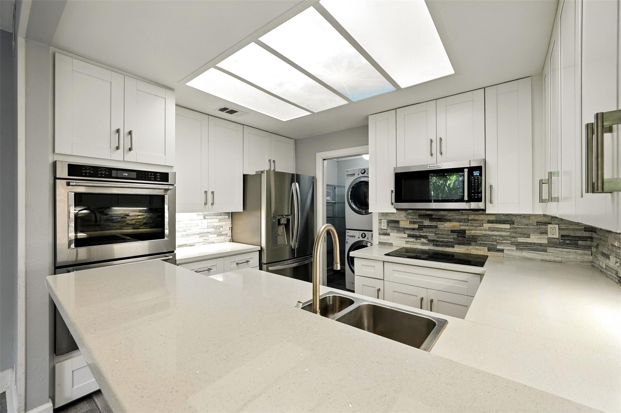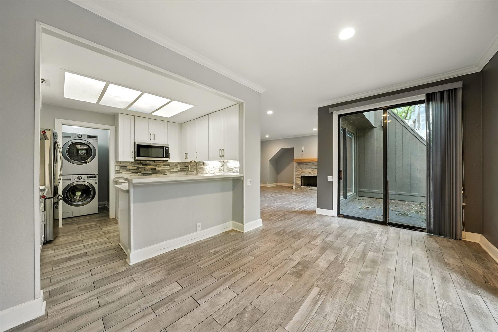 Beautifully updated end unit, set within the serene, tree-lined Ethan’s Glen community. Stunning oversized wrap-around patio surrounded by mature trees, creating a peaceful outdoor retreat. Step inside to a welcoming beverage station with a wine fridge and ample counter space. Soaring windows and sliding doors bathe the living spaces in natural light. The kitchen is thoughtfully designed with sleek countertop, stainless steel appliances, and a breakfast bar. Adjacent to the kitchen is a combined laundry room and pantry for added functionality, along with a discreet half bath on the main level. Three comfortable bedrooms and two full baths. The spacious primary suite includes a private balcony, generous closet space, and an en-suite bath featuring dual vanities and a separate tub/shower area. Residents enjoy top-rated schools and exceptional community amenities, including a clubhouse, swimming pool, tennis courts, and a scenic lake — the perfect blend of nature and neighborhood livi