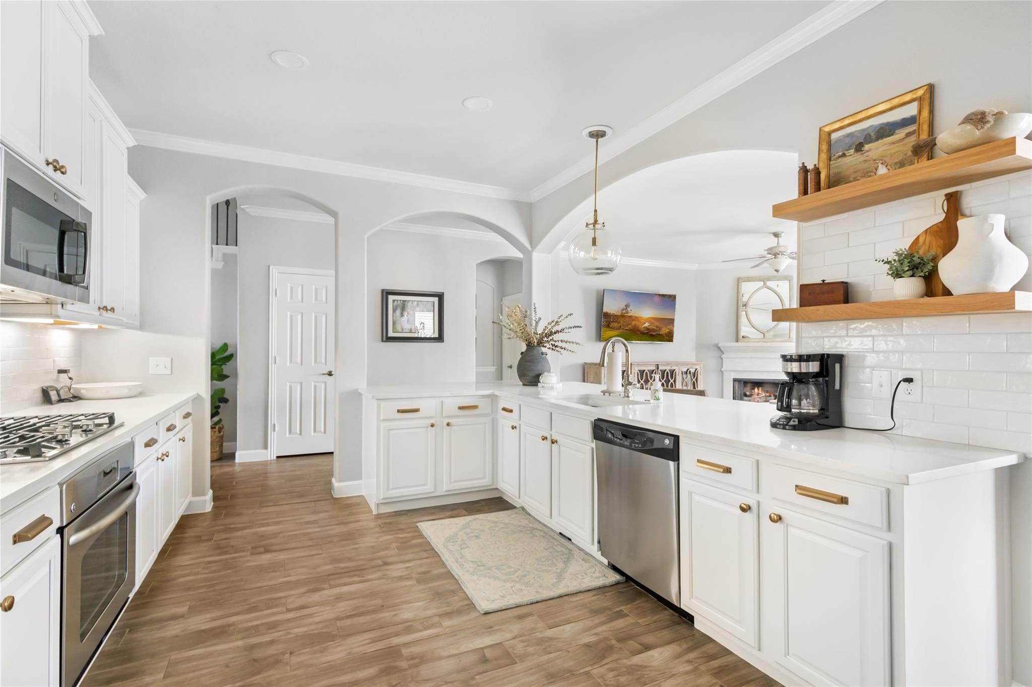 InteriorFireplace:1/Gaslog FireplaceFloors:Carpet,Tile,WoodCountertop:QuartzBathroom Description:Hollywood Bath,Primary Bath: Double Sinks,Primary Bath: Jetted Tub,Primary Bath: Separate Shower,Secondary Bath(s): Tub/Shower ComboBedroom Desc:2 Bedrooms Down,Primary Bed - 1st Floor,Walk-In ClosetKitchen Desc:Kitchen open to Family Room,Pantry,Under Cabinet Lighting,Walk-in PantryRoom Description:Breakfast Room,Entry,Family Room,Formal Dining,Gameroom Up,Utility Room in HouseHeating:Central GasCooling:Central ElectricConnections:Electric Dryer Connections,Washer ConnectionsDishwasher:YesDisposal:YesCompactor:NoMicrowave:YesRange:Gas CooktopOven:Electric OvenIce Maker:NoEnergy Feature:Attic Vents,Ceiling Fans,Digital Program Thermostat,Energy Star Appliances,High-Efficiency HVAC,HVAC>13 SEER,Insulated/Low-E windows,Insulation - Batt,Other Energy Features,Radiant Attic BarrierInterior:Alarm System - Leased,Crown Molding,Fire/Smoke Alarm,Formal Entry/Foyer,High Ceiling,Prewired for Alarm System,Window Coverings