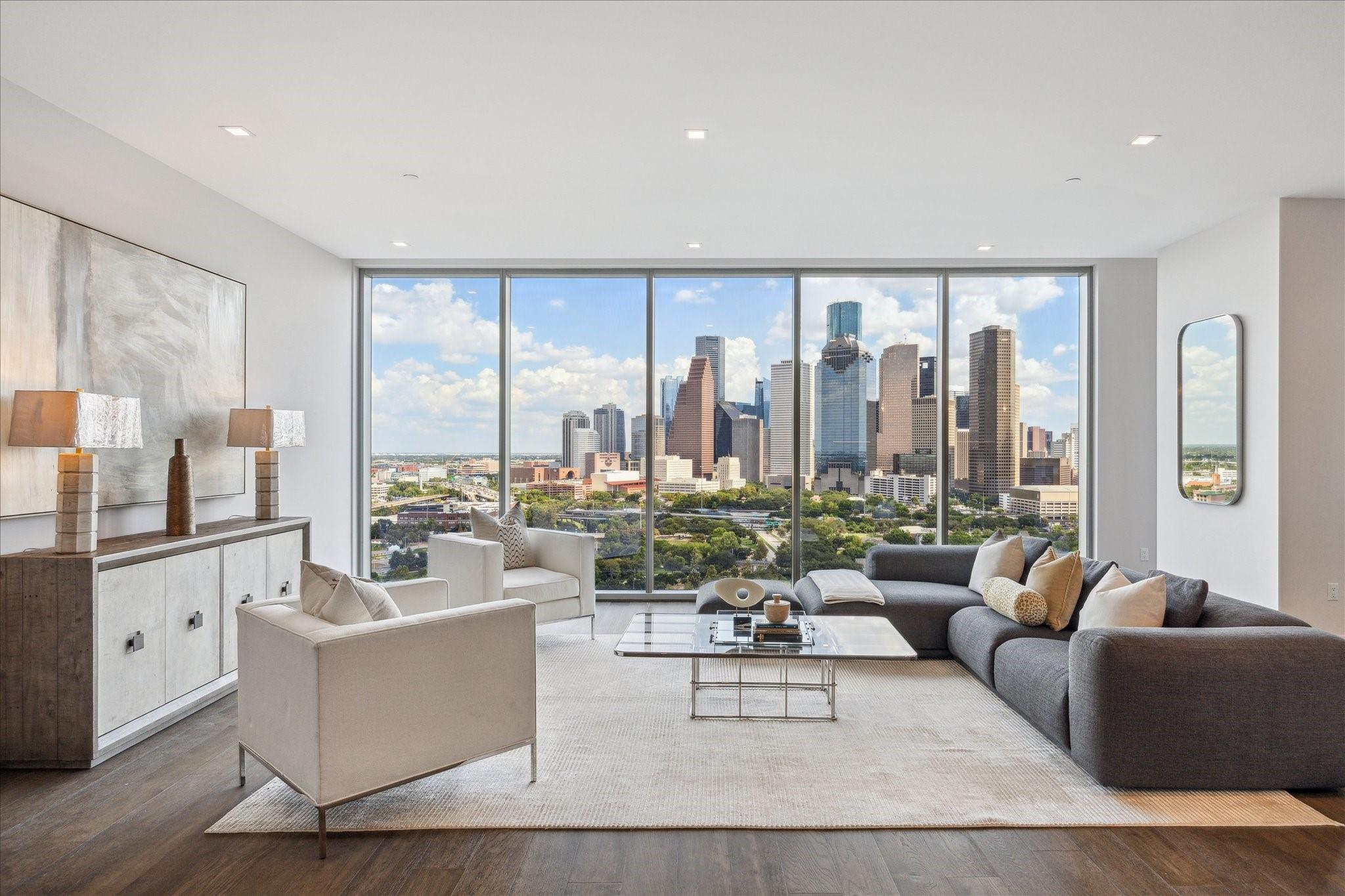 Discover refined luxury in this stunning 2-bedroom plus flex space, offering exceptional design, premium finishes, and panoramic views. The gourmet kitchen is a chef’s dream, featuring custom PEDINI cabinetry and top-tier Thermador appliances. The expansive open living and dining spaces create an inviting atmosphere, while the serene primary suite serves as a perfect retreat. A second bedroom and a covered balcony with a built-in summer kitchen provide ample space for both relaxation and entertaining. Located within a prestigious building offering 24/7 concierge services and exclusive hotel amenities, this residence combines ultimate convenience with elevated living. Ideally positioned near downtown, Buffalo Bayou Park, and Houston’s finest dining, this is the ultimate destination for inner-loop luxury living.