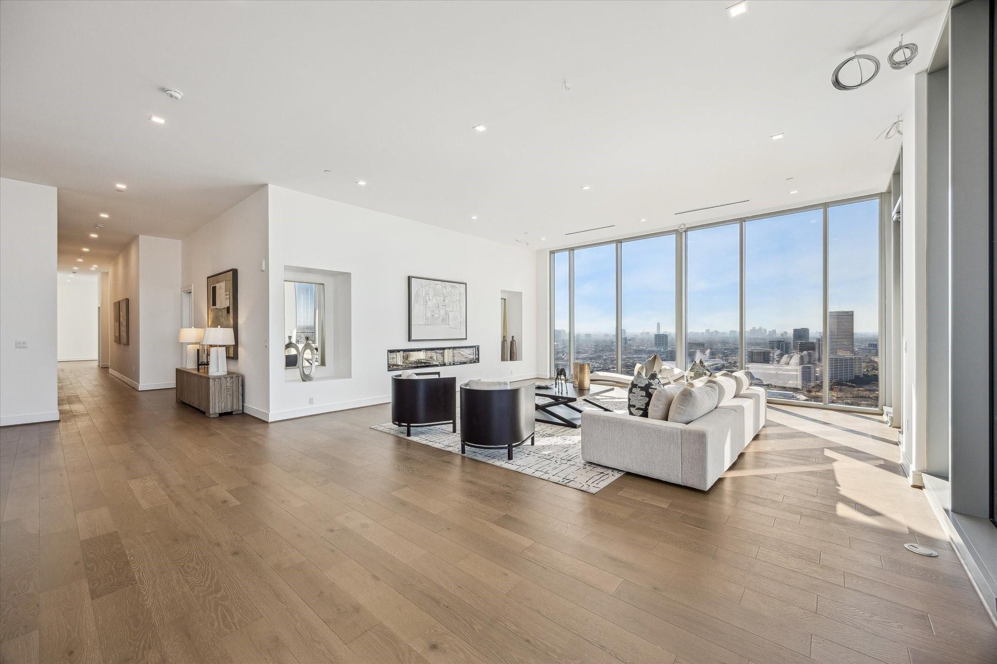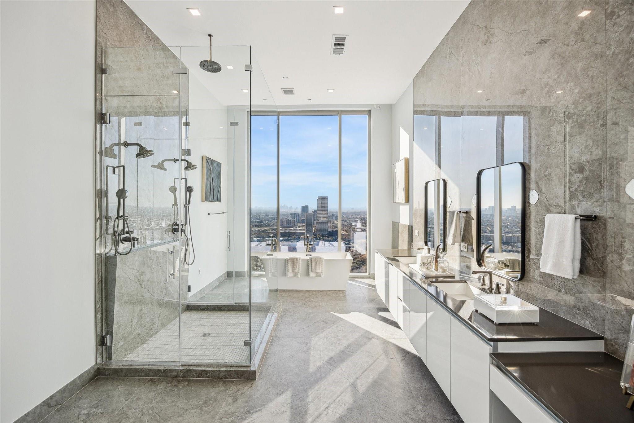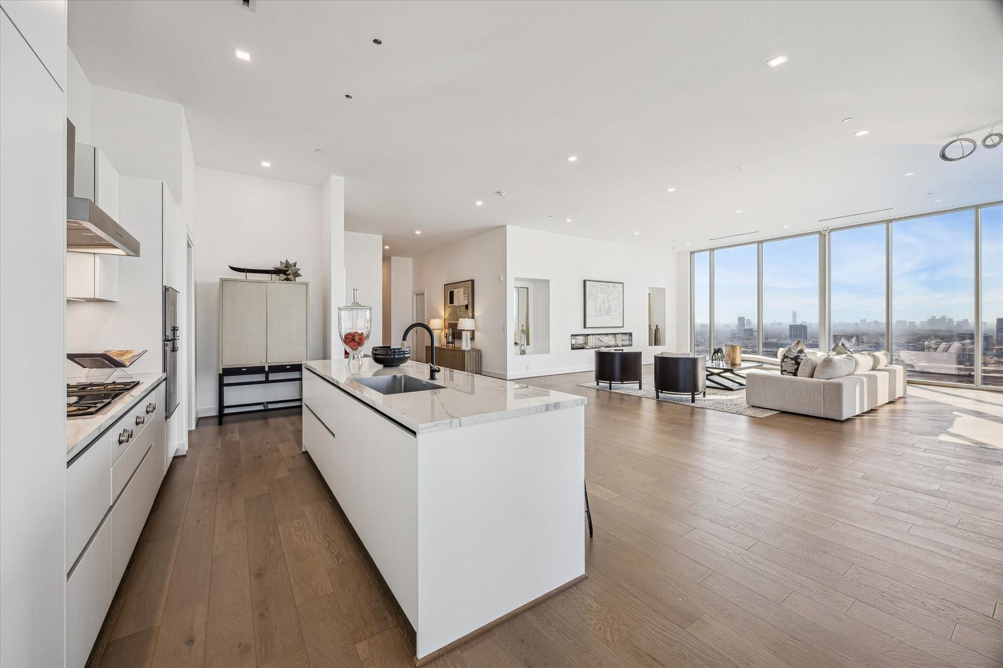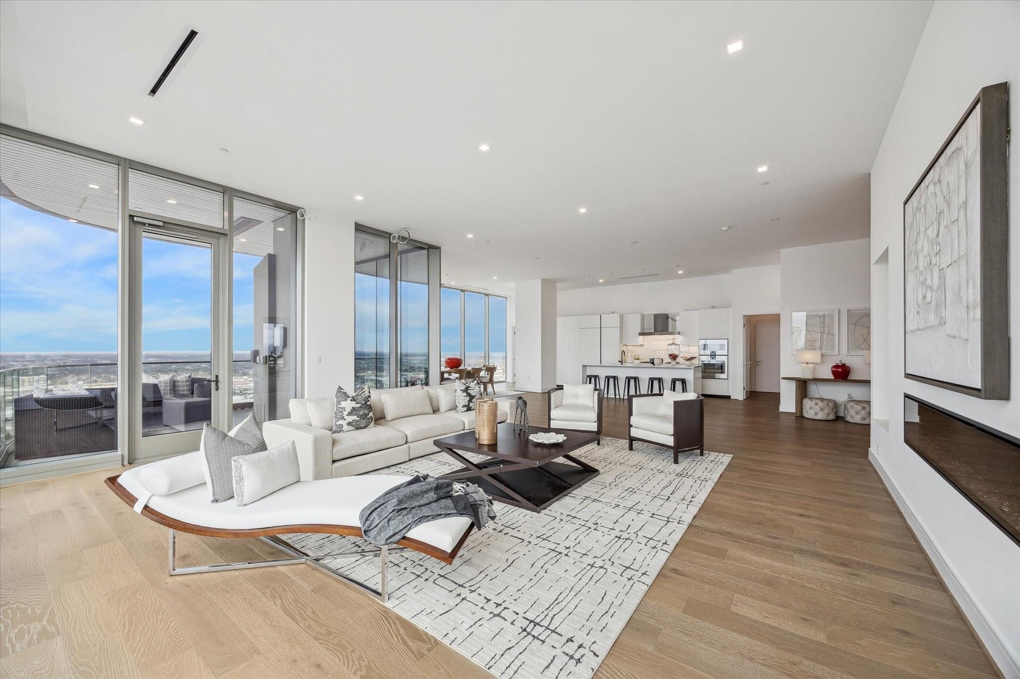 The Residences at The Allen, Houston’s premiere Luxury Condo Hotel Tower on Allen Parkway, Houston, stands gracefully against the city skyline. Its modern design and glass windows exude sophistication, while a warm glow from the setting sun highlights its elegance. Private balconies with lush greenery offer panoramic views of Houston and Buffalo Bayou Park. This building embodies luxury living, with exceptional amenities and breathtaking vistas. The Penthouse features 3 bedrooms plus a large secondary living or flex space, 3 and half baths with a large living, dining, kitchen and fireplace. Plus room for a possible wine room and secondary catering kitchen. Additional features include Pedini Italian cabinets, porcelain counter tops, heated primary bathroom floors, 12 ft floor to ceiling windows, sweeping north and west views with a private balcony and pool. Plus a two car private interior garage.