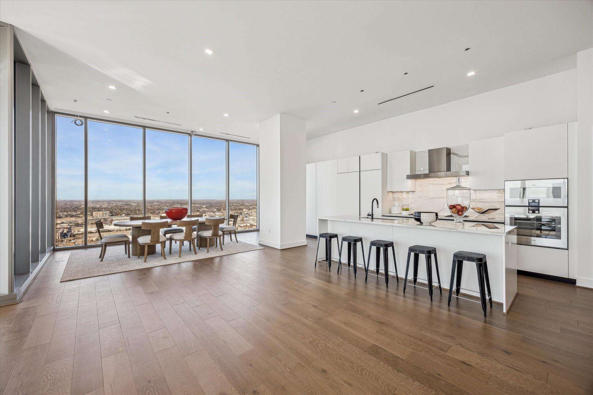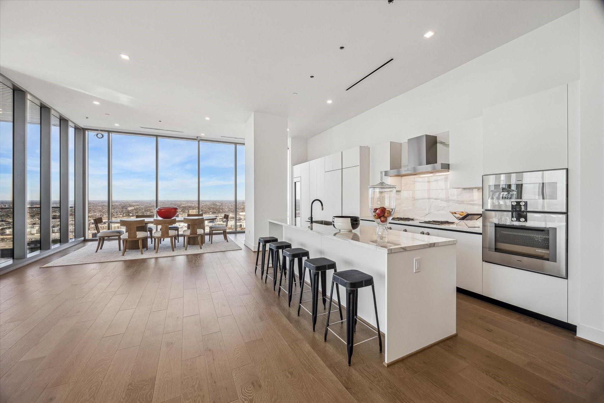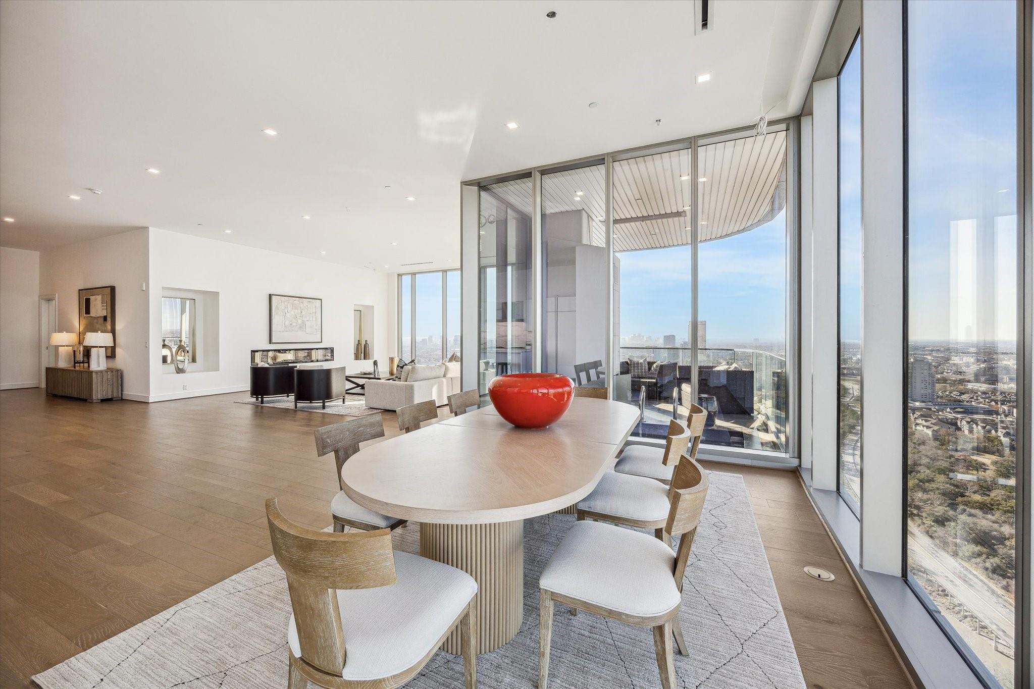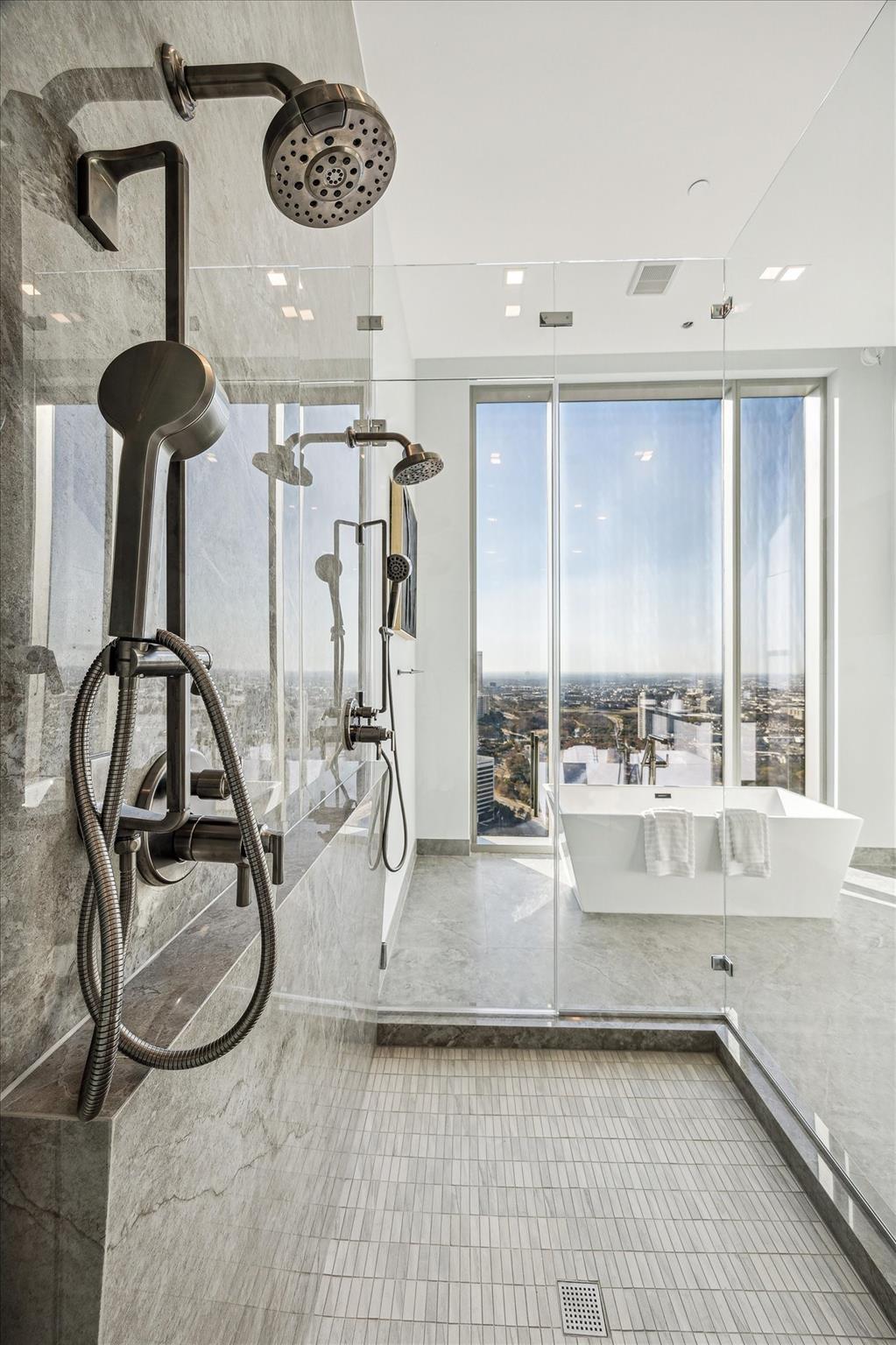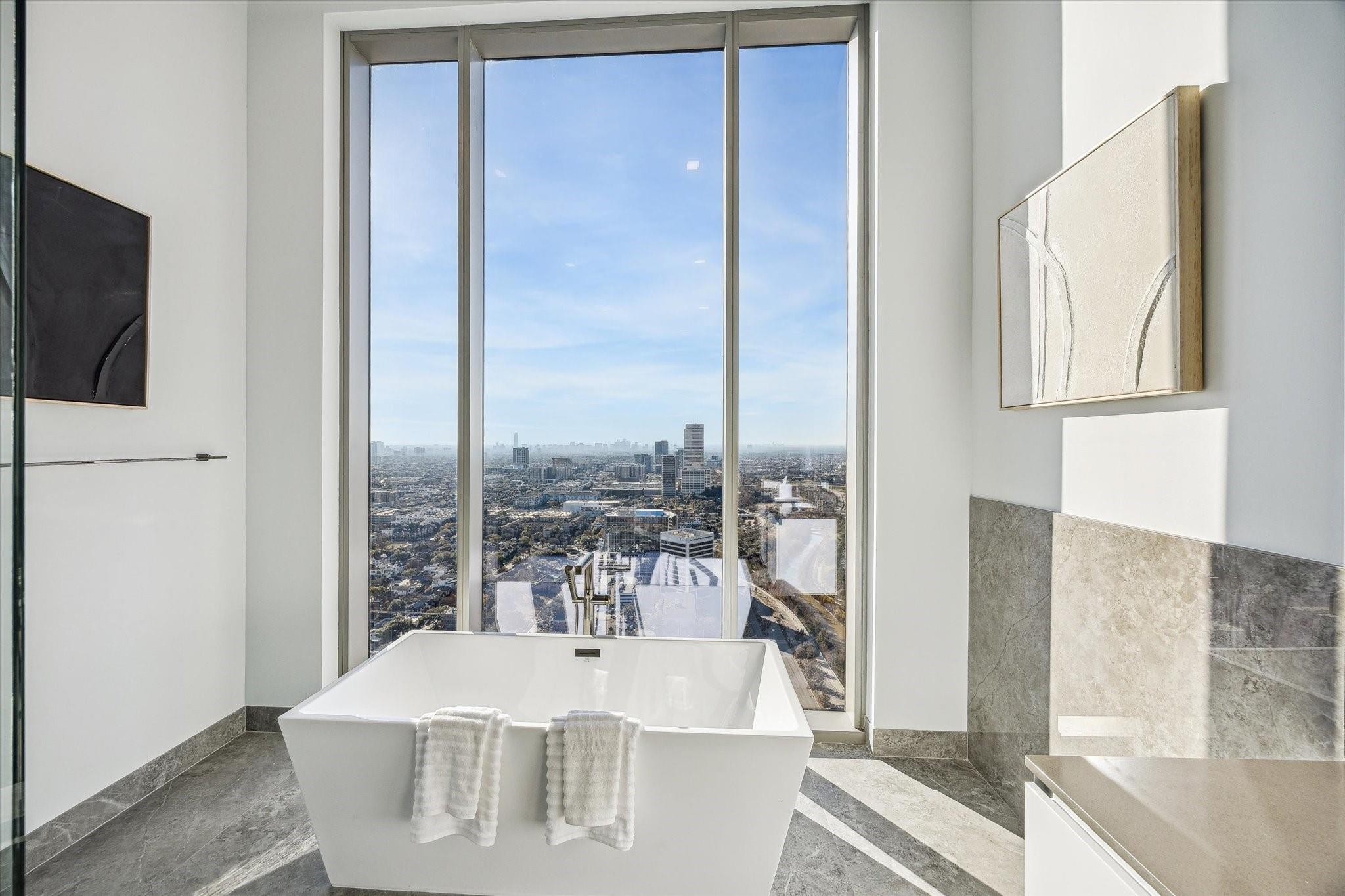 The Residences at The Allen, Houston’s premiere Luxury Condo Hotel Tower on Allen Parkway, Houston, stands gracefully against the city skyline. Its modern design and glass windows exude sophistication, while a warm glow from the setting sun highlights its elegance. Private balconies with lush greenery offer panoramic views of Houston and Buffalo Bayou Park. This building embodies luxury living, with exceptional amenities and breathtaking vistas. The Penthouse features 3 bedrooms plus a large secondary living or flex space, 3 and half baths with a large living, dining, kitchen and fireplace. Plus room for a possible wine room and secondary catering kitchen. Additional features include Pedini Italian cabinets, porcelain counter tops, heated primary bathroom floors, 12 ft floor to ceiling windows, sweeping north and west views with a private balcony and pool. Plus a two car private interior garage.