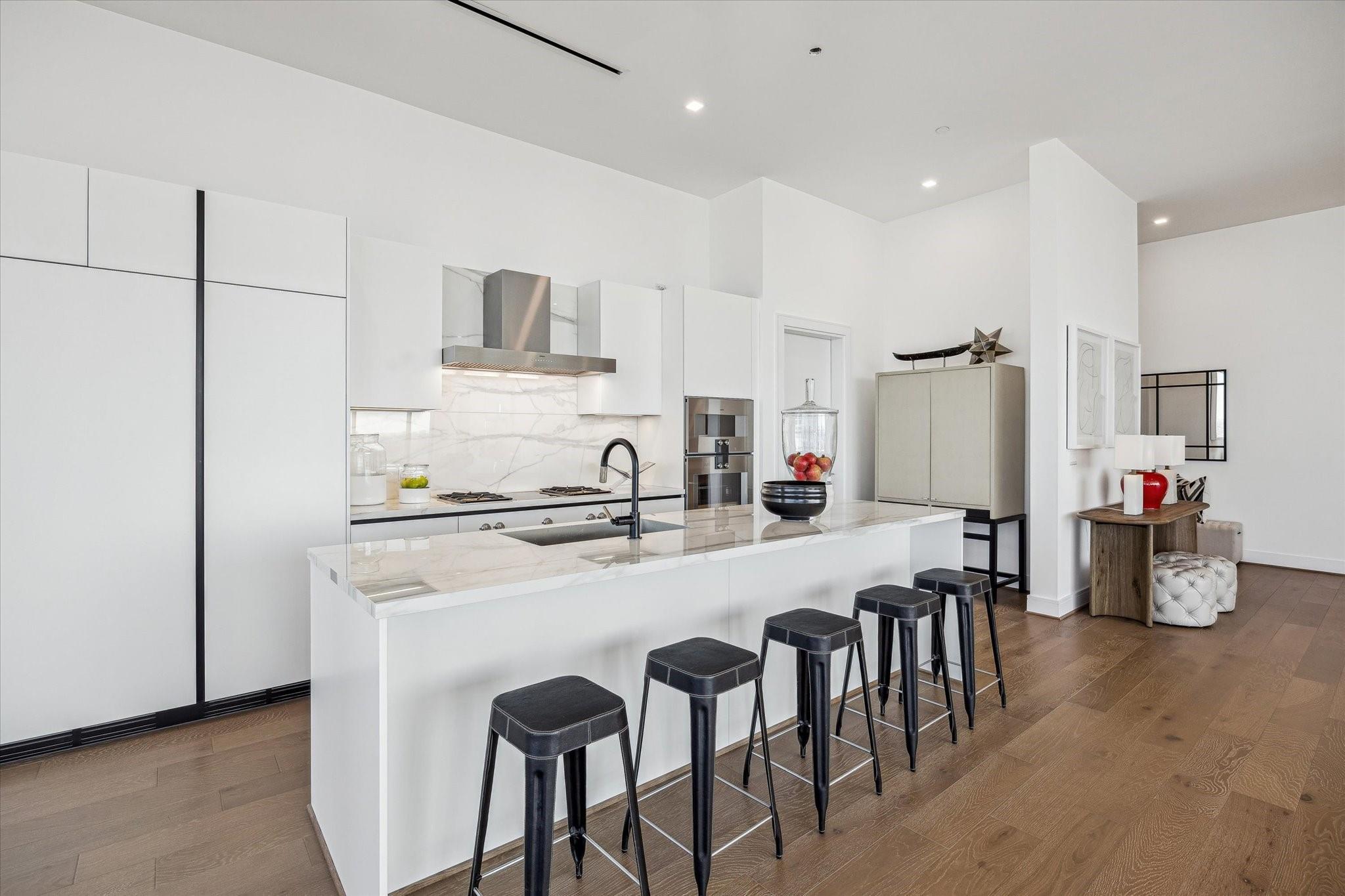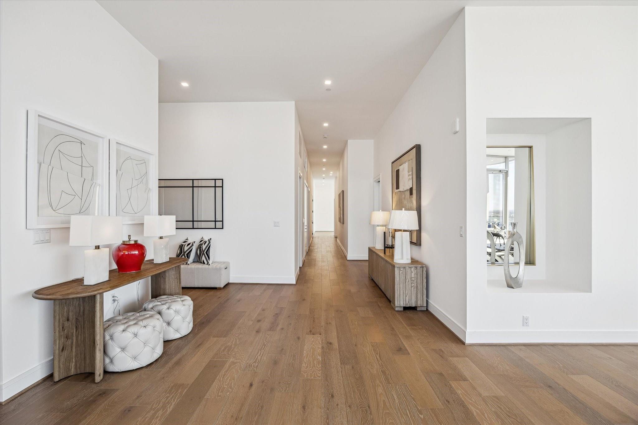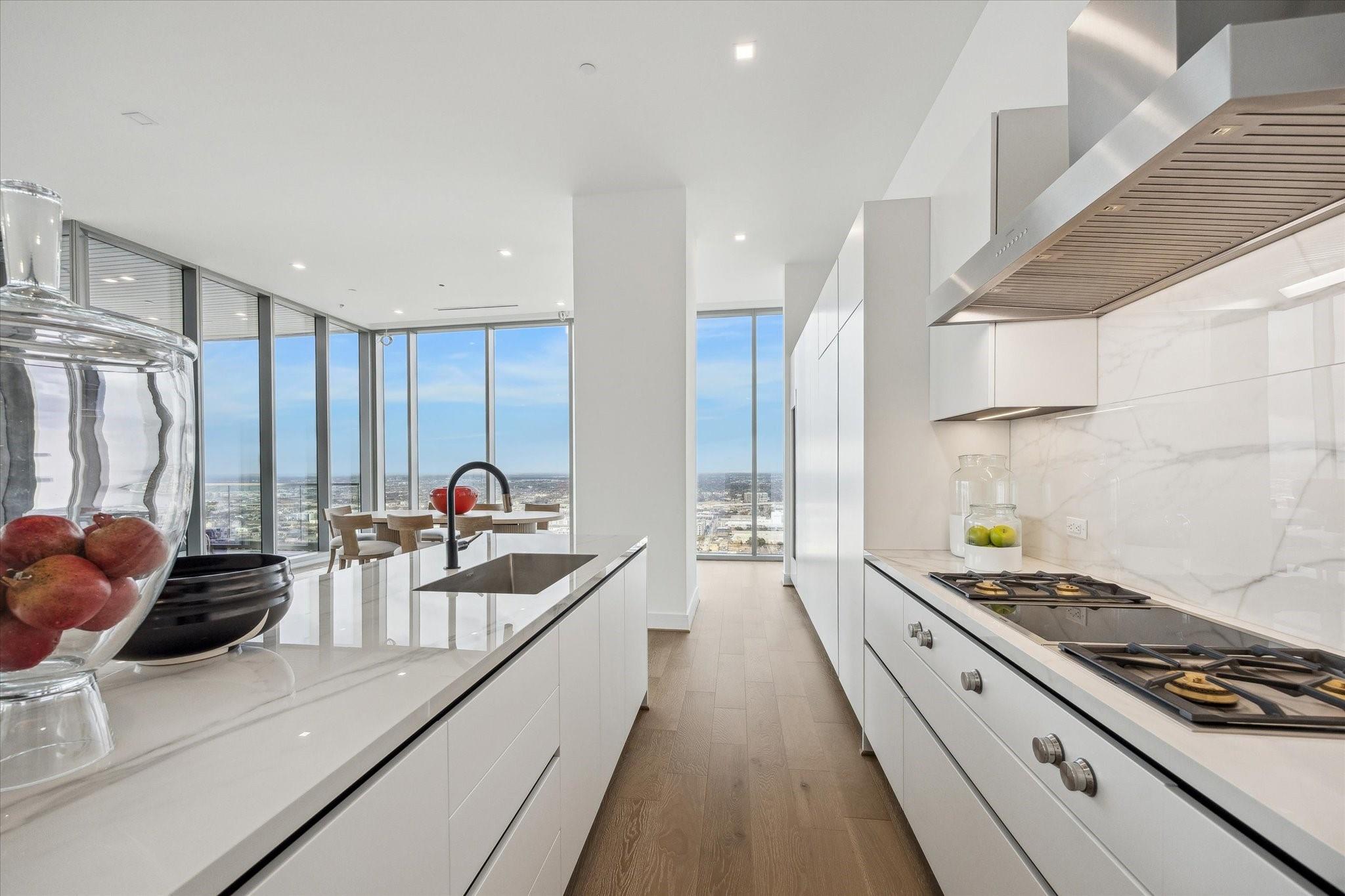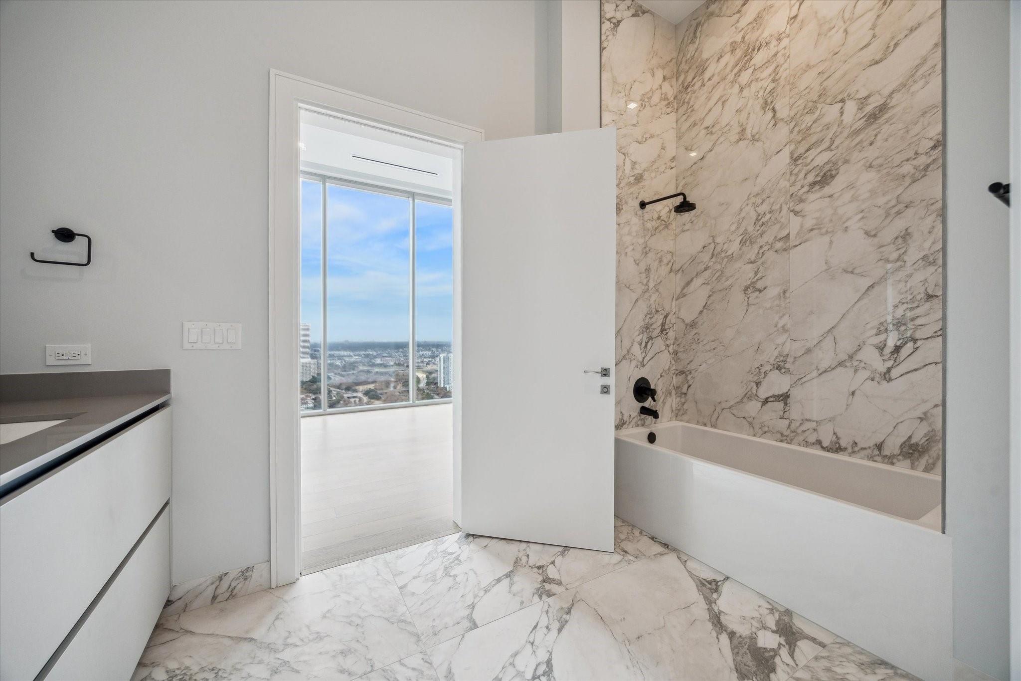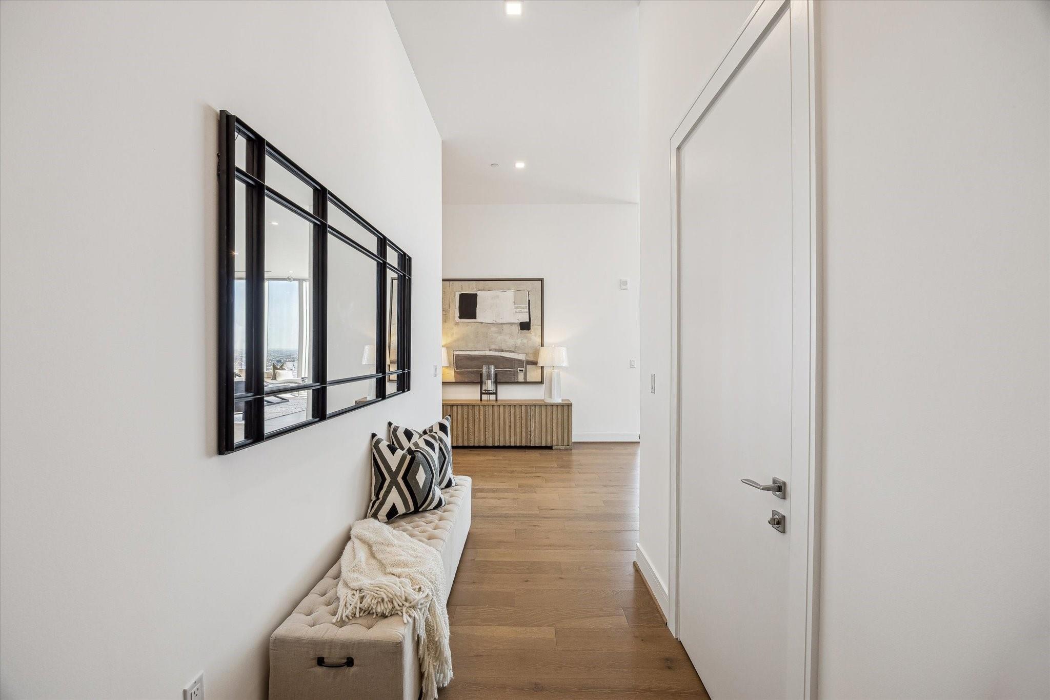 The Residences at The Allen, Houston’s premiere Luxury Condo Hotel Tower on Allen Parkway, Houston, stands gracefully against the city skyline. Its modern design and glass windows exude sophistication, while a warm glow from the setting sun highlights its elegance. Private balconies with lush greenery offer panoramic views of Houston and Buffalo Bayou Park. This building embodies luxury living, with exceptional amenities and breathtaking vistas. The Penthouse features 3 bedrooms plus a large secondary living or flex space, 3 and half baths with a large living, dining, kitchen and fireplace. Plus room for a possible wine room and secondary catering kitchen. Additional features include Pedini Italian cabinets, porcelain counter tops, heated primary bathroom floors, 12 ft floor to ceiling windows, sweeping north and west views with a private balcony and pool. Plus a two car private interior garage.