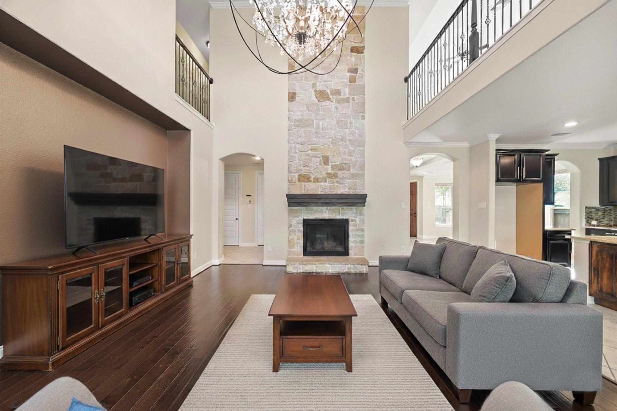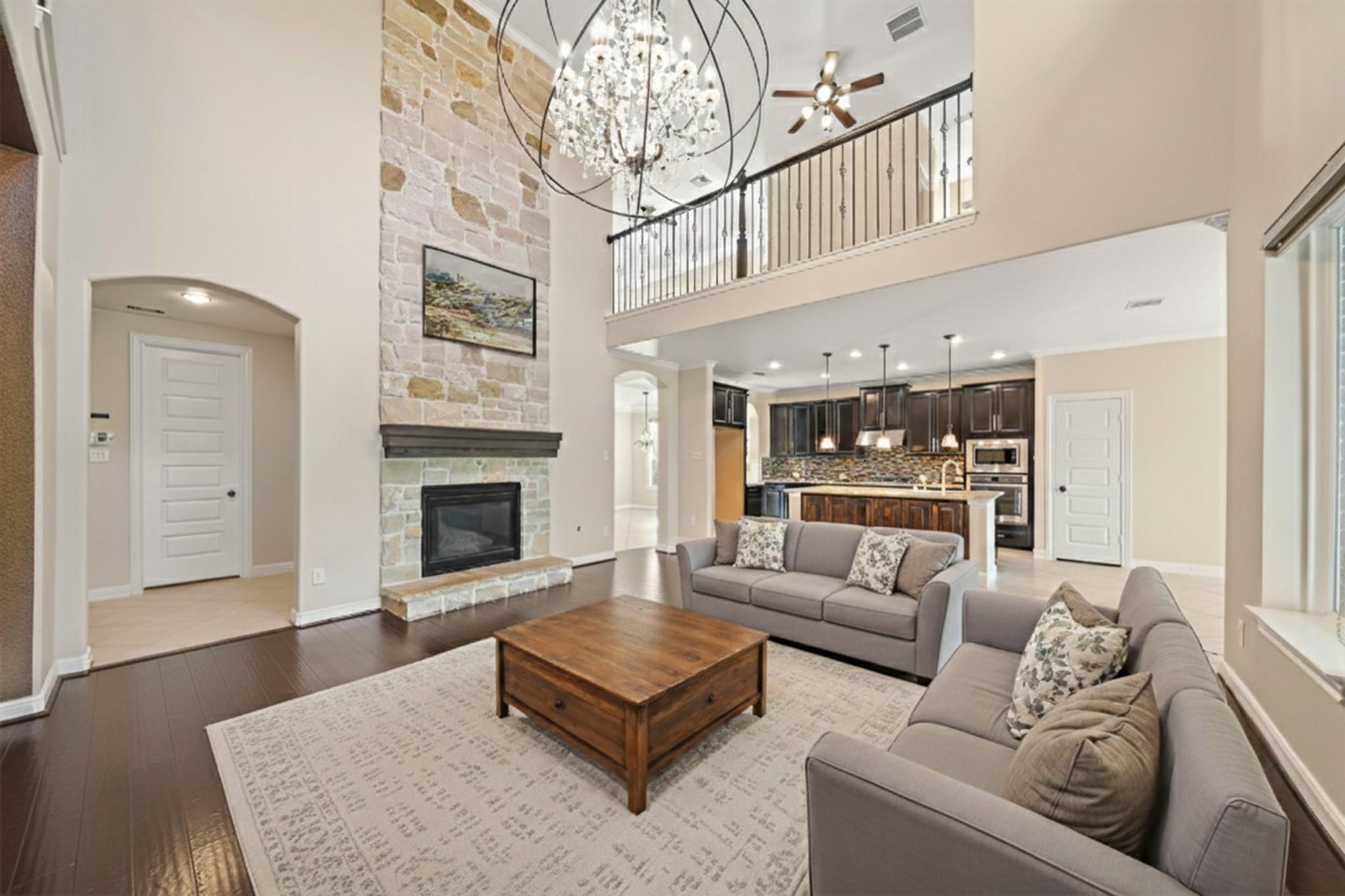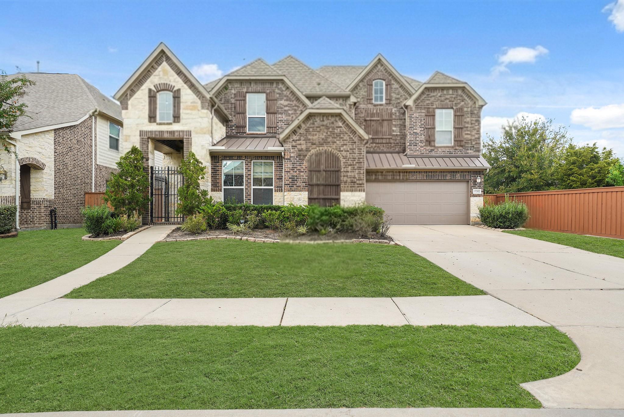 Elevate your lifestyle in this spectacular 6-bedroom, 5.5-bath residence, perfectly positioned in the highly desirable Aliana community. This home features a rare dual primary suite layout with one suite on each level. Soaring ceilings, elegant wrought iron details, and a dramatic chandelier enhance the sophisticated design. The gourmet kitchen boasts rich cabinetry, granite countertops, and a large island open to the family room with floor-to-ceiling windows. The first floor includes two bedrooms and 2.5 baths, highlighted by a spa-inspired primary suite. Upstairs offers a second primary suite, four additional bedrooms, a game room, media room, Jack-and-Jill bath, and two full baths. Timeless brick exterior and access to Aliana’s parks, trails, and amenities complete this exceptional home.