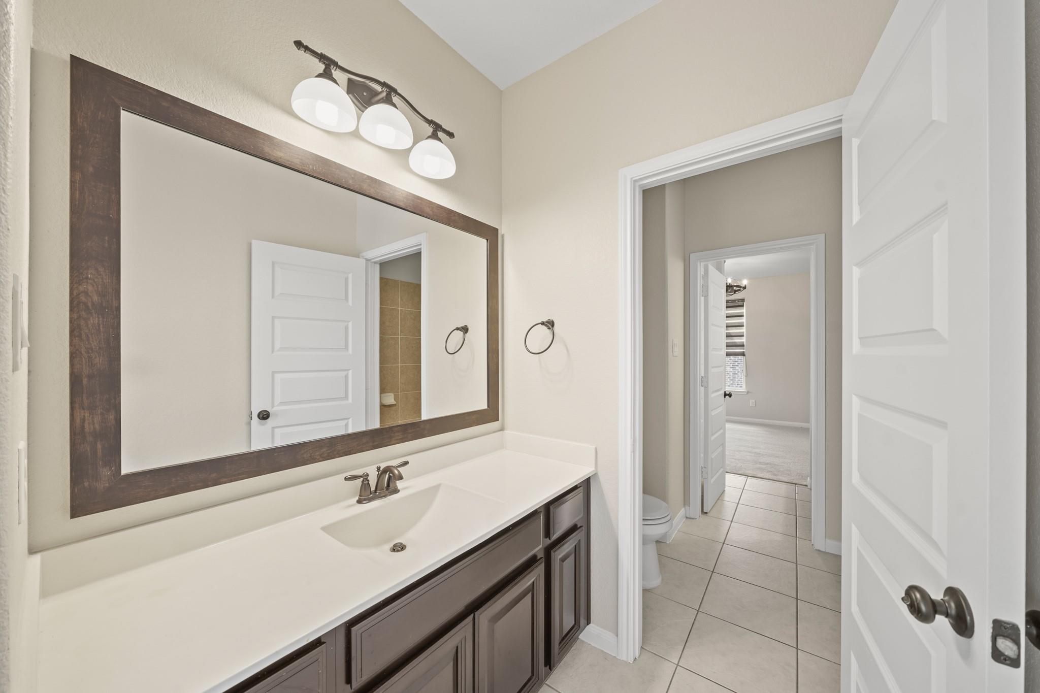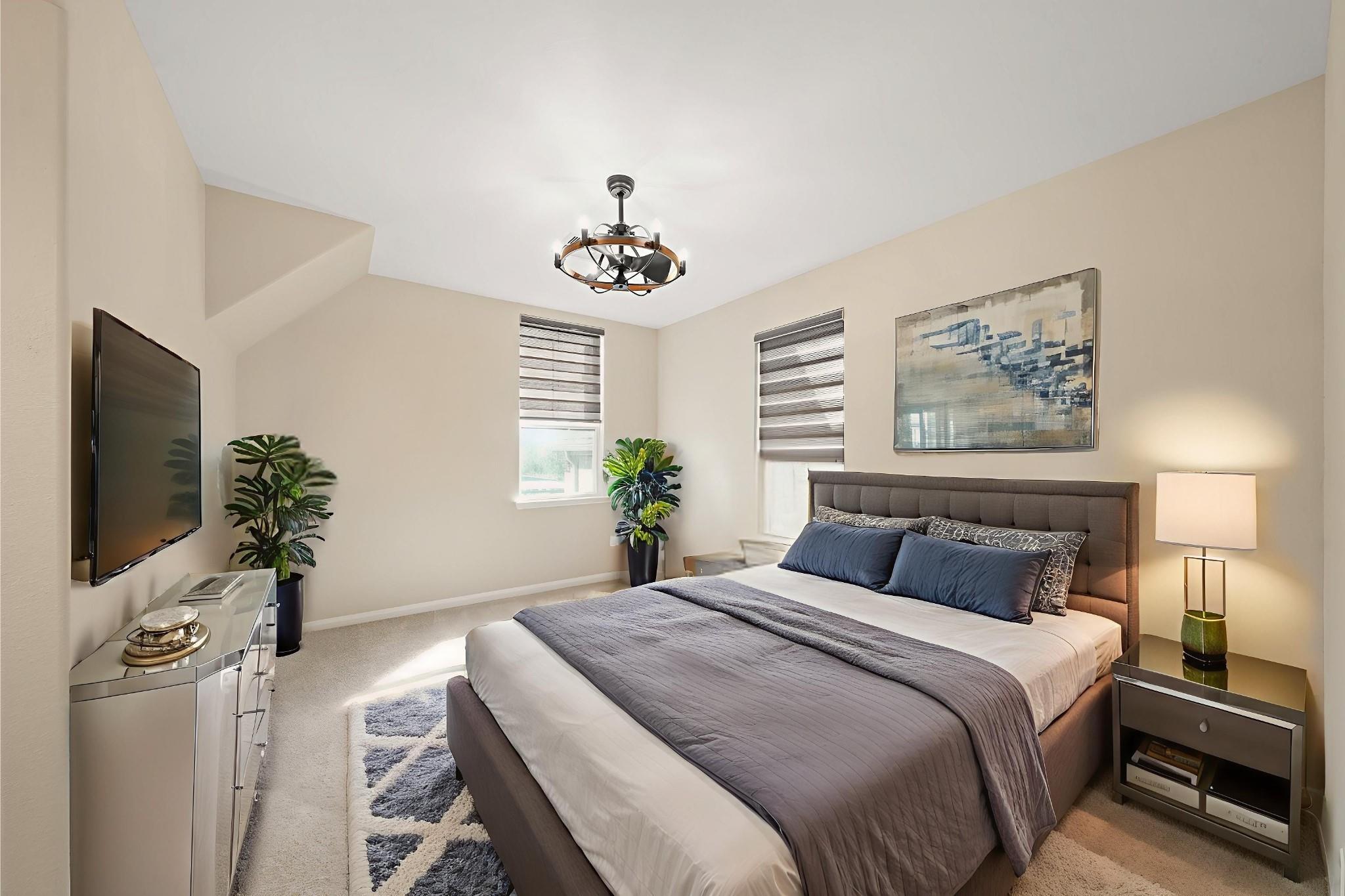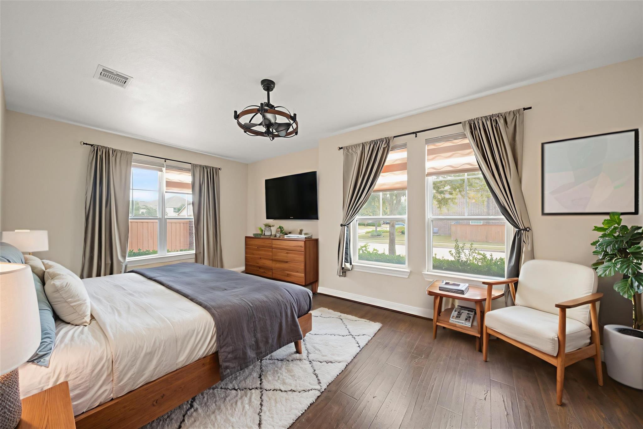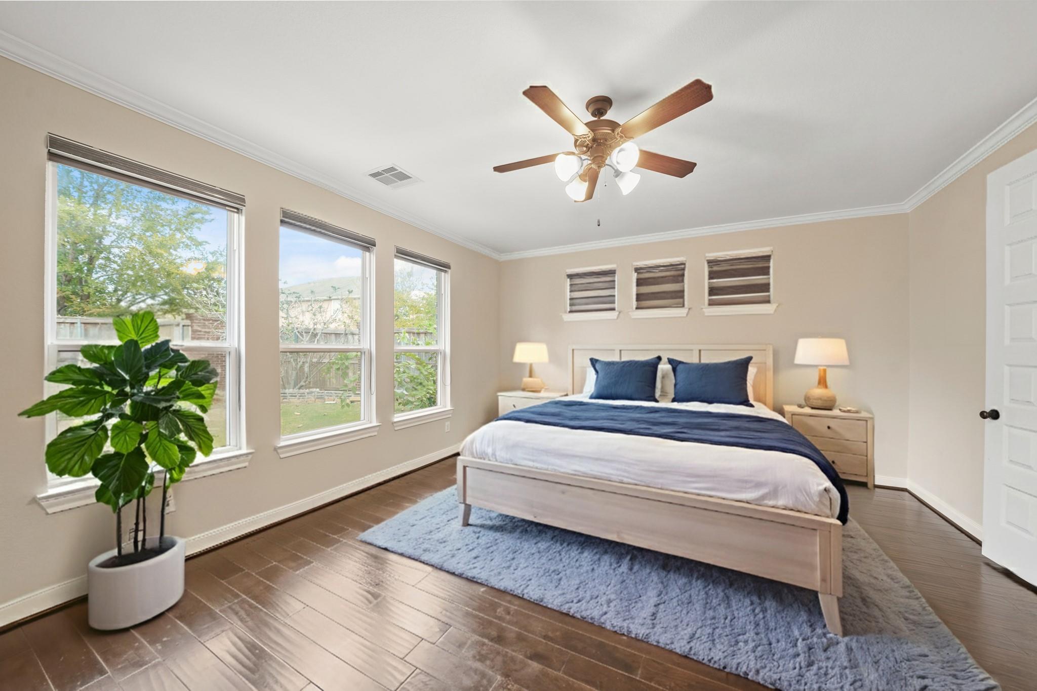 Elevate your lifestyle in this spectacular 6-bedroom, 5.5-bath residence, perfectly positioned in the highly desirable Aliana community. This home features a rare dual primary suite layout with one suite on each level. Soaring ceilings, elegant wrought iron details, and a dramatic chandelier enhance the sophisticated design. The gourmet kitchen boasts rich cabinetry, granite countertops, and a large island open to the family room with floor-to-ceiling windows. The first floor includes two bedrooms and 2.5 baths, highlighted by a spa-inspired primary suite. Upstairs offers a second primary suite, four additional bedrooms, a game room, media room, Jack-and-Jill bath, and two full baths. Timeless brick exterior and access to Aliana’s parks, trails, and amenities complete this exceptional home.