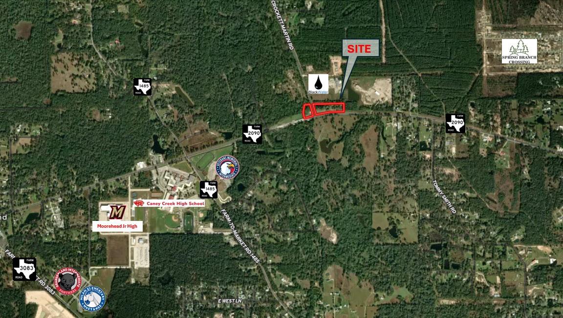 Prime signalized hard corner offering +/-4.92 unrestricted acres at the intersection of FM 2090 & Crockett Martin Rd. This high-visibility tract features approximately +/-736 feet of frontage on FM 2090 and +/-292 feet on Crockett Martin Rd at a traffic light, plus an additional portion on the west side of Crockett Martin with +/-242 feet of frontage on FM 2090 and +/-315 feet on Crockett Martin Rd. Excellent access, strong frontage, and maximum exposure make this site ideal for a gas station/convenience store, quick-service or fast-food restaurant, retail center, medical, or mixed-use commercial development. The area is experiencing rapid growth with new construction subdivisions and ongoing development along FM 2090 and Crockett Martin Rd. Located just 1 mile from Caney Creek High School and Moorehead Junior High and strategically positioned between I-45 and Hwy 69, this property offers unlimited potential to serve a heavily populated and expanding trade area.