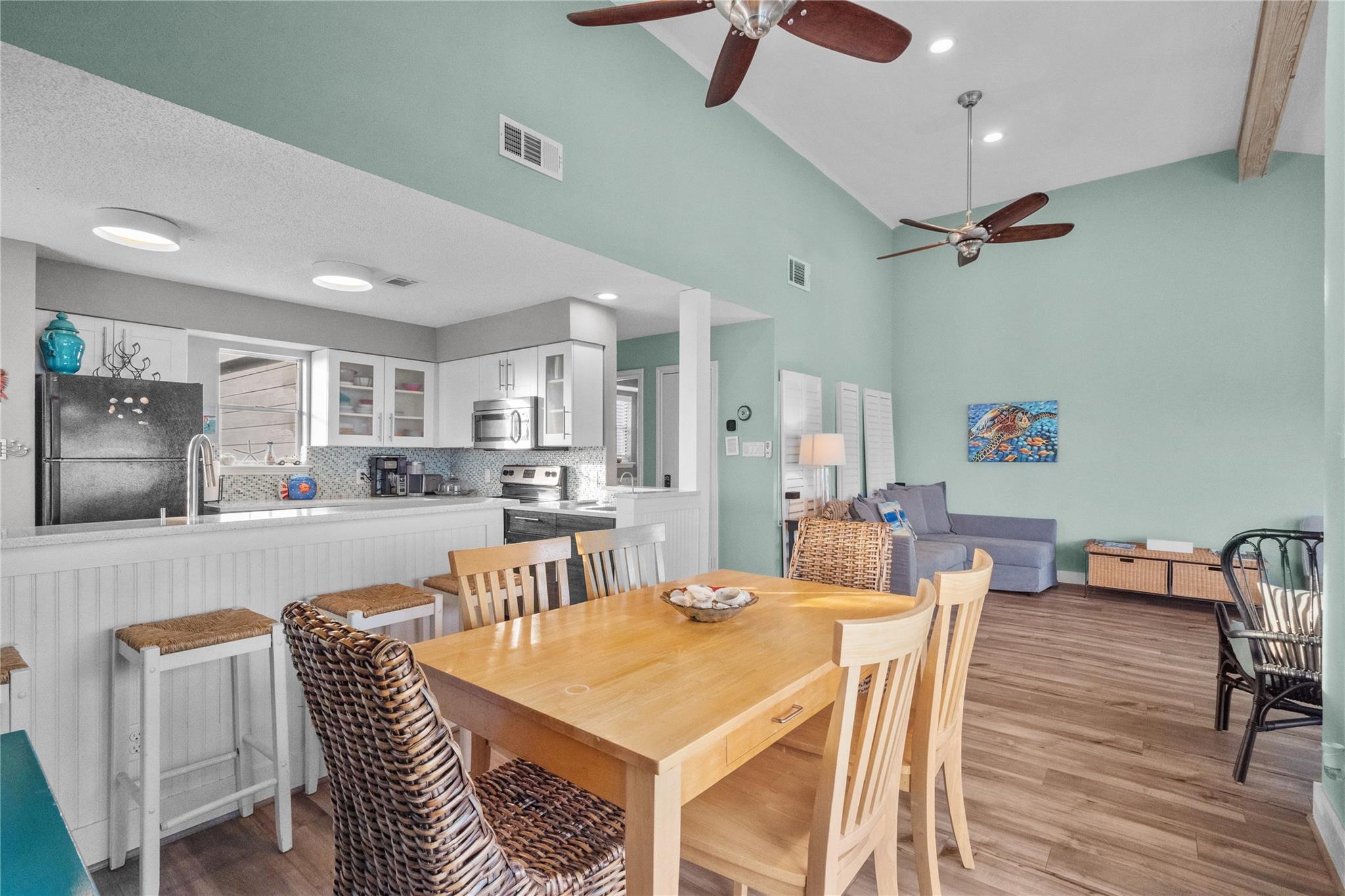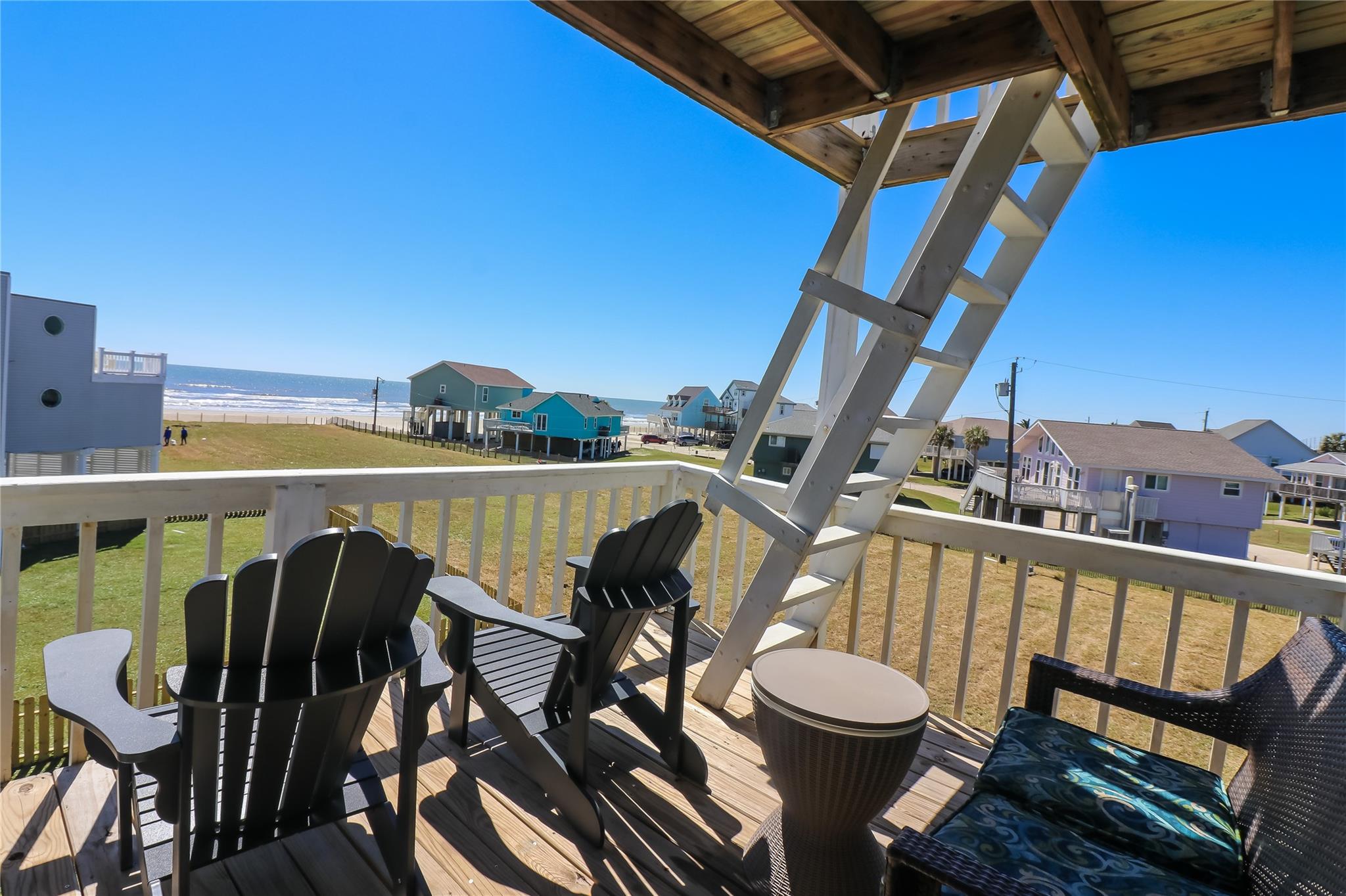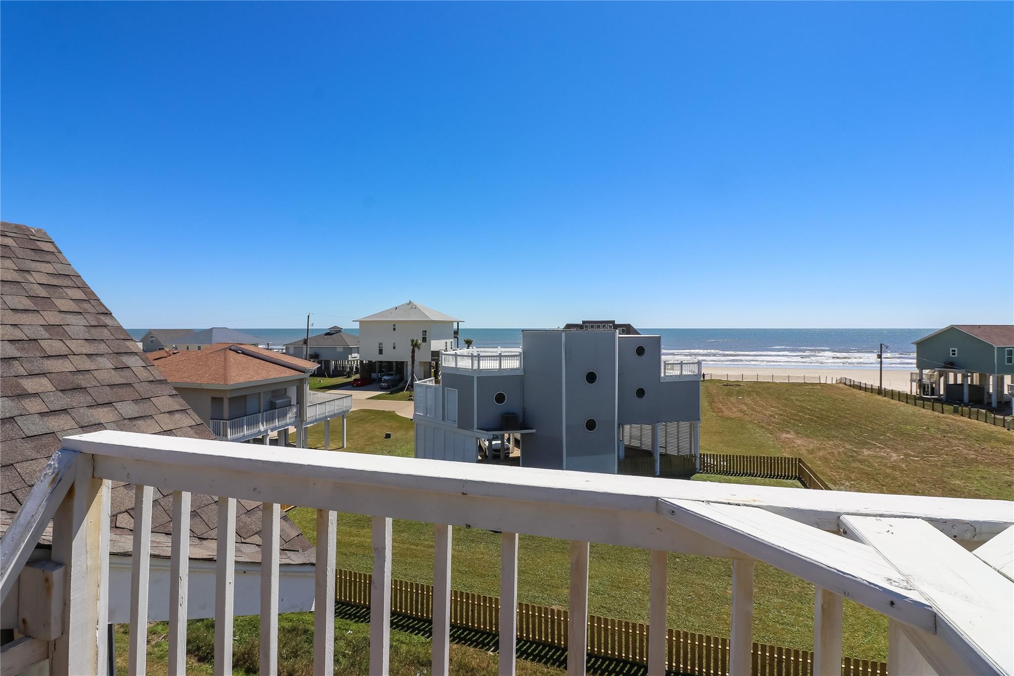 You have arrived at your new Beach Home! Located 3 rows from the sand on Karankawa Beach in Galveston, featuring Panaramic, Unobstructed, Gulf Views, this 3 bedroom/ 3 full bath townhome offers buyers a rare opportunity to become part of this unique, small beach community. This unique property floor plan was designed for entertaining and relaxing by the beach. The split level. Upstairs features an updated kitchen, stainless steel appliances that convey (refrigerator new in 2025). Cozy living room/ vaulted ceilings, 1 bath up. Bedrooms are on the 1st floor. Primary with deck access. Very low HOA fee. West End corner UNIT. Luxury Vinyl Plank floors, Quartz countertops, impact rated patio door, Ample storage, large capacity washer/ dryer. Large pets are welcome. 3 Decks. Covered parking for up to 3 mid-sized vehicles. Exterior storage unit. New roof 3/25. Active short-term rental with great proforma records. Sold fully furnished.
