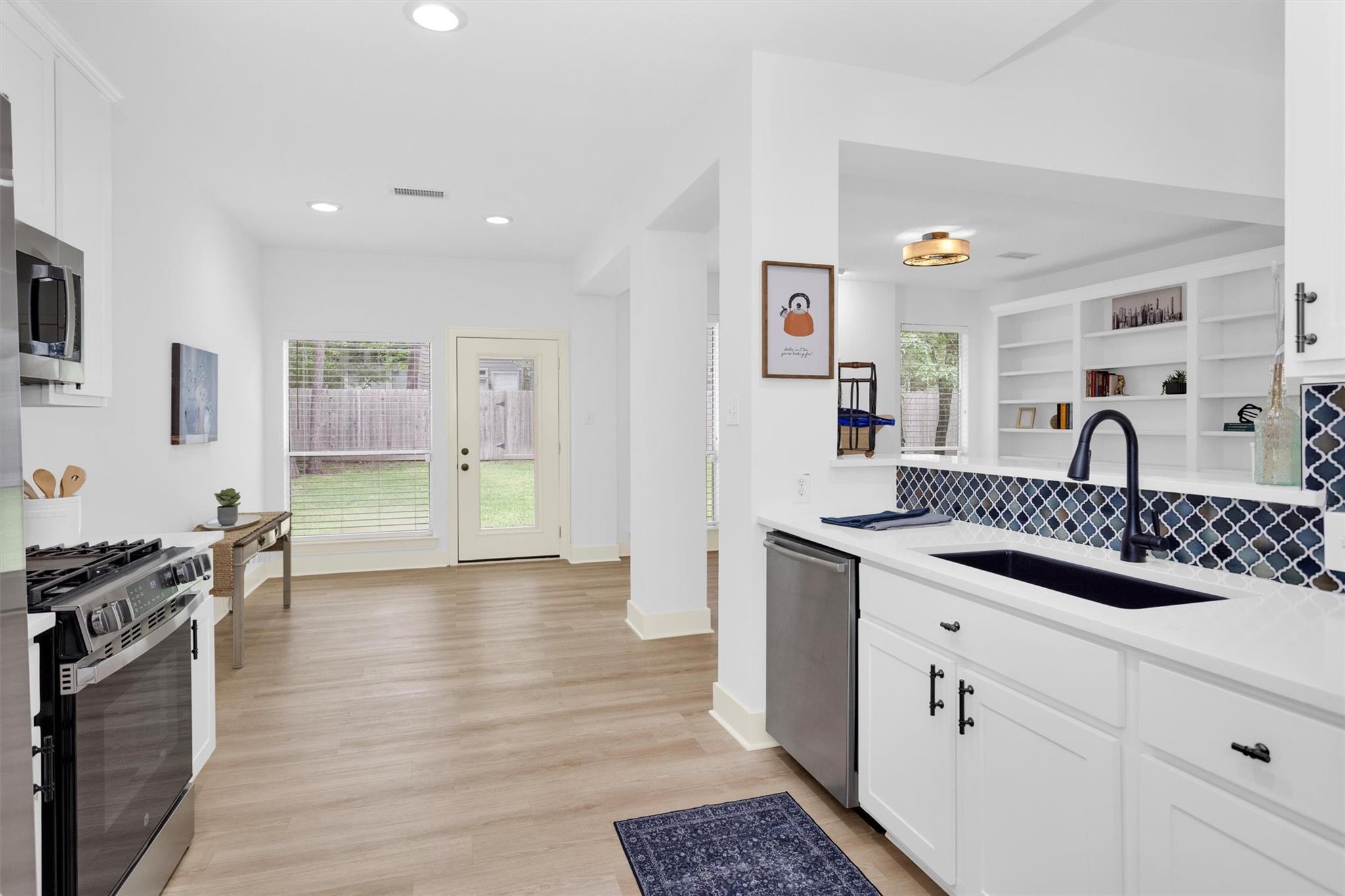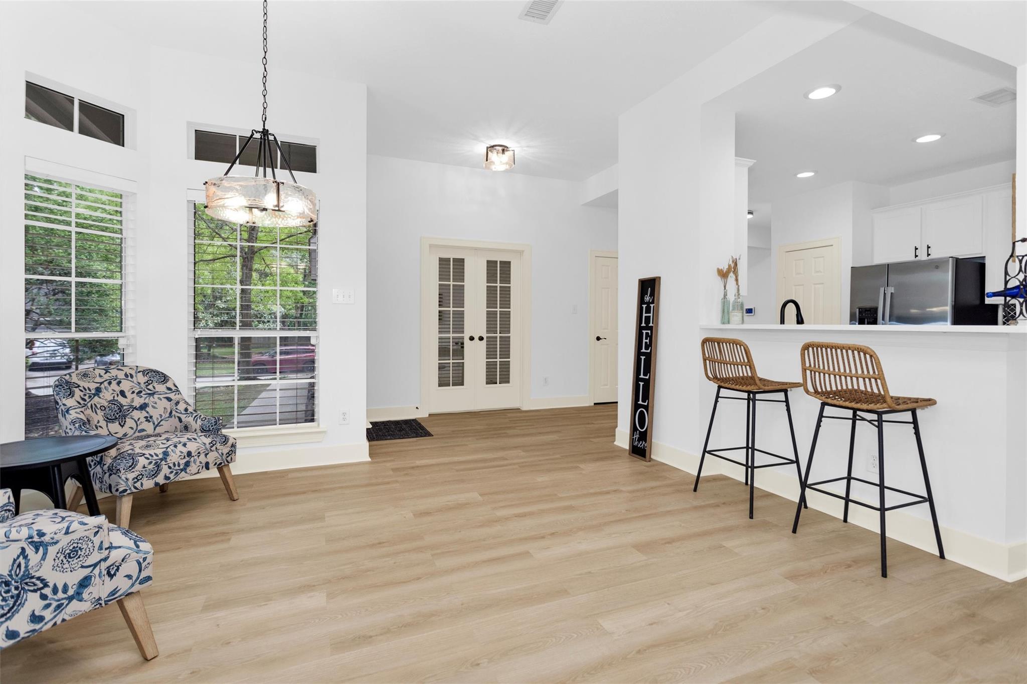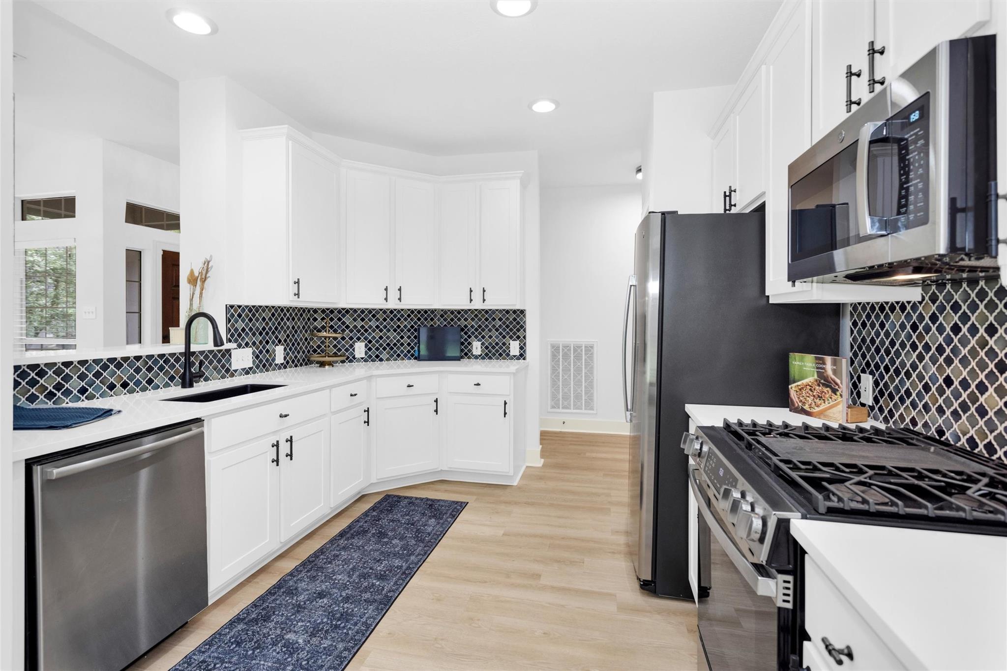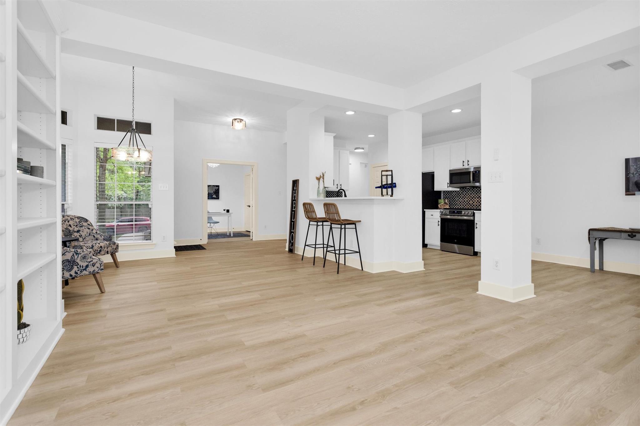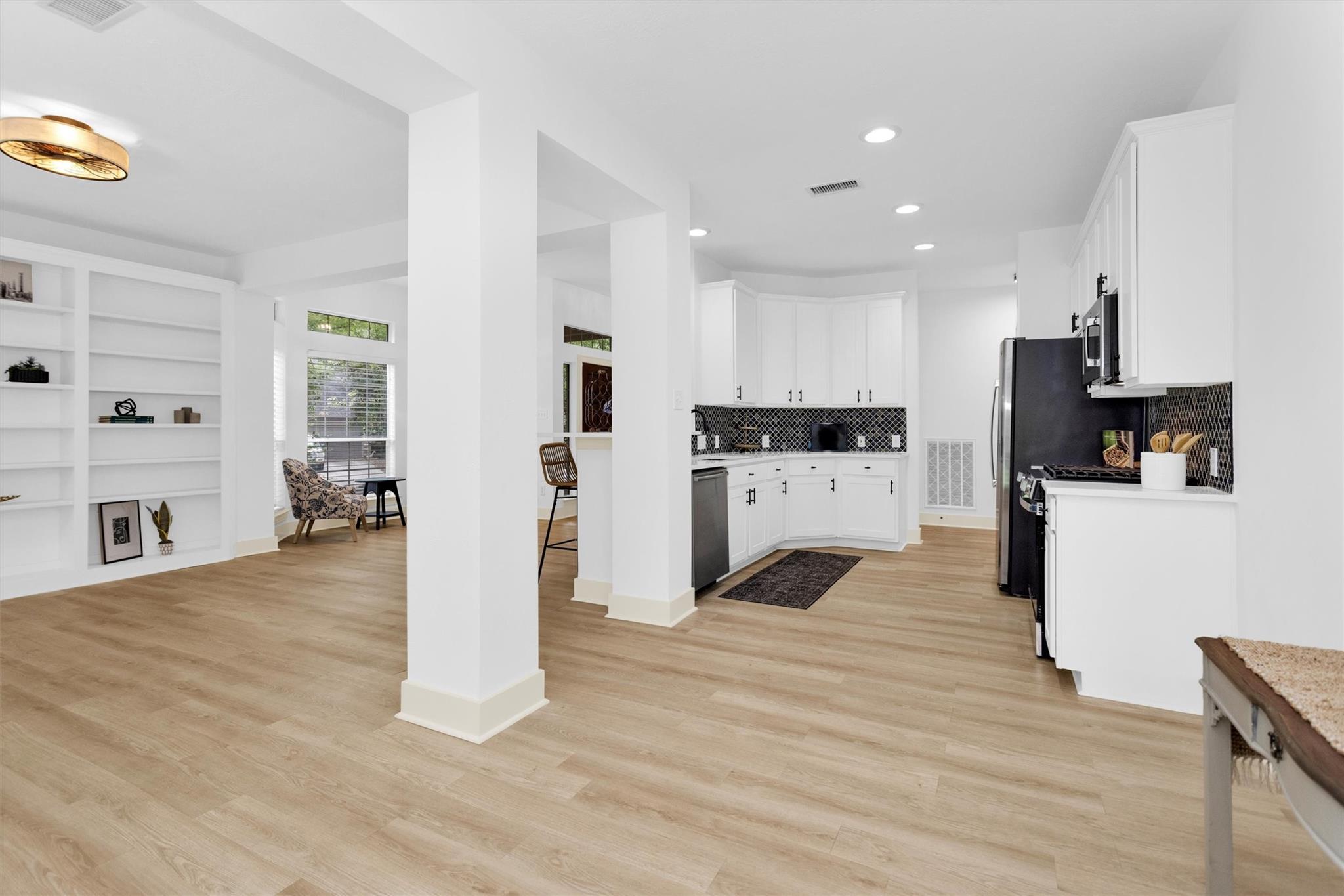Charming, fully renovated 1-story townhome on 10,000+ sf corner wooded lot—one of the largest in the community. 3-bed, 2-bath split plan w/2-car garage offers functional, easy living w/open dining/family spaces & great natural light. Thoughtfully updated w/cohesive modern design & curated finishes throughout—luxury vinyl plank flooring, wood trim, fresh paint, pony wall removed to open main living, lighting, blinds & hardware. Kitchen remodel includes quartz counters, custom cabinet doors, mosaic backsplash, stainless appliance package (incl refrigerator) & deep single-basin sink. Primary suite w/vaulted ceiling & fully renovated bath featuring warm wood vanity, quartz counters, matte black fixtures, freestanding soaking tub, glass shower & custom tile surround. Secondary bath fully remodeled w/quartz-topped wood vanity, matte black fixtures, subway tile surround & niche storage. HOA maintains exterior, roof & front yard—low-maintenance, close to parks, trails, shopping & schools.