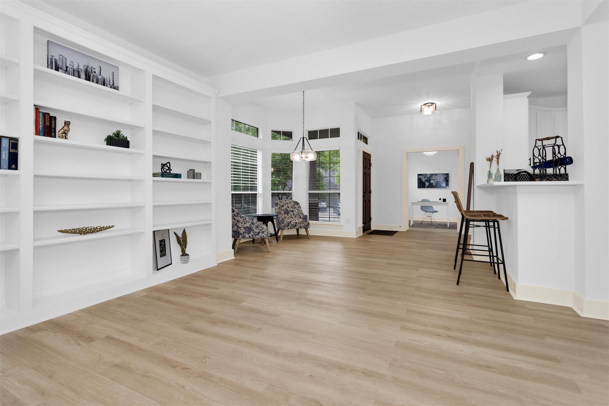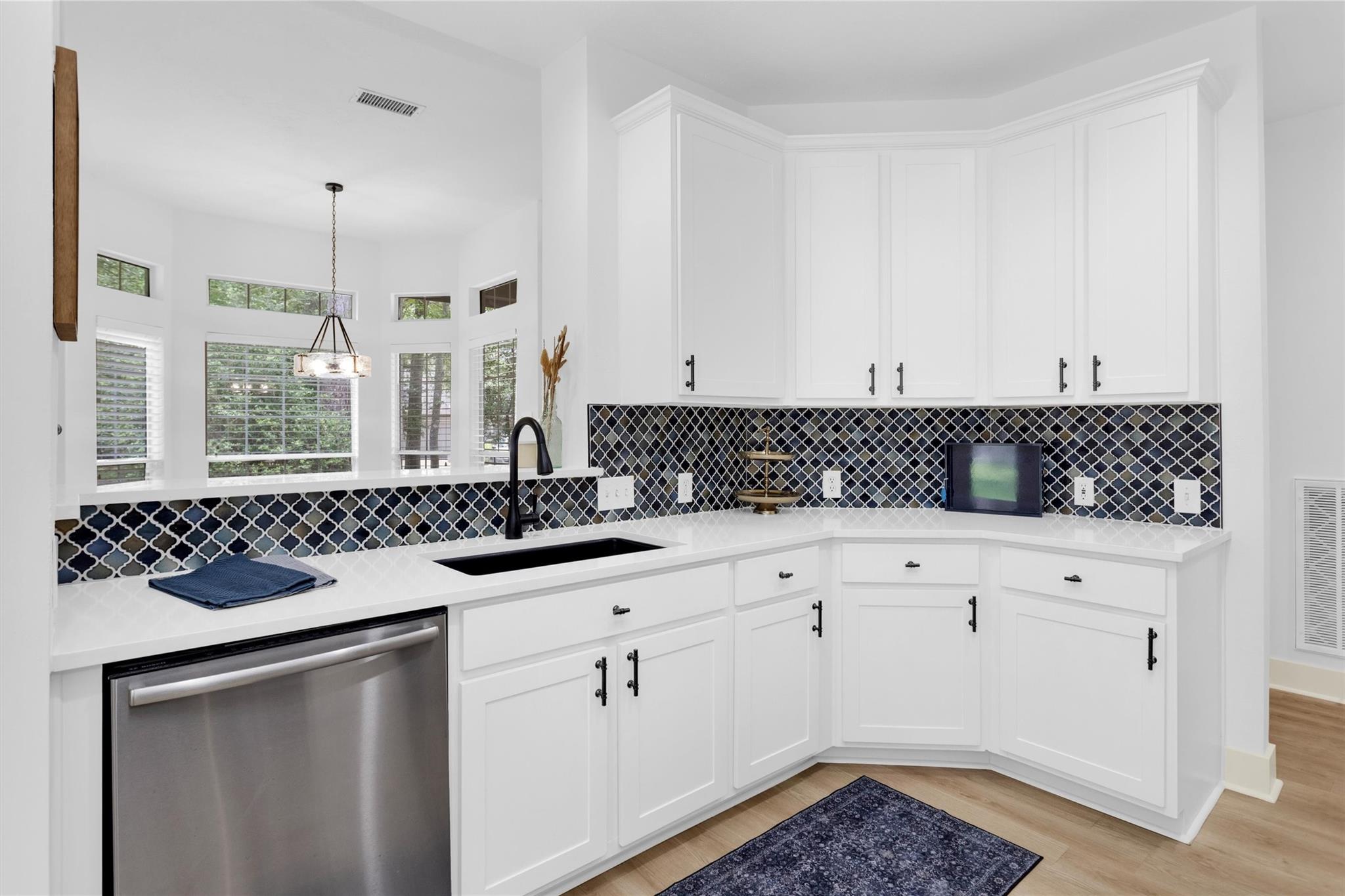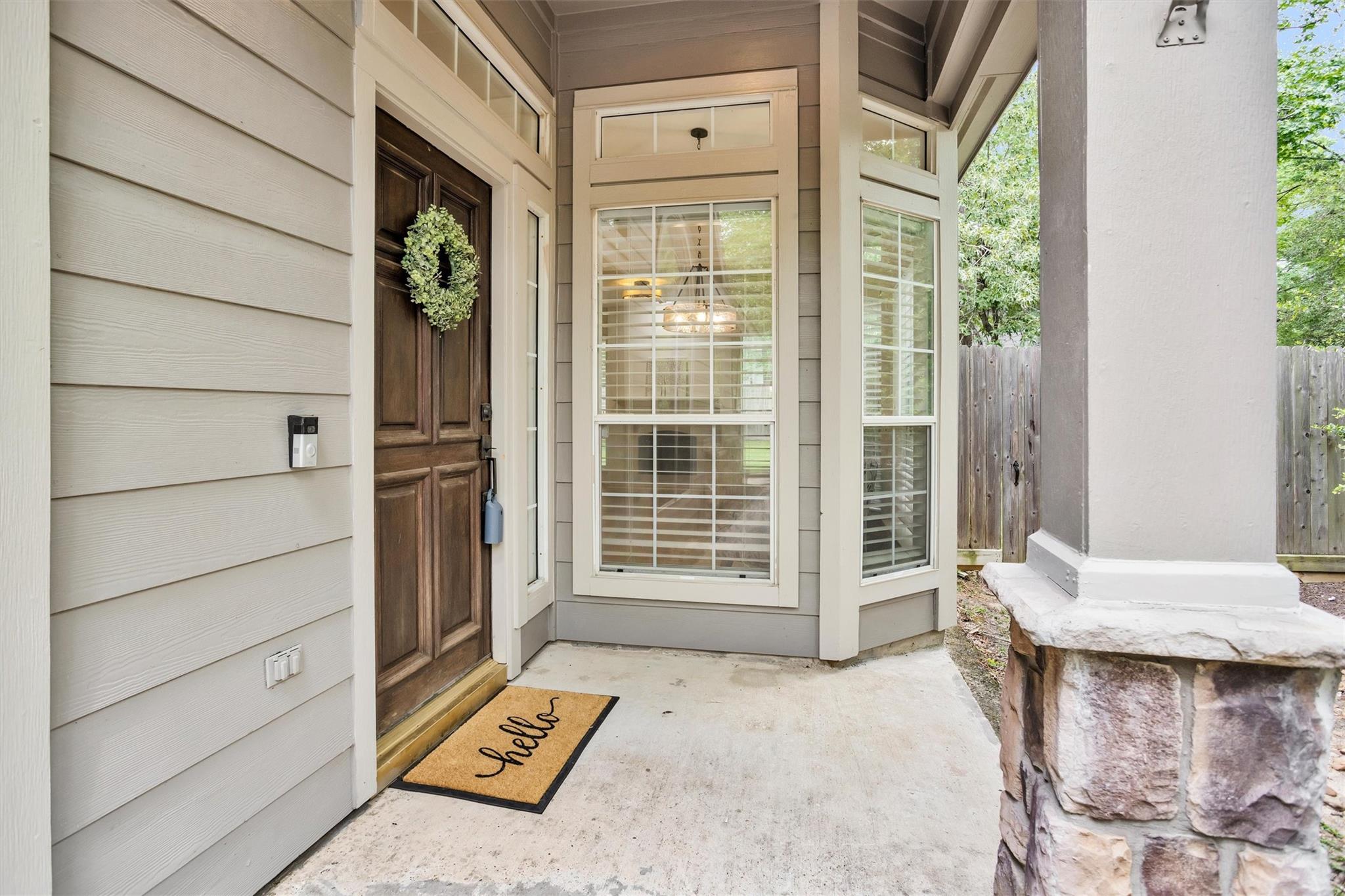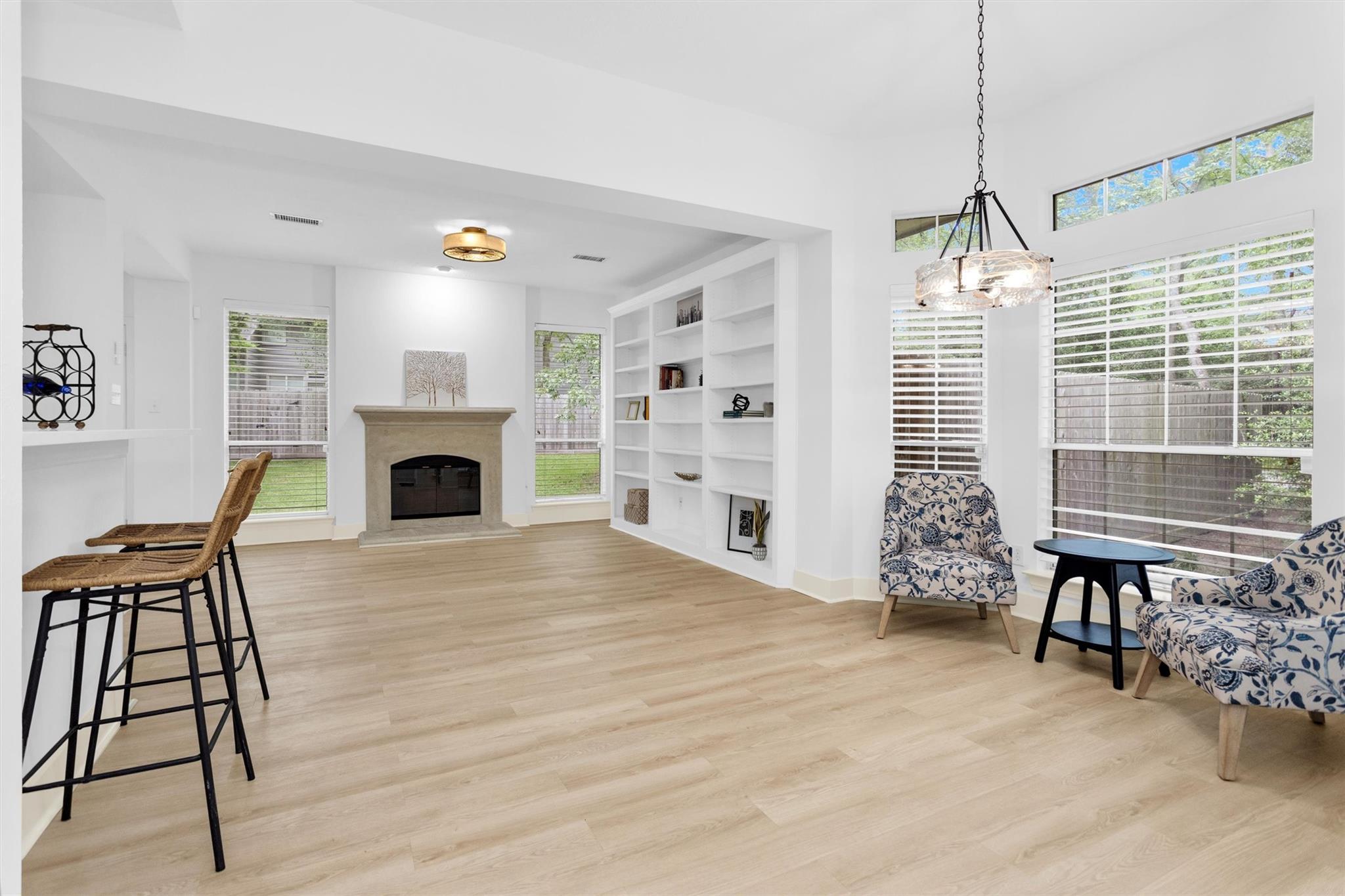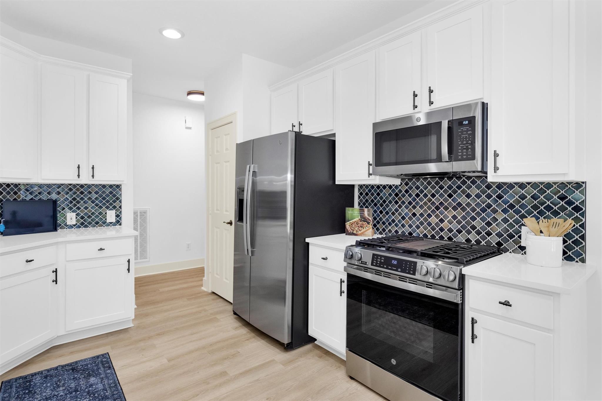 Charming, fully renovated 1-story townhome on 10,000+ sf corner wooded lot—one of the largest in the community. 3-bed, 2-bath split plan w/2-car garage offers functional, easy living w/open dining/family spaces & great natural light. Thoughtfully updated w/cohesive modern design & curated finishes throughout—luxury vinyl plank flooring, wood trim, fresh paint, pony wall removed to open main living, lighting, blinds & hardware. Kitchen remodel includes quartz counters, custom cabinet doors, mosaic backsplash, stainless appliance package (incl refrigerator) & deep single-basin sink. Primary suite w/vaulted ceiling & fully renovated bath featuring warm wood vanity, quartz counters, matte black fixtures, freestanding soaking tub, glass shower & custom tile surround. Secondary bath fully remodeled w/quartz-topped wood vanity, matte black fixtures, subway tile surround & niche storage. HOA maintains exterior, roof & front yard—low-maintenance, close to parks, trails, shopping & schools.