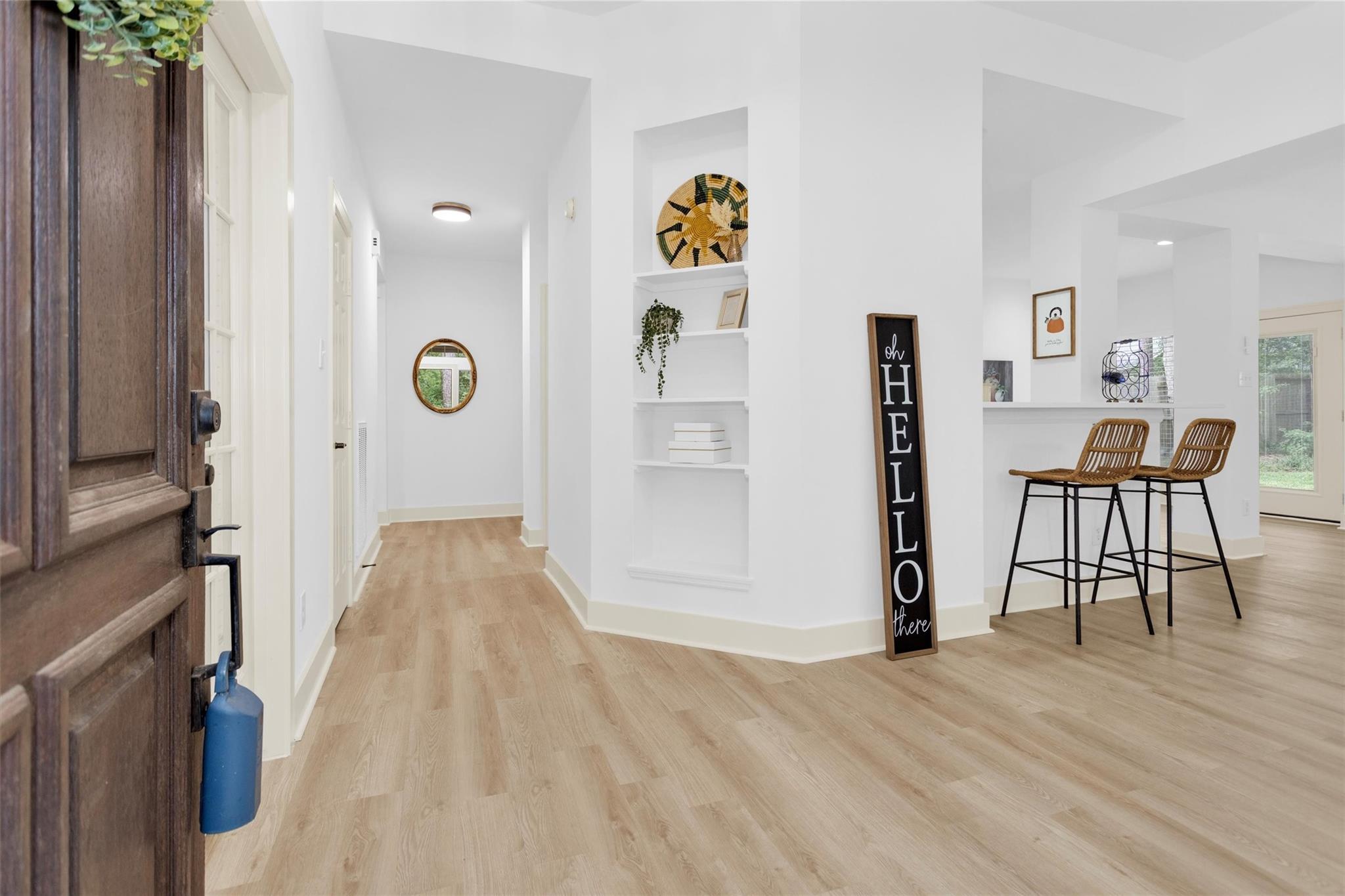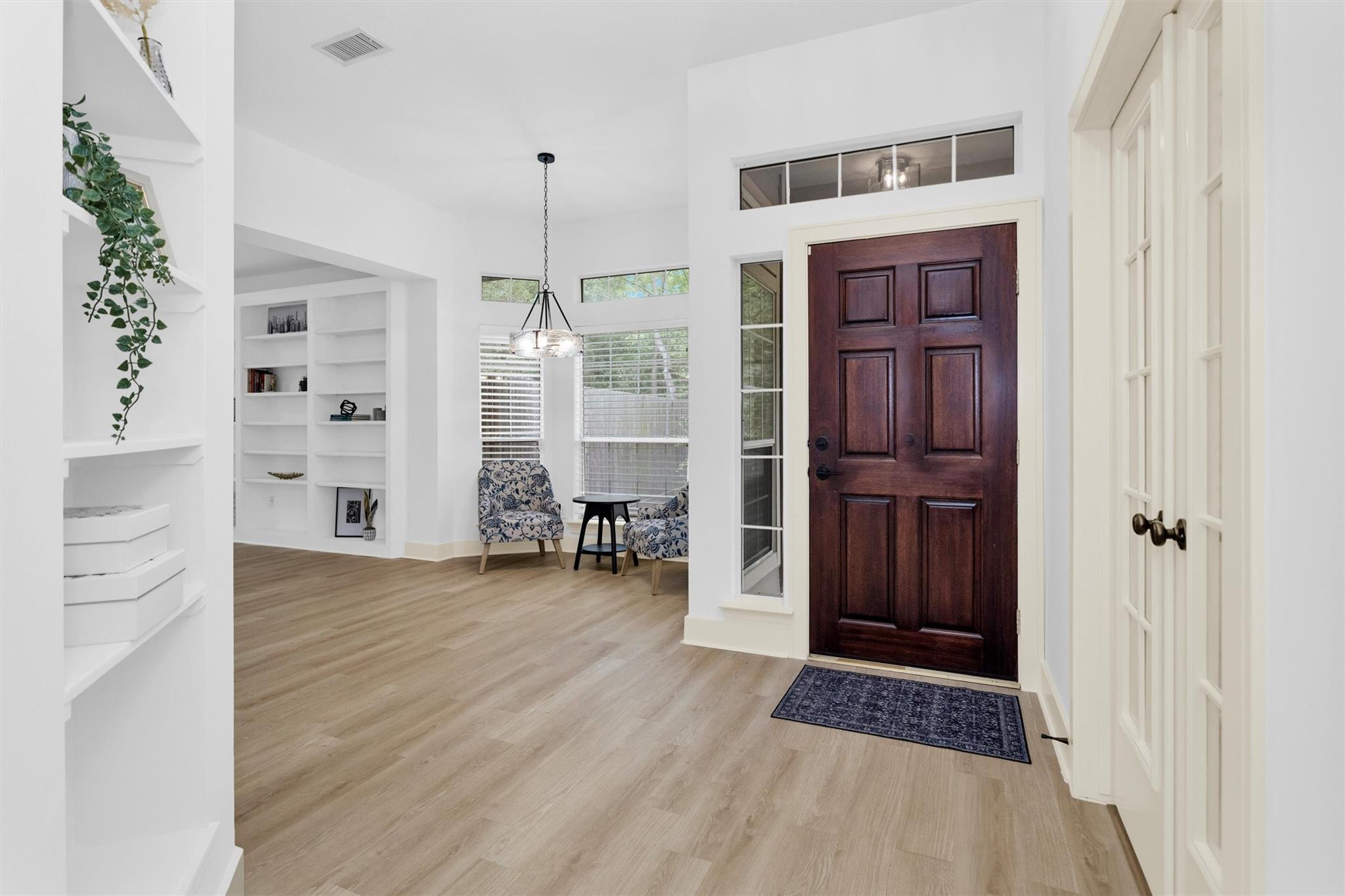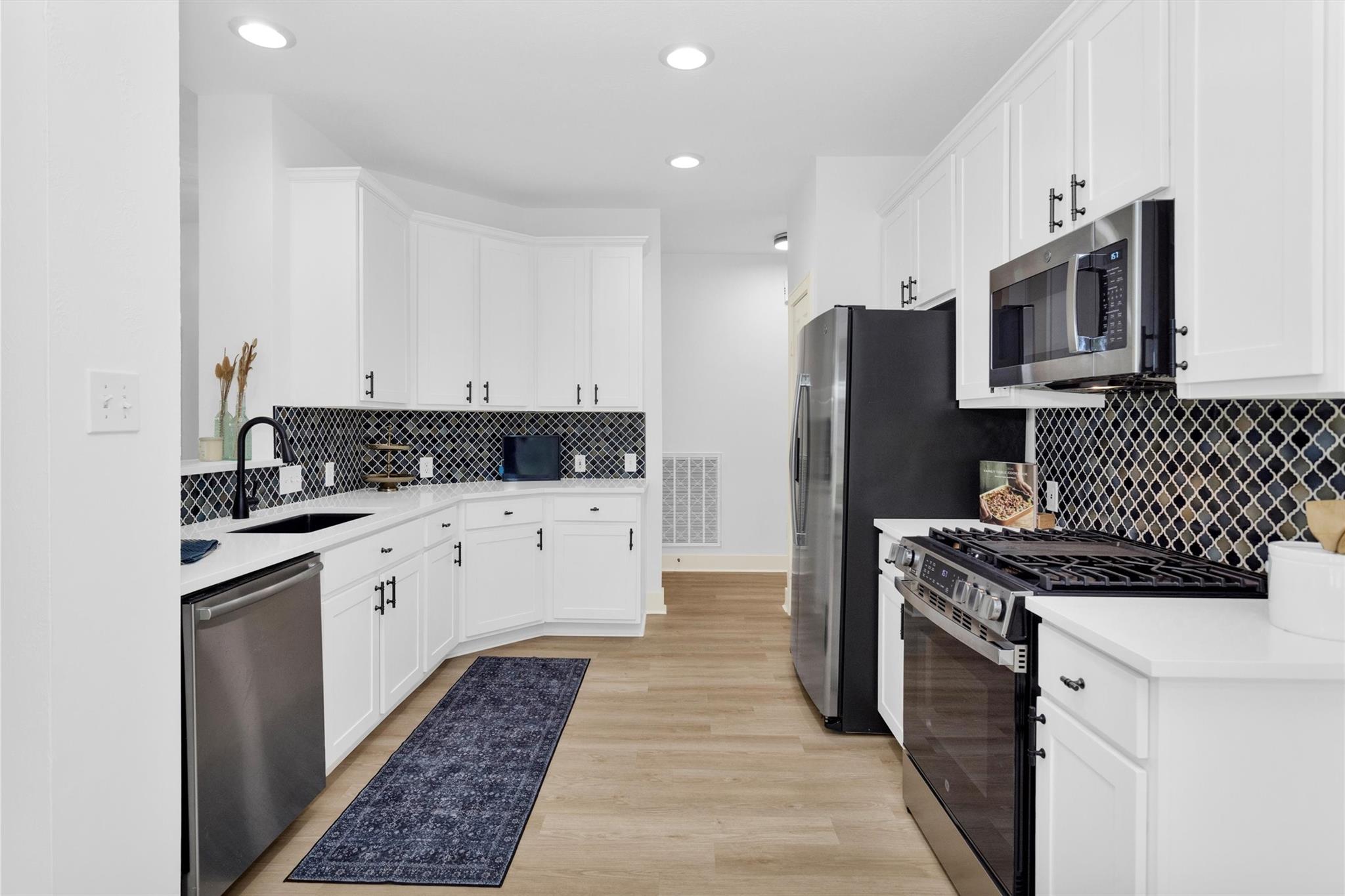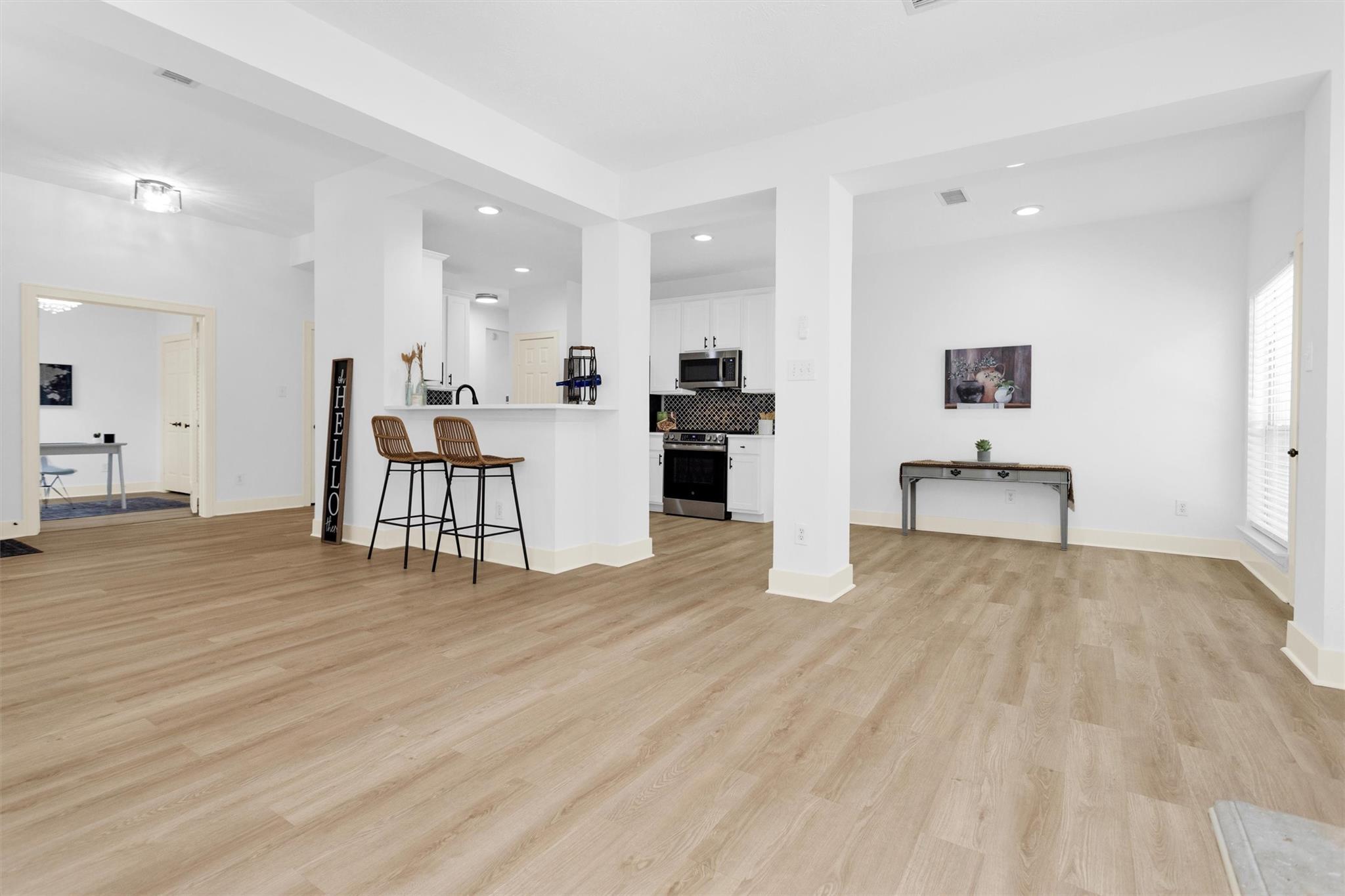 Charming, fully renovated 1-story townhome on 10,000+ sf corner wooded lot—one of the largest in the community. 3-bed, 2-bath split plan w/2-car garage offers functional, easy living w/open dining/family spaces & great natural light. Thoughtfully updated w/cohesive modern design & curated finishes throughout—luxury vinyl plank flooring, wood trim, fresh paint, pony wall removed to open main living, lighting, blinds & hardware. Kitchen remodel includes quartz counters, custom cabinet doors, mosaic backsplash, stainless appliance package (incl refrigerator) & deep single-basin sink. Primary suite w/vaulted ceiling & fully renovated bath featuring warm wood vanity, quartz counters, matte black fixtures, freestanding soaking tub, glass shower & custom tile surround. Secondary bath fully remodeled w/quartz-topped wood vanity, matte black fixtures, subway tile surround & niche storage. HOA maintains exterior, roof & front yard—low-maintenance, close to parks, trails, shopping & schools.