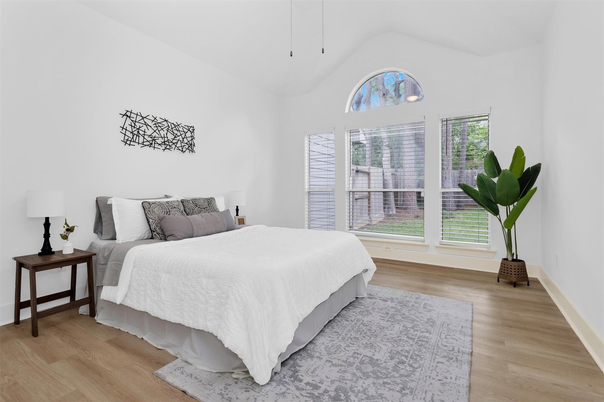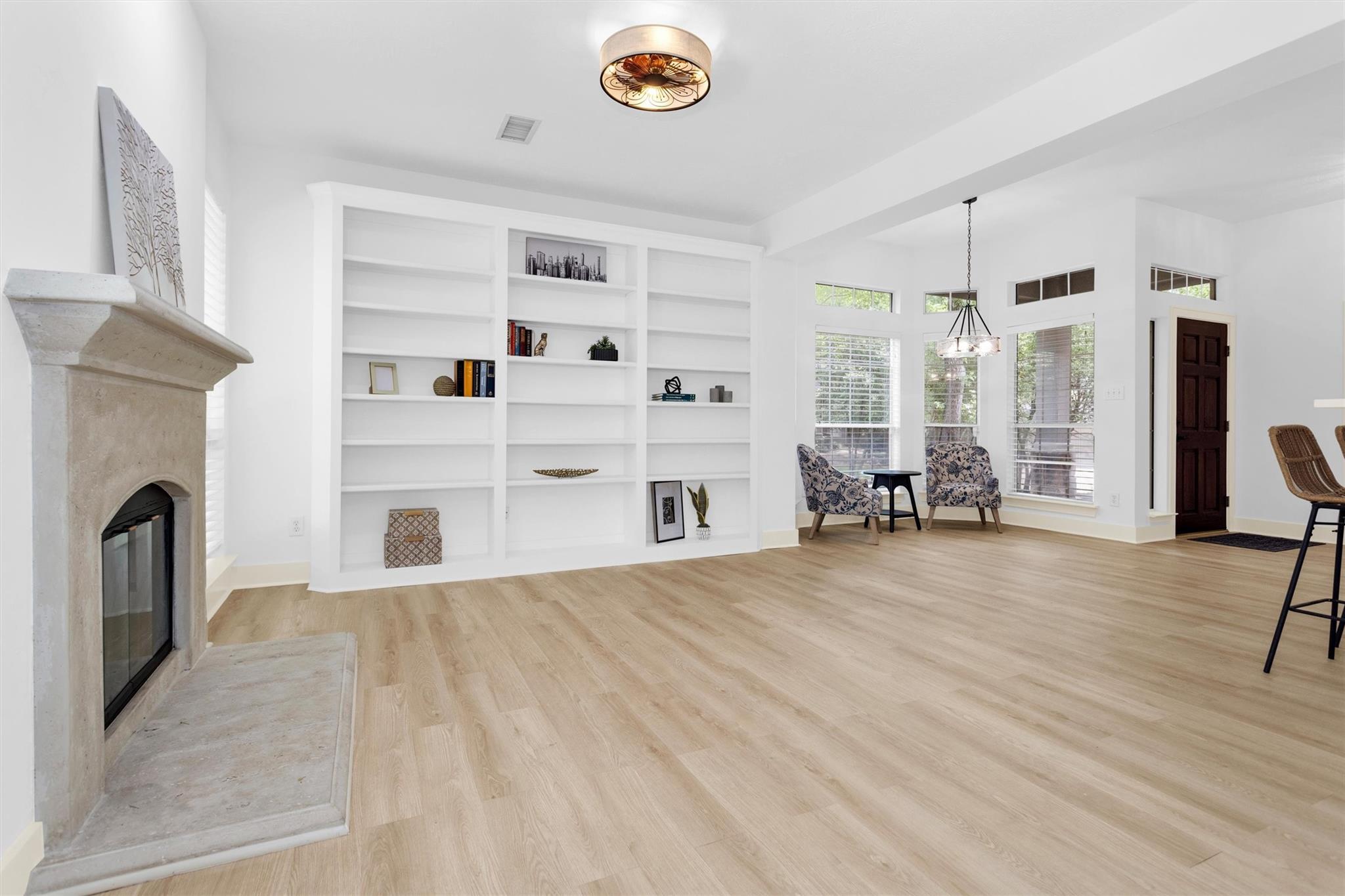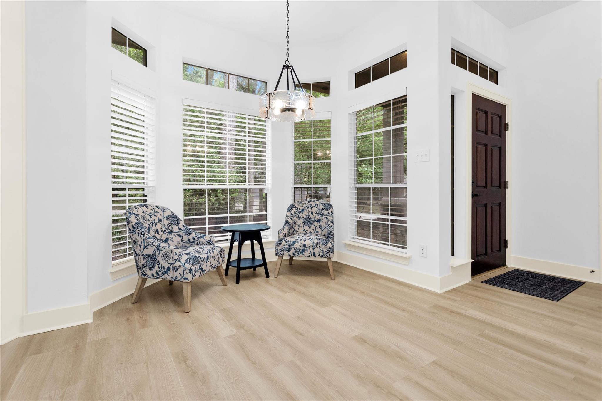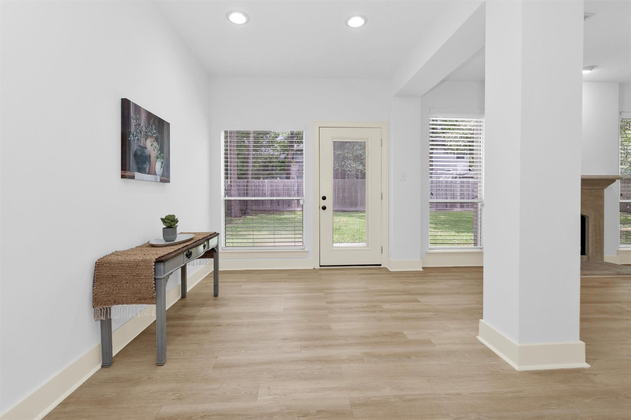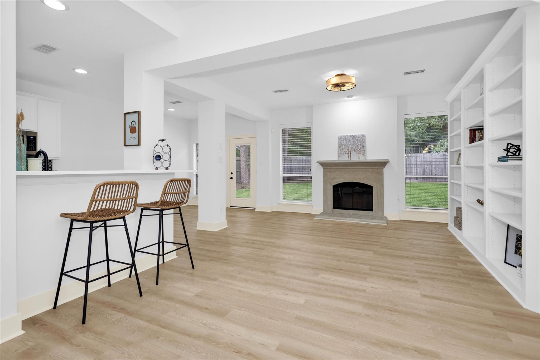 Charming, fully renovated 1-story townhome on 10,000+ sf corner wooded lot—one of the largest in the community. 3-bed, 2-bath split plan w/2-car garage offers functional, easy living w/open dining/family spaces & great natural light. Thoughtfully updated w/cohesive modern design & curated finishes throughout—luxury vinyl plank flooring, wood trim, fresh paint, pony wall removed to open main living, lighting, blinds & hardware. Kitchen remodel includes quartz counters, custom cabinet doors, mosaic backsplash, stainless appliance package (incl refrigerator) & deep single-basin sink. Primary suite w/vaulted ceiling & fully renovated bath featuring warm wood vanity, quartz counters, matte black fixtures, freestanding soaking tub, glass shower & custom tile surround. Secondary bath fully remodeled w/quartz-topped wood vanity, matte black fixtures, subway tile surround & niche storage. HOA maintains exterior, roof & front yard—low-maintenance, close to parks, trails, shopping & schools.