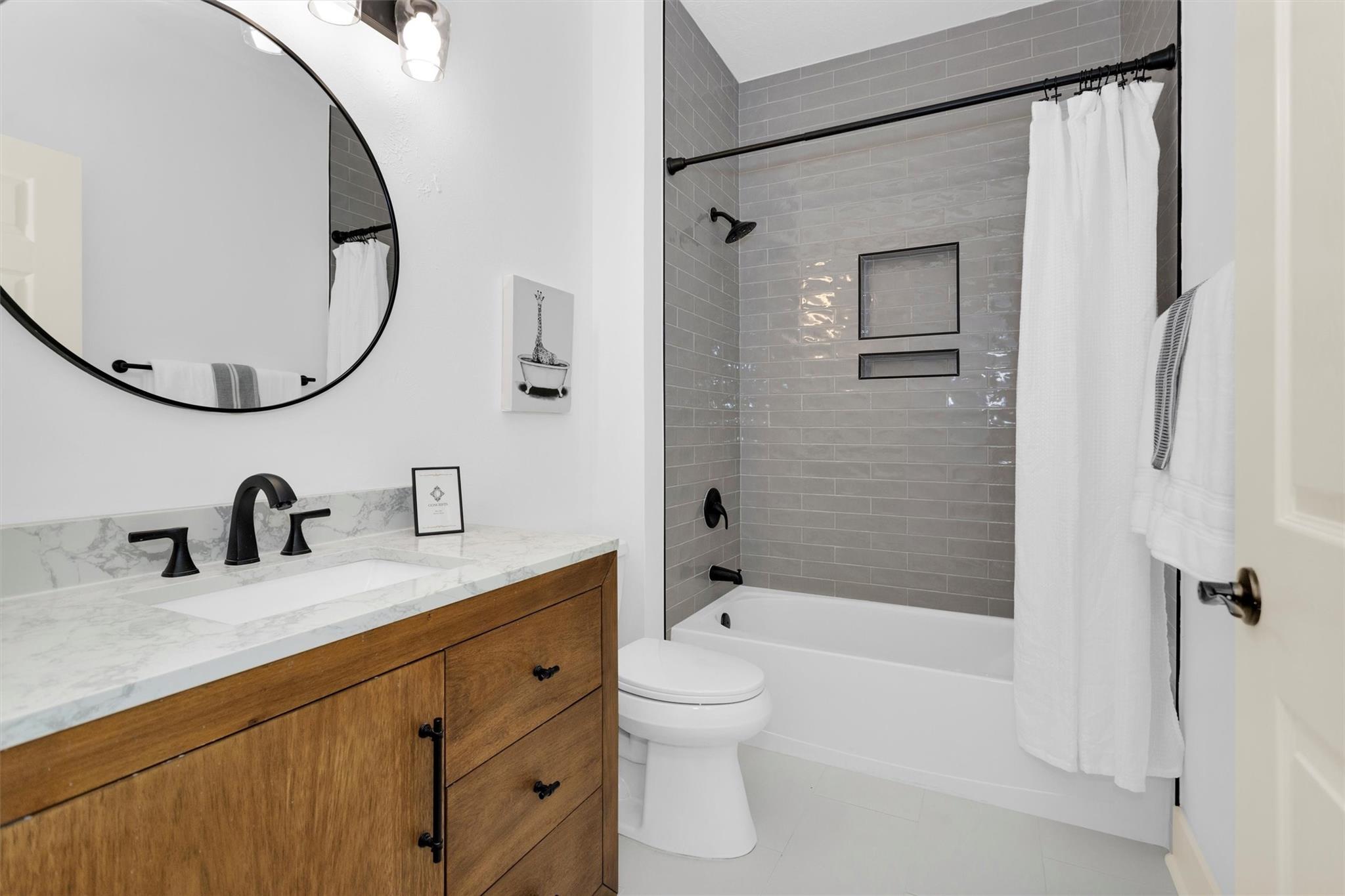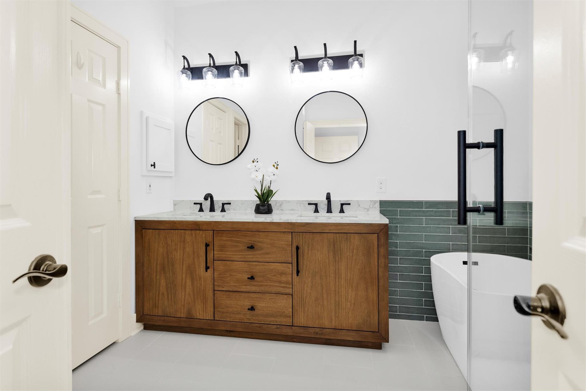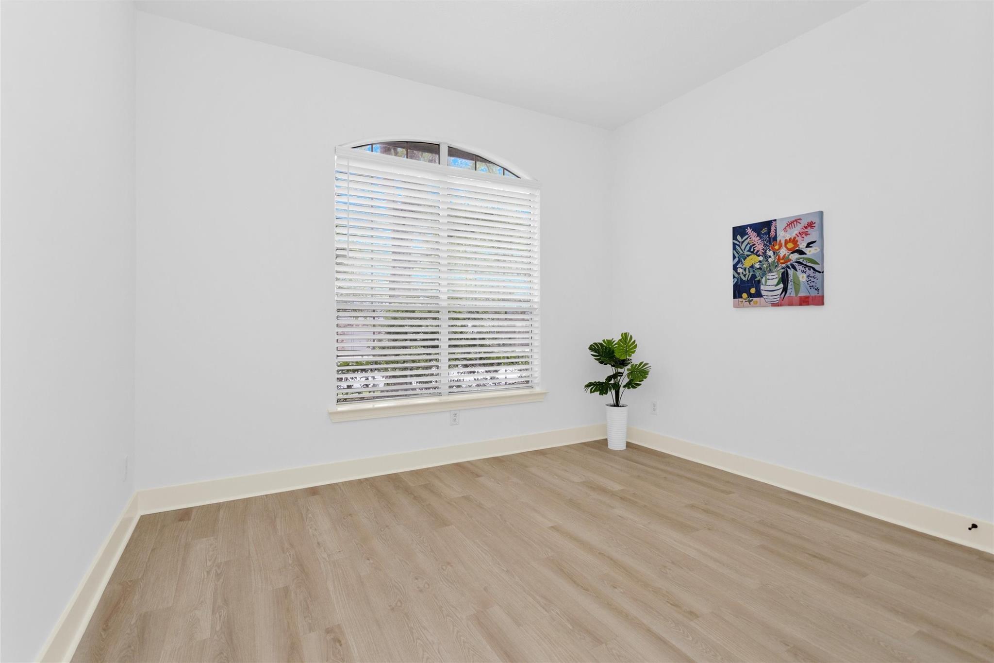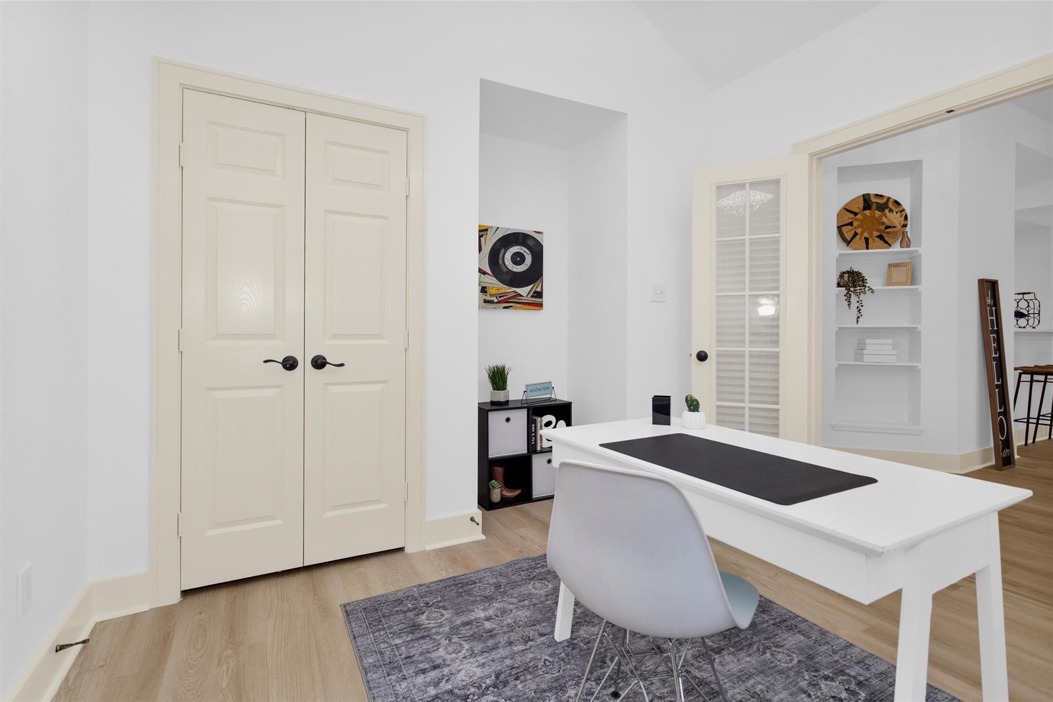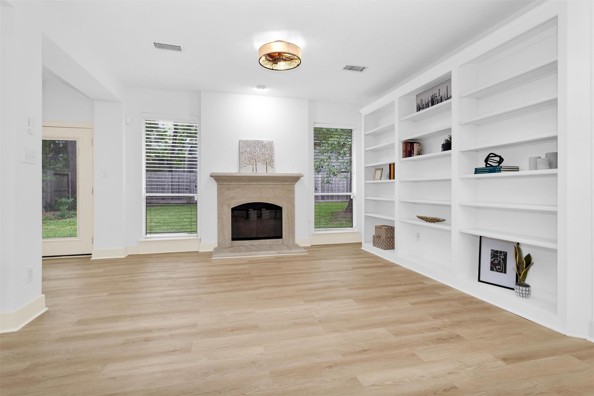 Charming, fully renovated 1-story townhome on 10,000+ sf corner wooded lot—one of the largest in the community. 3-bed, 2-bath split plan w/2-car garage offers functional, easy living w/open dining/family spaces & great natural light. Thoughtfully updated w/cohesive modern design & curated finishes throughout—luxury vinyl plank flooring, wood trim, fresh paint, pony wall removed to open main living, lighting, blinds & hardware. Kitchen remodel includes quartz counters, custom cabinet doors, mosaic backsplash, stainless appliance package (incl refrigerator) & deep single-basin sink. Primary suite w/vaulted ceiling & fully renovated bath featuring warm wood vanity, quartz counters, matte black fixtures, freestanding soaking tub, glass shower & custom tile surround. Secondary bath fully remodeled w/quartz-topped wood vanity, matte black fixtures, subway tile surround & niche storage. HOA maintains exterior, roof & front yard—low-maintenance, close to parks, trails, shopping & schools.