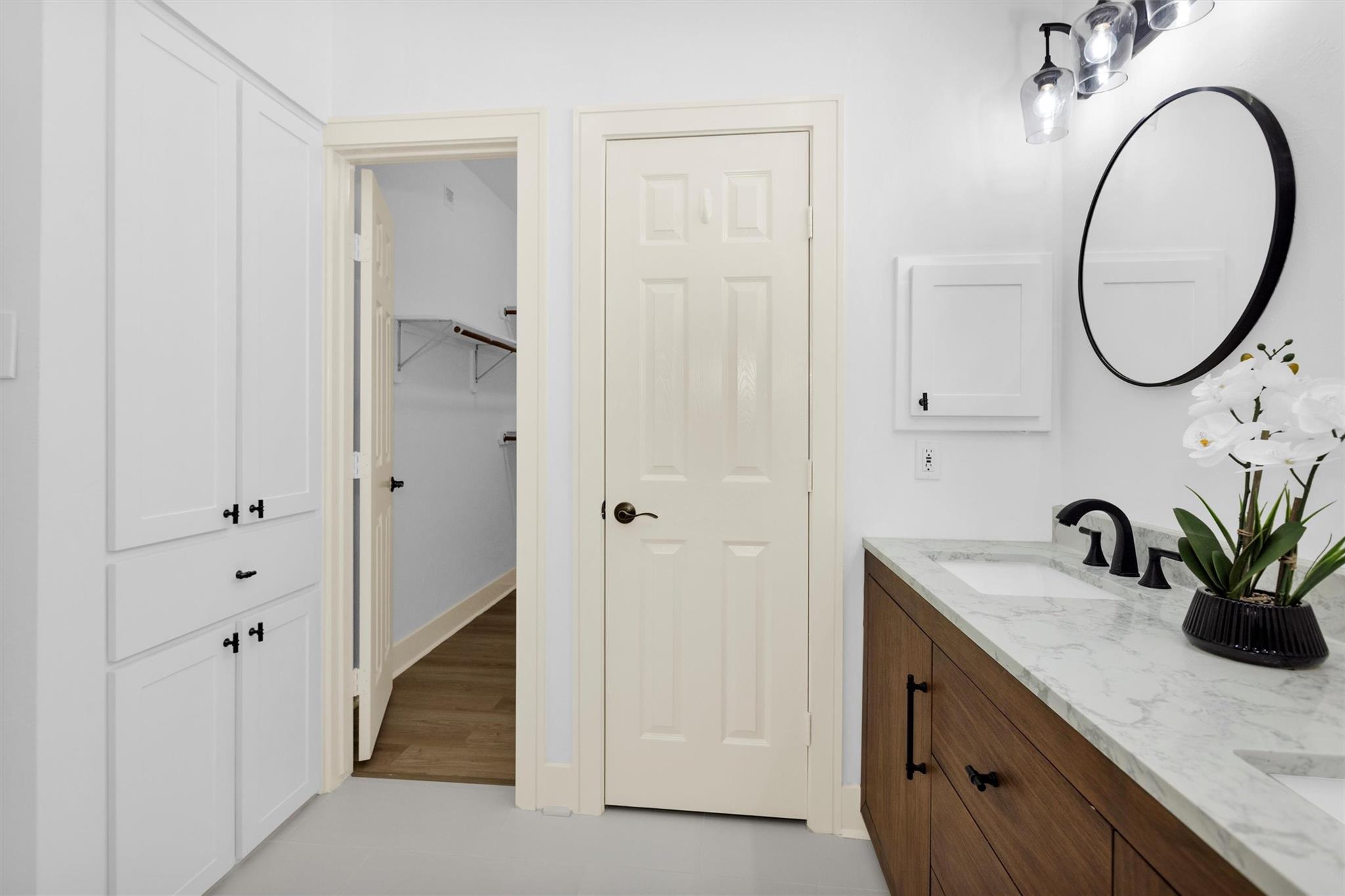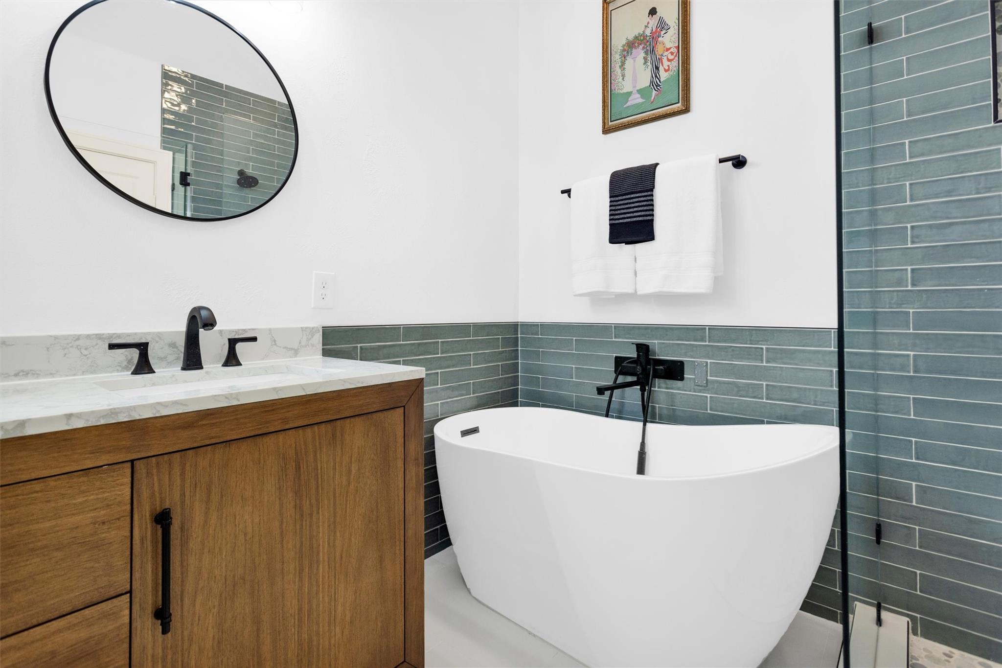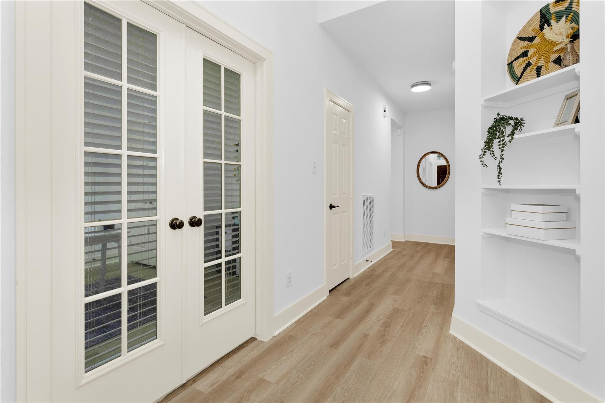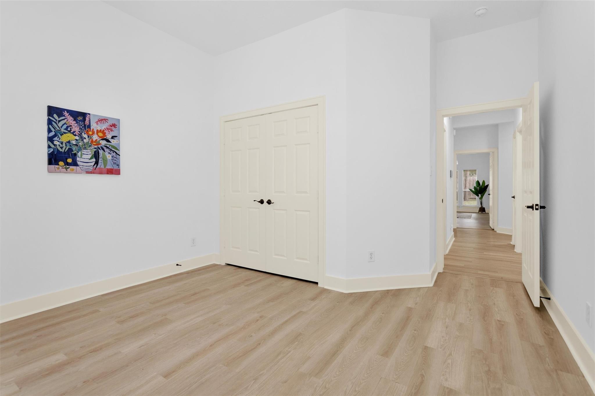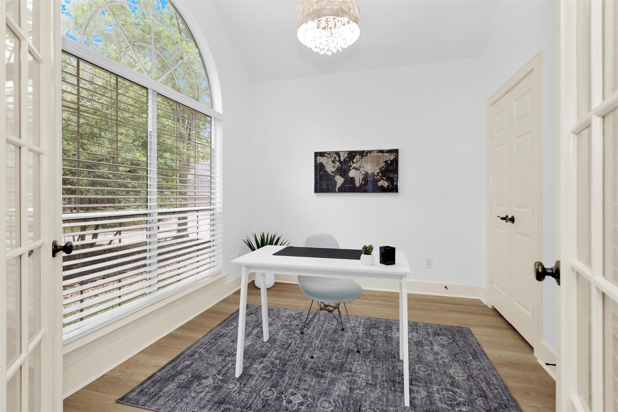Charming, fully renovated 1-story townhome on 10,000+ sf corner wooded lot—one of the largest in the community. 3-bed, 2-bath split plan w/2-car garage offers functional, easy living w/open dining/family spaces & great natural light. Thoughtfully updated w/cohesive modern design & curated finishes throughout—luxury vinyl plank flooring, wood trim, fresh paint, pony wall removed to open main living, lighting, blinds & hardware. Kitchen remodel includes quartz counters, custom cabinet doors, mosaic backsplash, stainless appliance package (incl refrigerator) & deep single-basin sink. Primary suite w/vaulted ceiling & fully renovated bath featuring warm wood vanity, quartz counters, matte black fixtures, freestanding soaking tub, glass shower & custom tile surround. Secondary bath fully remodeled w/quartz-topped wood vanity, matte black fixtures, subway tile surround & niche storage. HOA maintains exterior, roof & front yard—low-maintenance, close to parks, trails, shopping & schools.