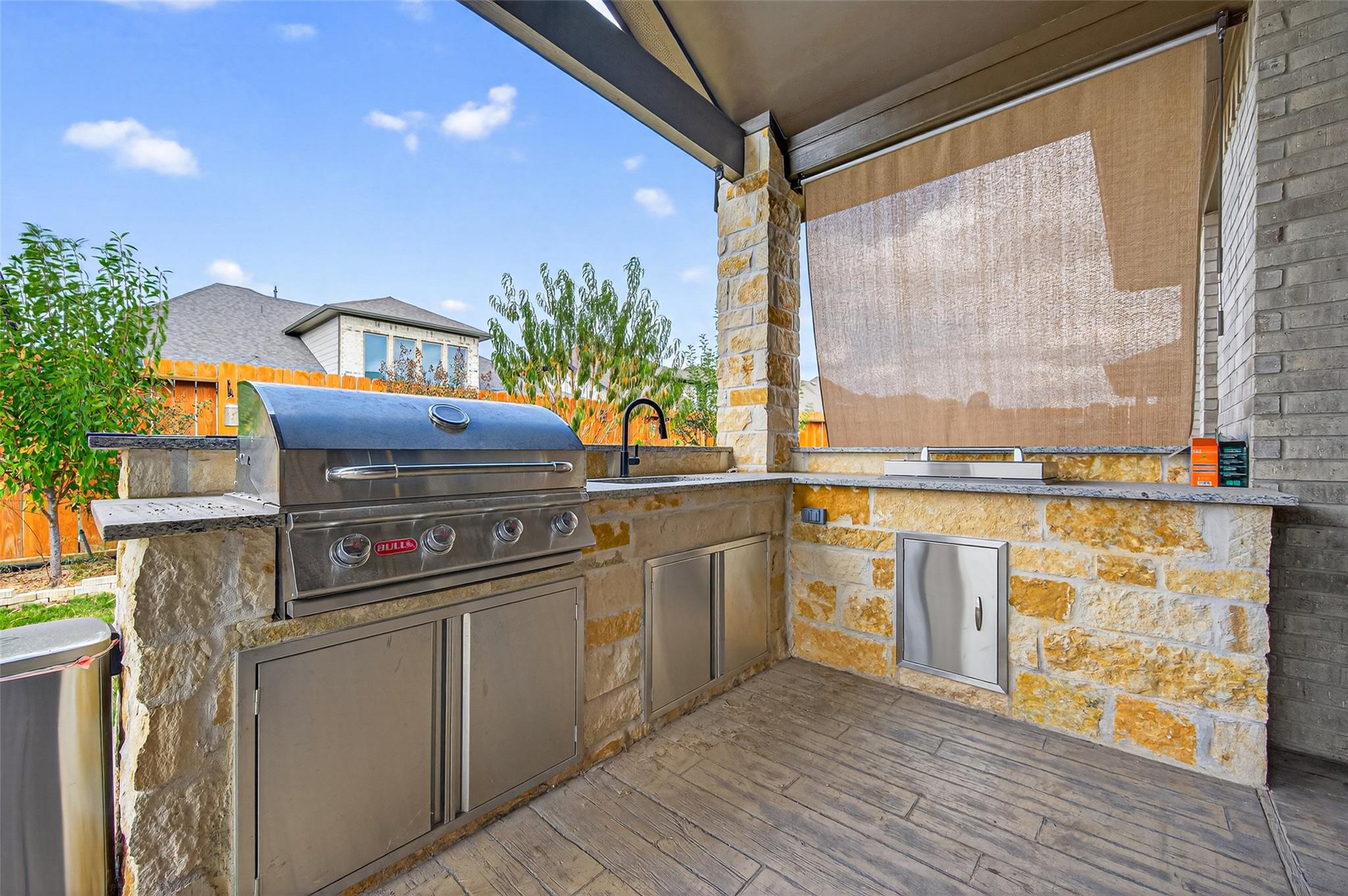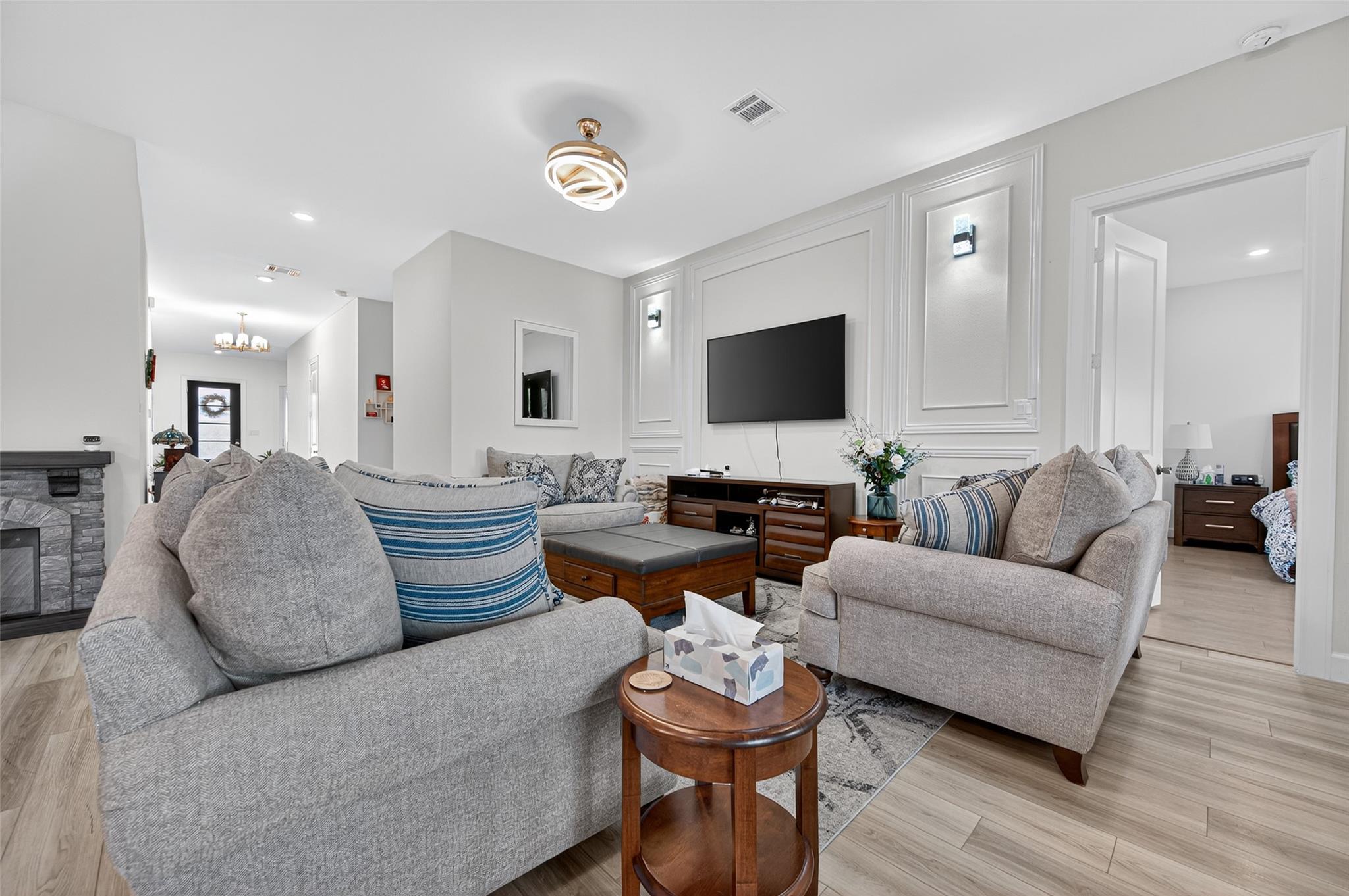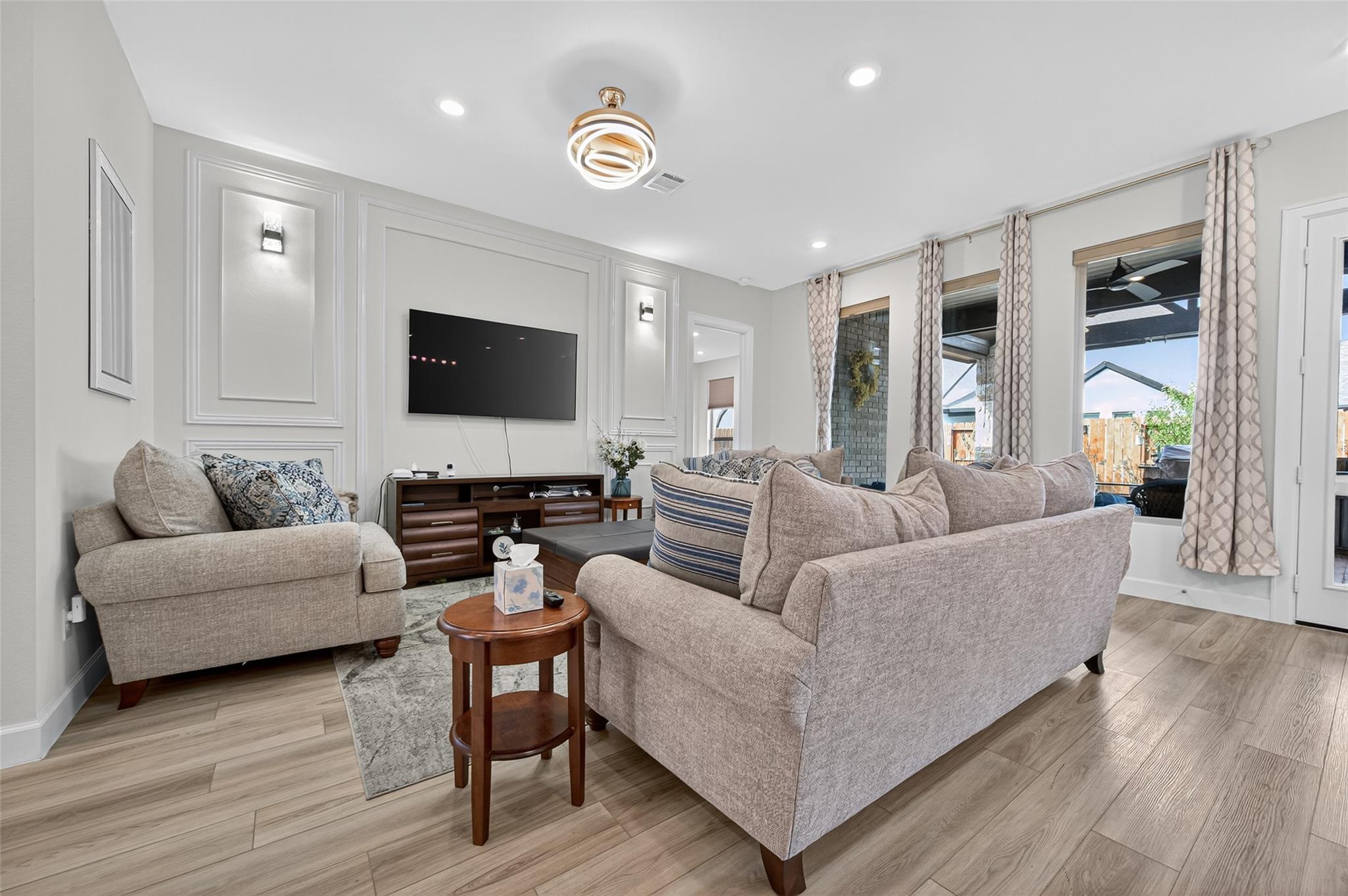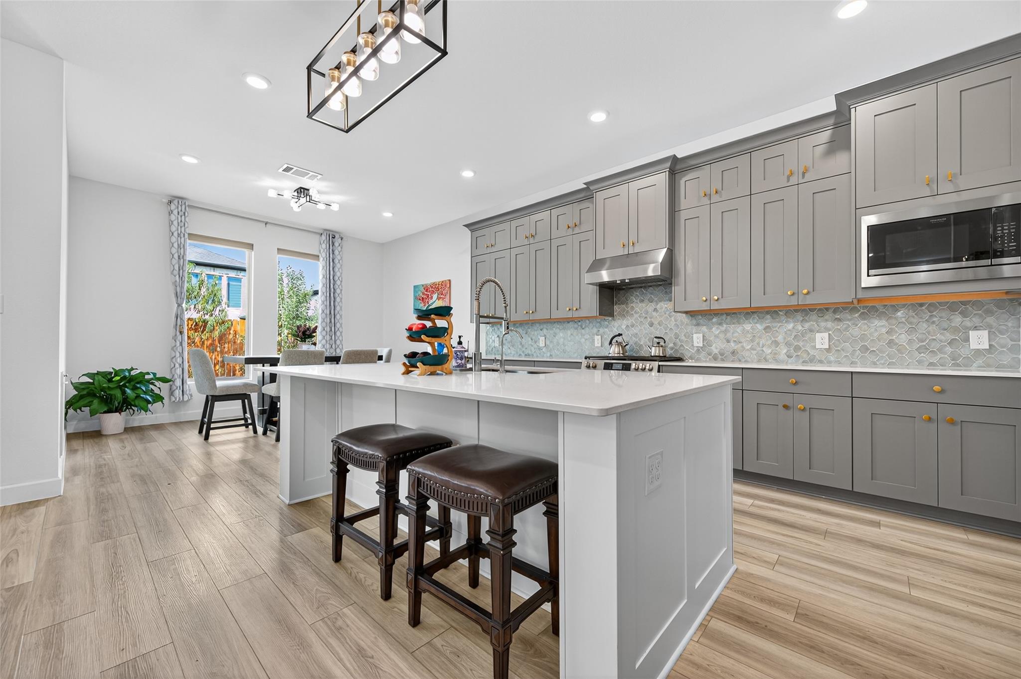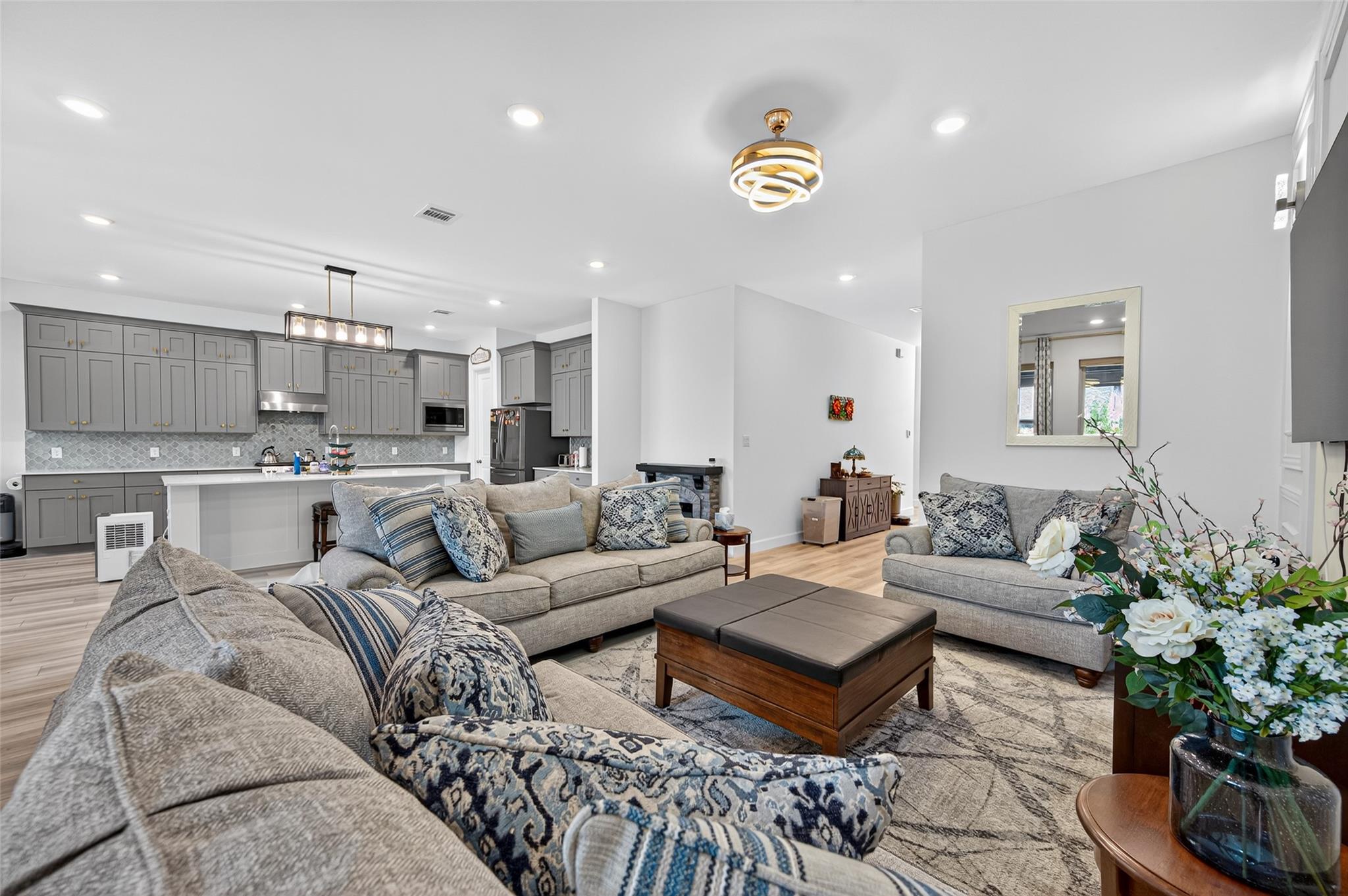 Absolutely stunning Village Builders Pinnacle Collection home in Parkside Village of Towne Lake! Only 2 years old, this elegant 3,100 sq ft one-story features a dramatic extended entry with coffered ceilings and high-end upgrades throughout. Enjoy hardwood and luxury vinyl plank flooring, designer lighting, a whole-house water softener, private home office, game room, and a luxurious primary suite. The gourmet kitchen shines with a quartz seating island and premium stainless steel appliances. Step outside to a custom stone outdoor kitchen—perfect for entertaining. Luxury living at its finest in the heart of Cypress.