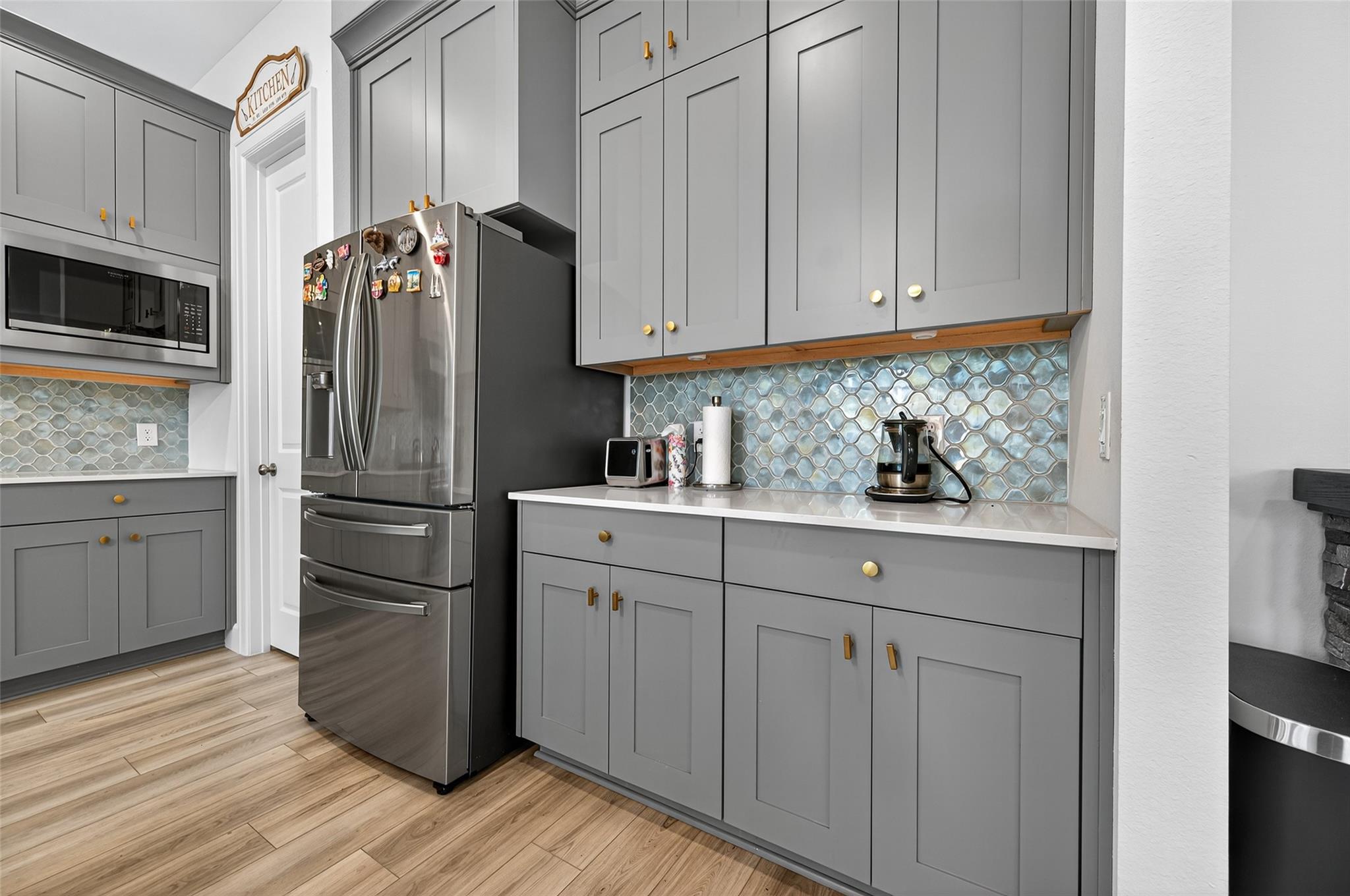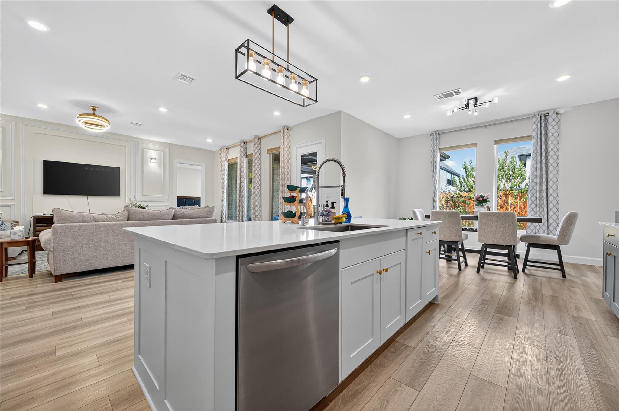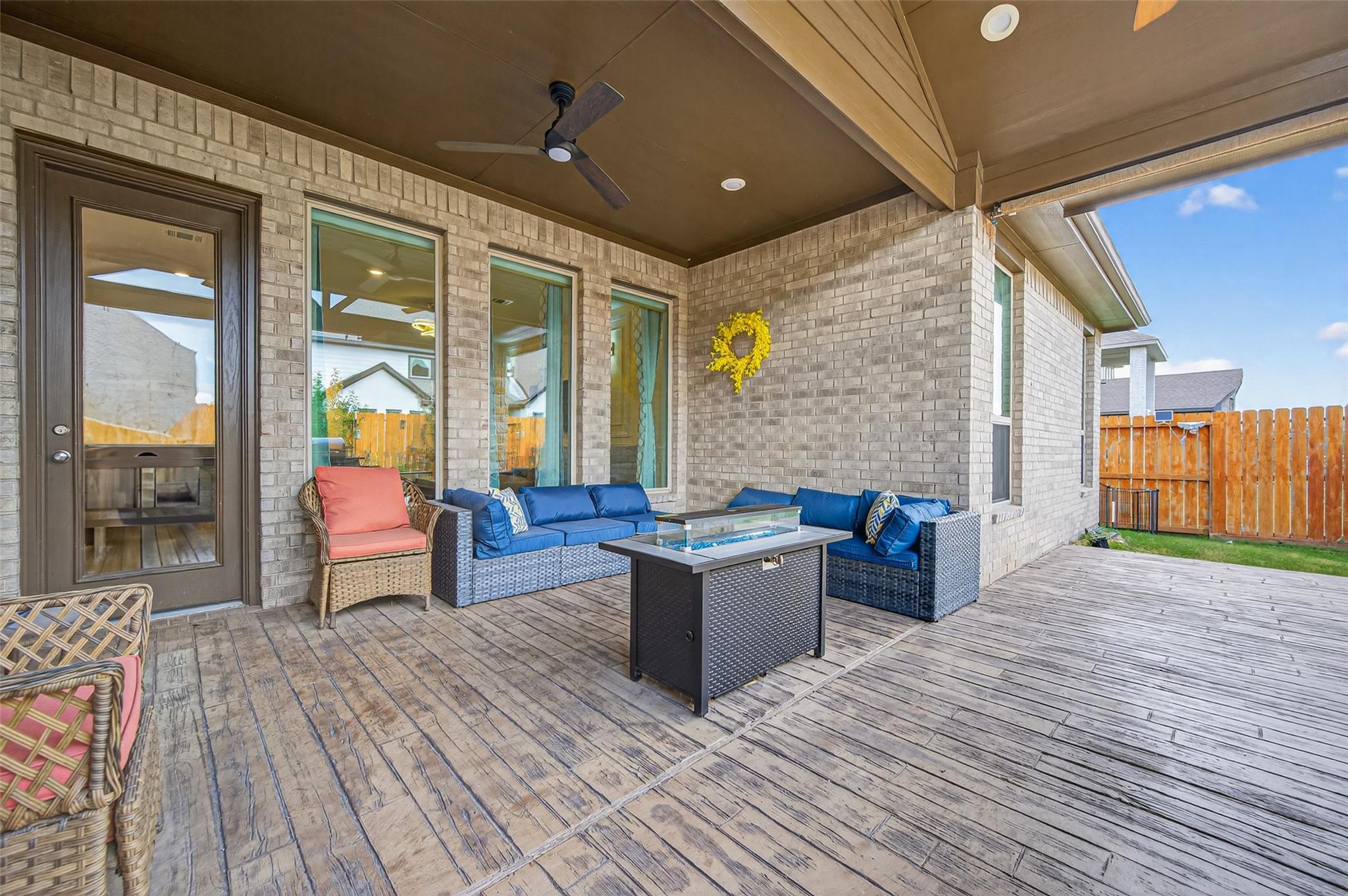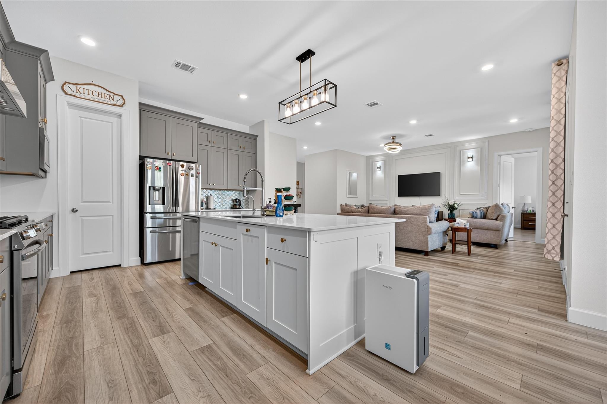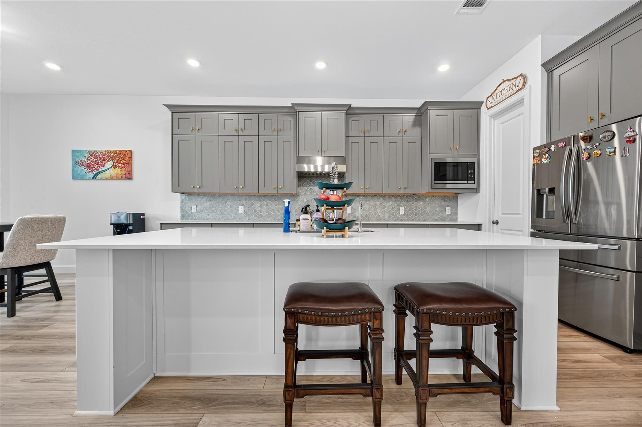 Absolutely stunning Village Builders Pinnacle Collection home in Parkside Village of Towne Lake! Only 2 years old, this elegant 3,100 sq ft one-story features a dramatic extended entry with coffered ceilings and high-end upgrades throughout. Enjoy hardwood and luxury vinyl plank flooring, designer lighting, a whole-house water softener, private home office, game room, and a luxurious primary suite. The gourmet kitchen shines with a quartz seating island and premium stainless steel appliances. Step outside to a custom stone outdoor kitchen—perfect for entertaining. Luxury living at its finest in the heart of Cypress.