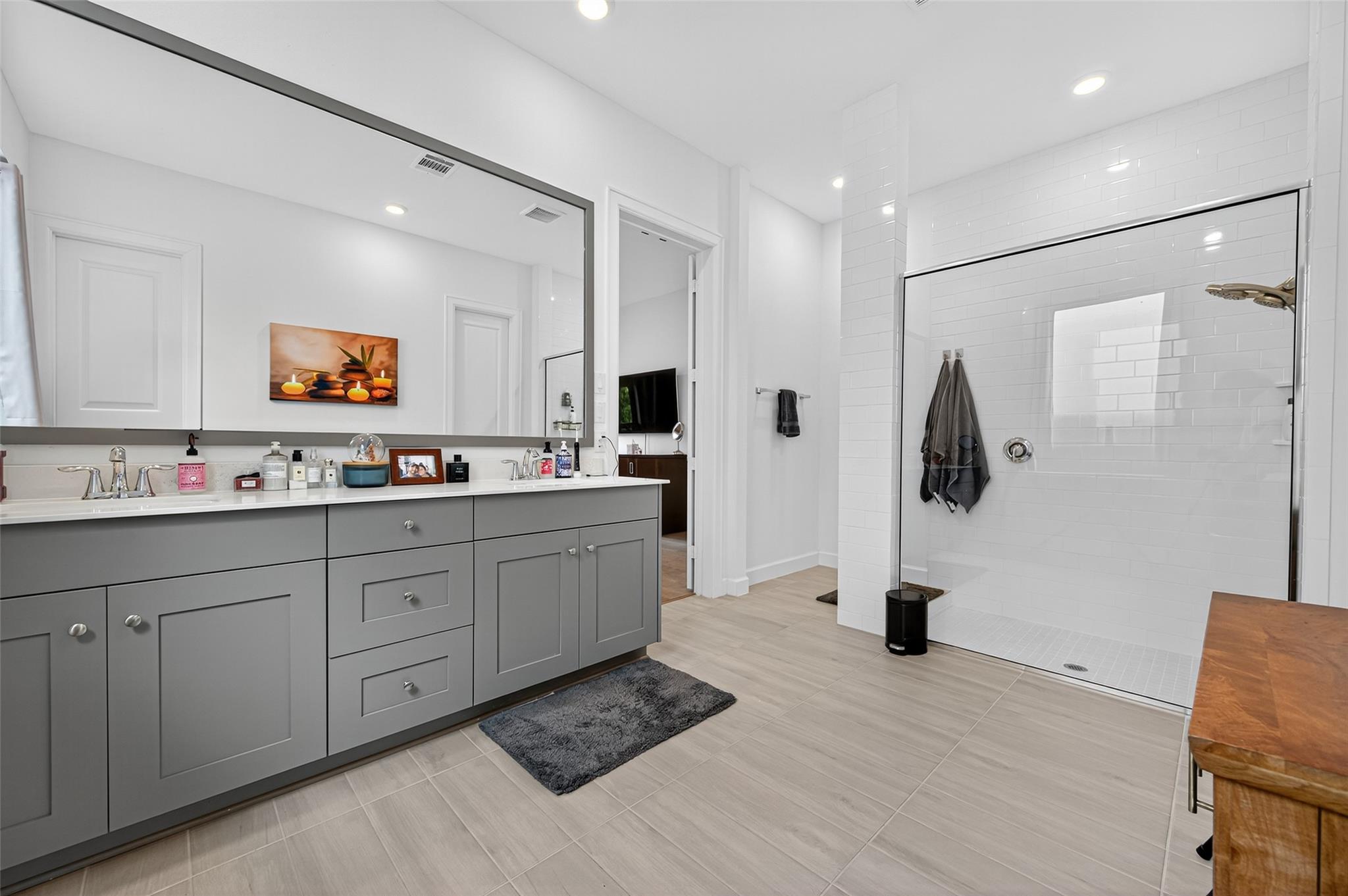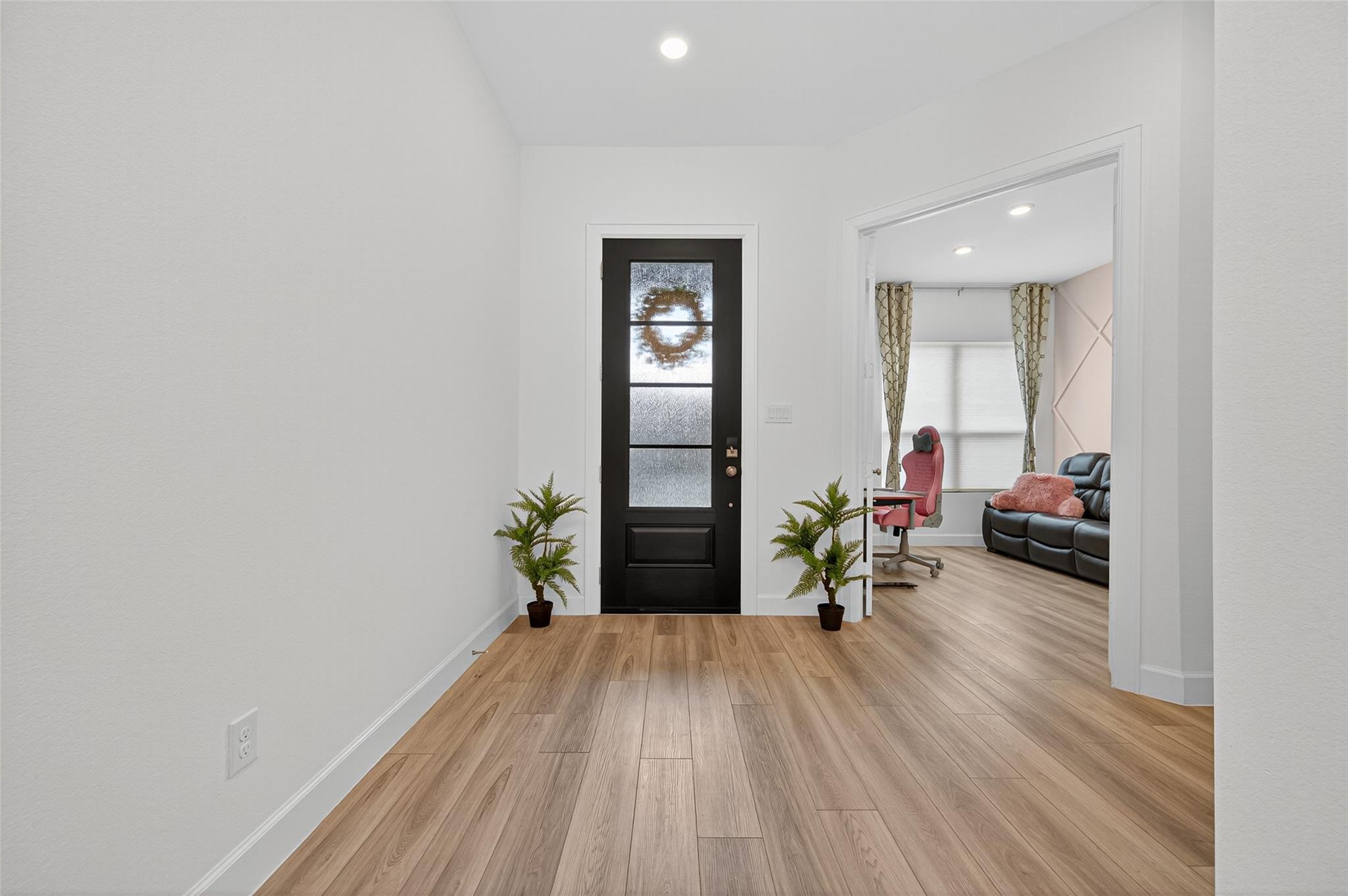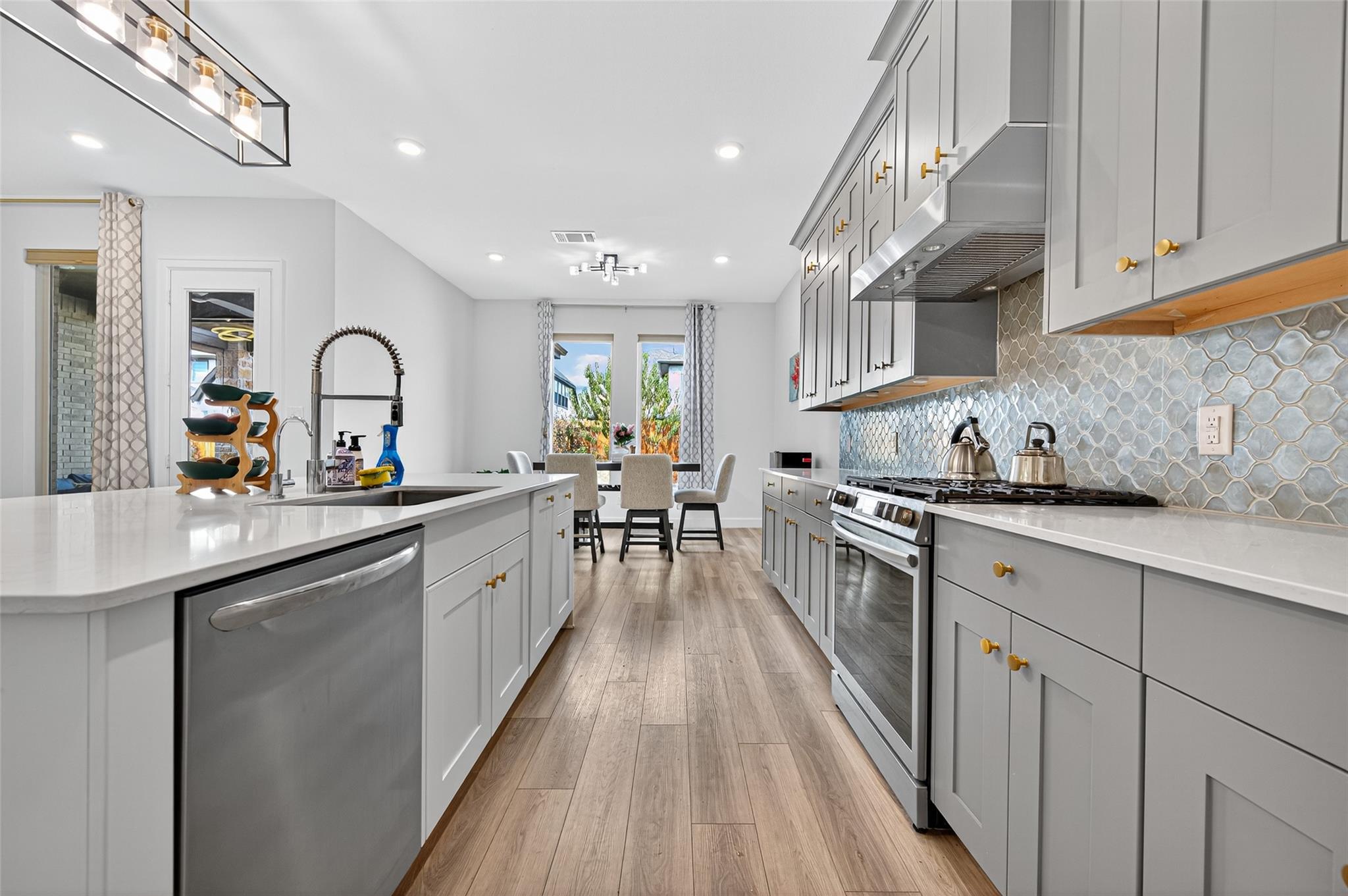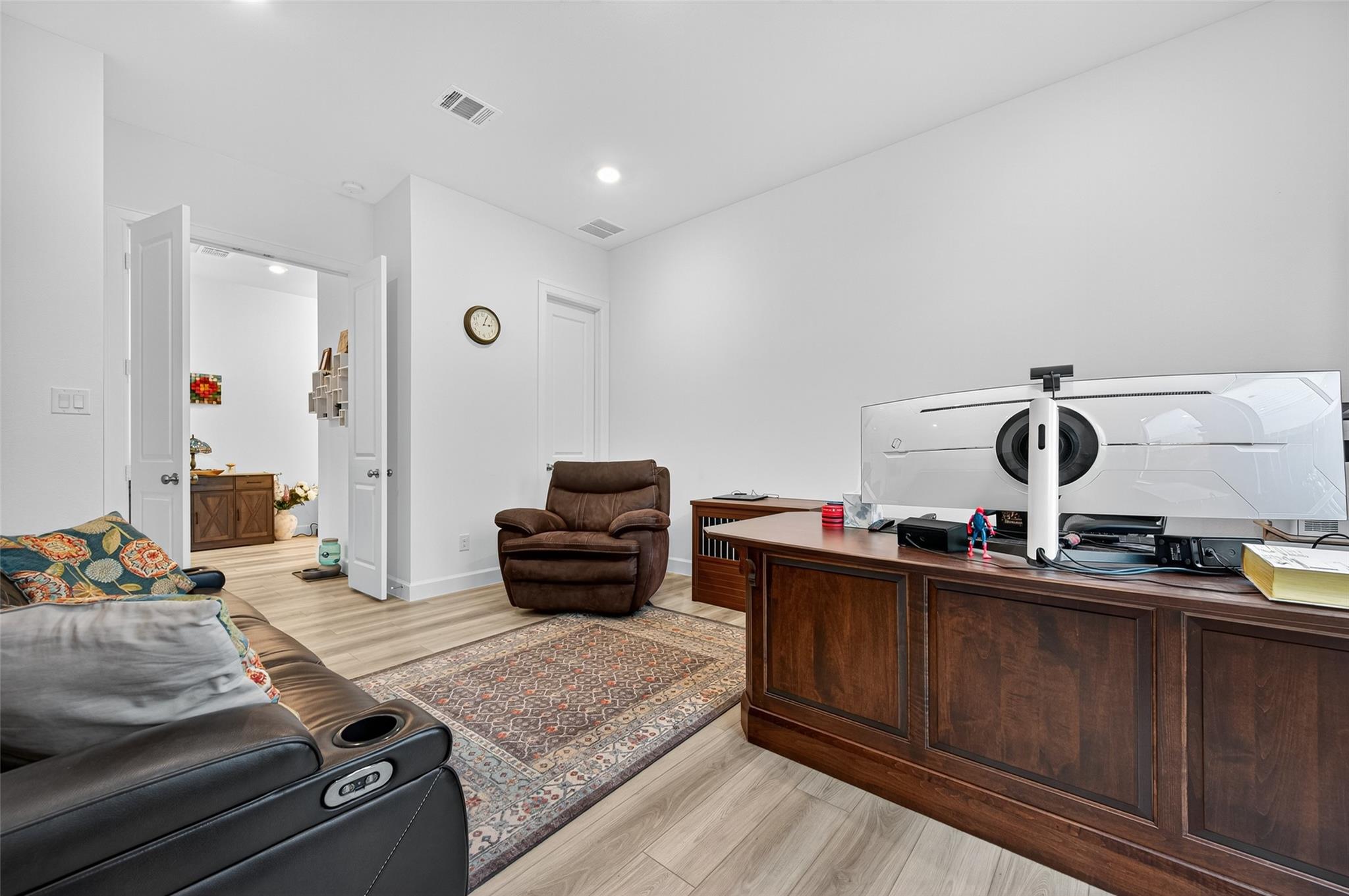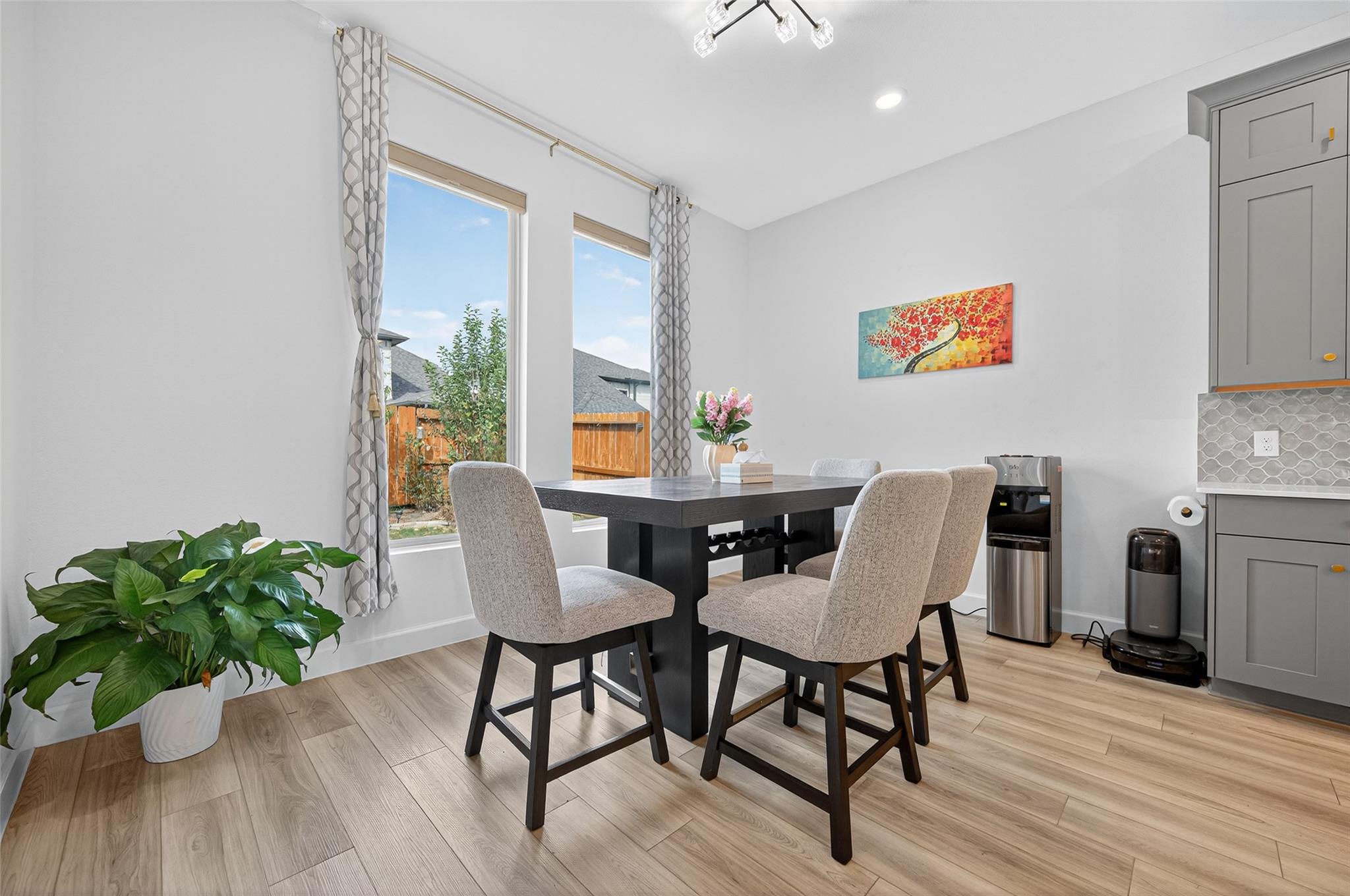 Absolutely stunning Village Builders Pinnacle Collection home in Parkside Village of Towne Lake! Only 2 years old, this elegant 3,100 sq ft one-story features a dramatic extended entry with coffered ceilings and high-end upgrades throughout. Enjoy hardwood and luxury vinyl plank flooring, designer lighting, a whole-house water softener, private home office, game room, and a luxurious primary suite. The gourmet kitchen shines with a quartz seating island and premium stainless steel appliances. Step outside to a custom stone outdoor kitchen—perfect for entertaining. Luxury living at its finest in the heart of Cypress.