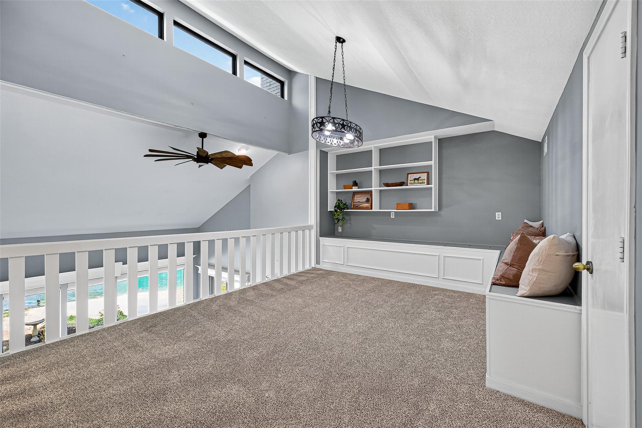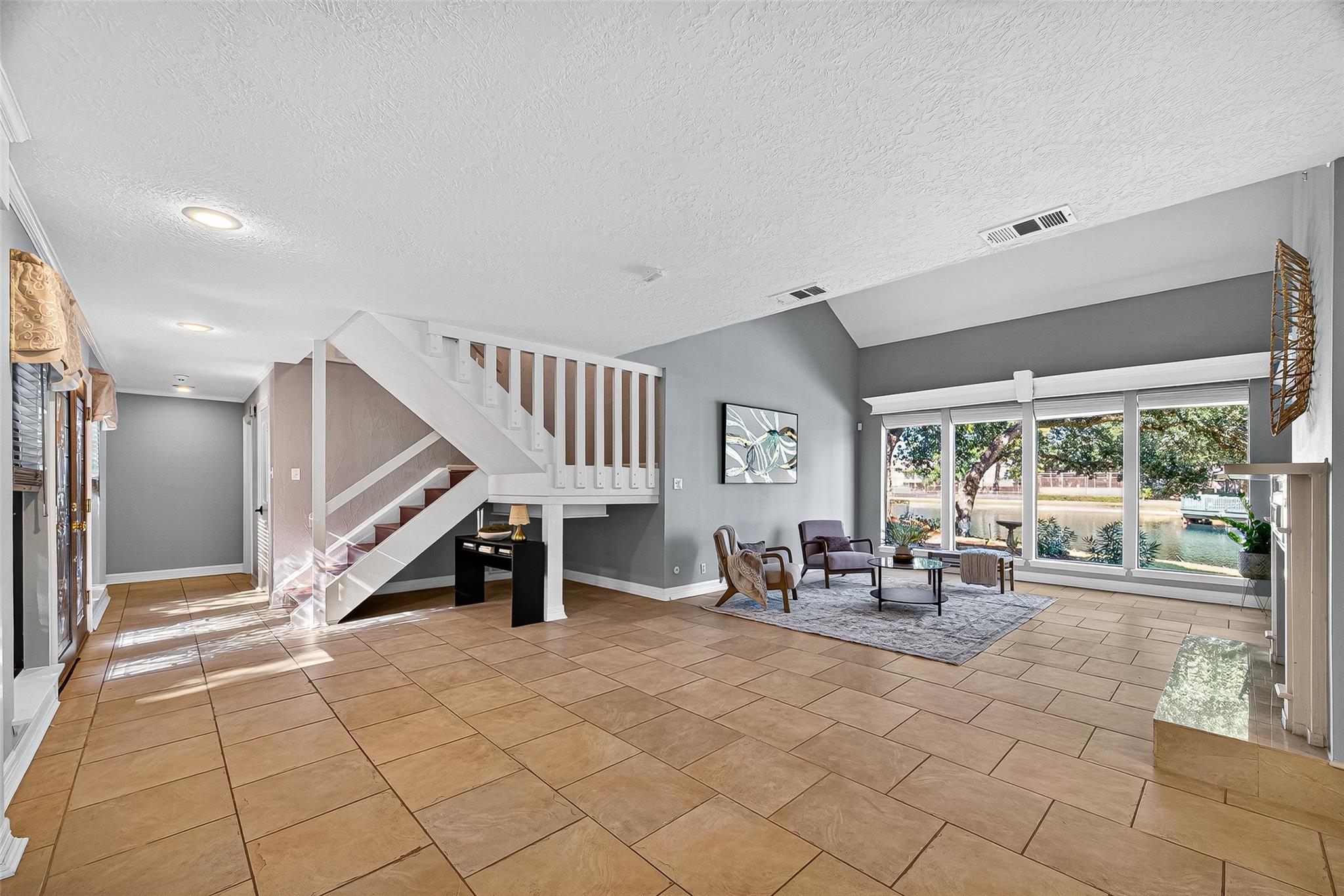 Spectacular Lakefront Home, Quiet Gated Community! Showcasing panoramic water views. Natural Gas 24K Whole House Generator. Grand entrance into oversized tile, gorgeous wood look tile floors in living areas, complemented by plush carpet in the bedrooms. Two bedrooms & 2 full baths down! Living room impresses with soaring two-story vaulted ceiling, cozy fireplace, and stunning lake view. Kitchen truly a chef’s dream—featuring abundant quartzite countertops, marble mozaic tile backsplash, extensive cabinetry, space for 2 refrigerators. Primary suite offers spa-inspired bath with frameless walk-in shower and bench, dolomite counters-shower bench-and window sill to match, dual sinks with kohler or moen fixtures, and spacious separate in-suite his-and-her Walk-in closets, 7 total walk-in closets in home. Balcony-style game-room overlooks living area. Covered & screened deck perfect for relaxing or entertaining. Elegance, comfort, and spectacular views in every direction—true must-see!