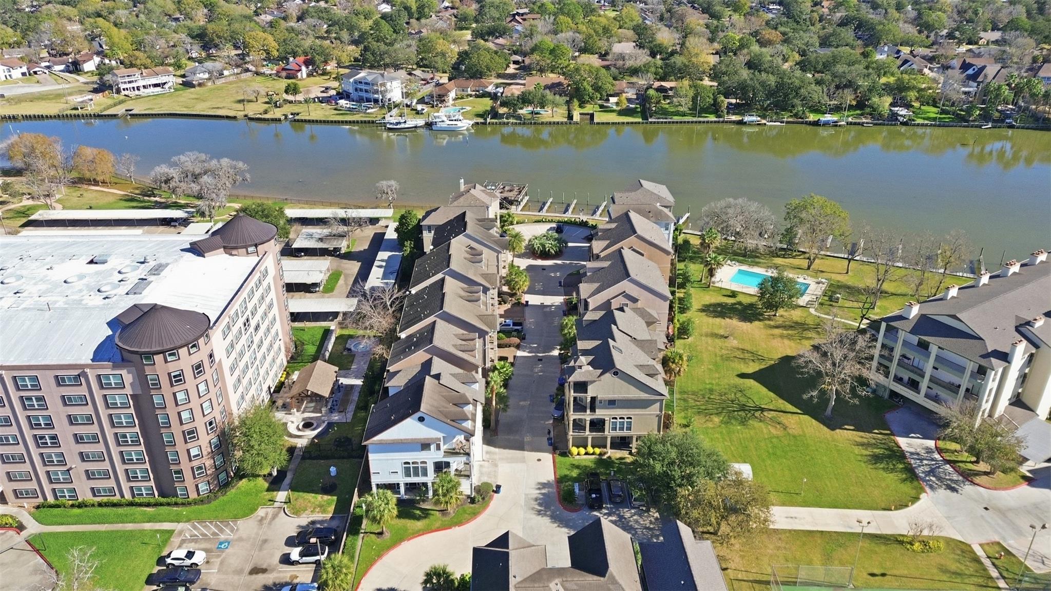 Completely reimagined, this residence in the gated Oaks at Egret Bay showcases expansive living spaces and thoughtful updates throughout. Never flooded. This community offers complimentary boat slips to keep your watercraft on site. When you enter the main floor, you'll notice the oversized living room offers exceptional scale and flexibility, creating a bright, open environment ideal for both everyday living and entertaining. The primary suite is truly impressive, featuring a huge bedroom with soaring ceilings that create a dramatic yet serene retreat. Freshly painted cabinetry, brand-new carpet, and updated finishes bring a clean, modern feel across the home, while a new roof installed in 2024 adds long-term peace of mind. Balconies extend the living space outdoors, and the community’s prime waterfront location provides convenient access to dining, shopping, and major commuting routes.