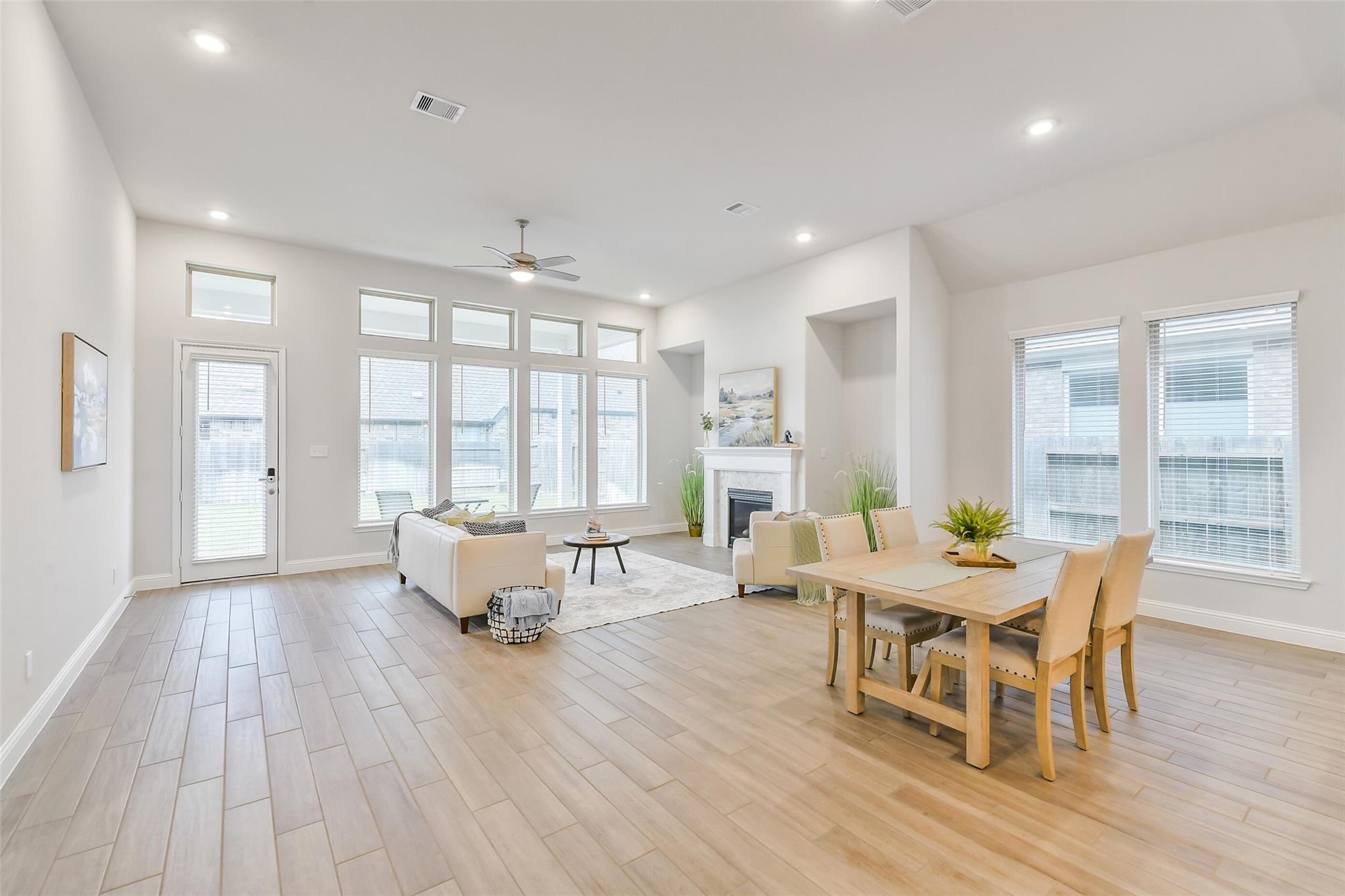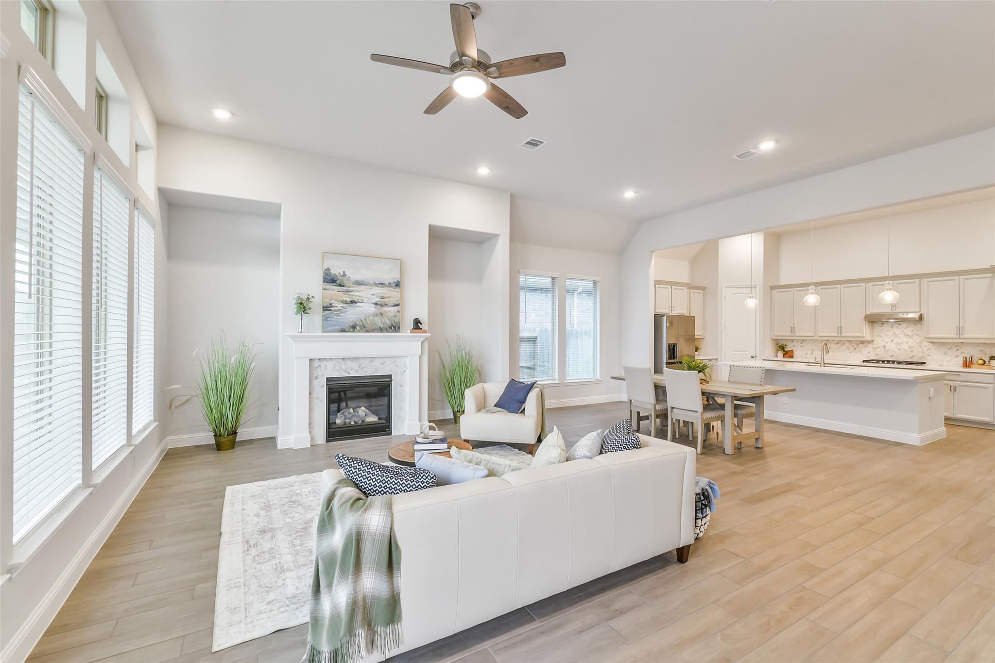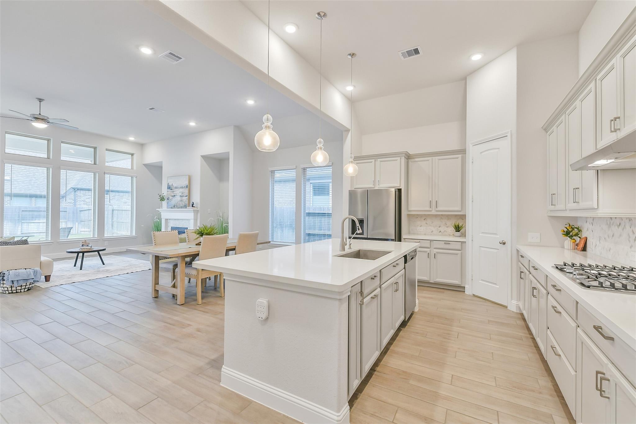 This Beazer Sedona wraps all into one beautiful package. Located in Amira, this smart home boasts 2 bedrooms and baths down, plus a study, and two more bedrooms, a full bath, and game room upstairs. With warm wood look tile throughout the main rooms, high ceilings, and walls of windows, this open floor plan is spacious and bright. The kitchen features quartz counters, island with breakfast bar, specialty cabinets, gas cooktop, designer backsplash, and pendant lighting. A full size sectional would fit in the generous living room with its floor to ceiling windows and gas fireplace. In the primary bedroom, a window seat and trayed ceiling add elegance, and the primary bath with its double sinks, soaking tub, large shower with bench, and oversized closet feels like luxury. French doors frame the study across the hall from a half bath and enormous laundry. An extended covered back porch is the perfect place to watch the amazing sunsets, with a yard large enough for a pool. Come take a look!