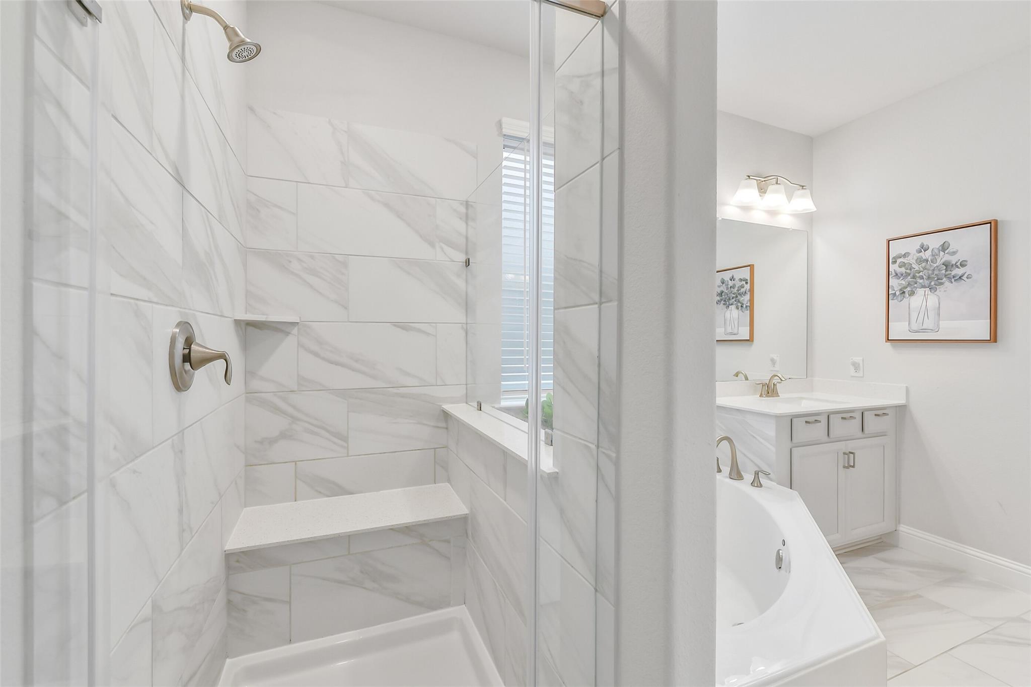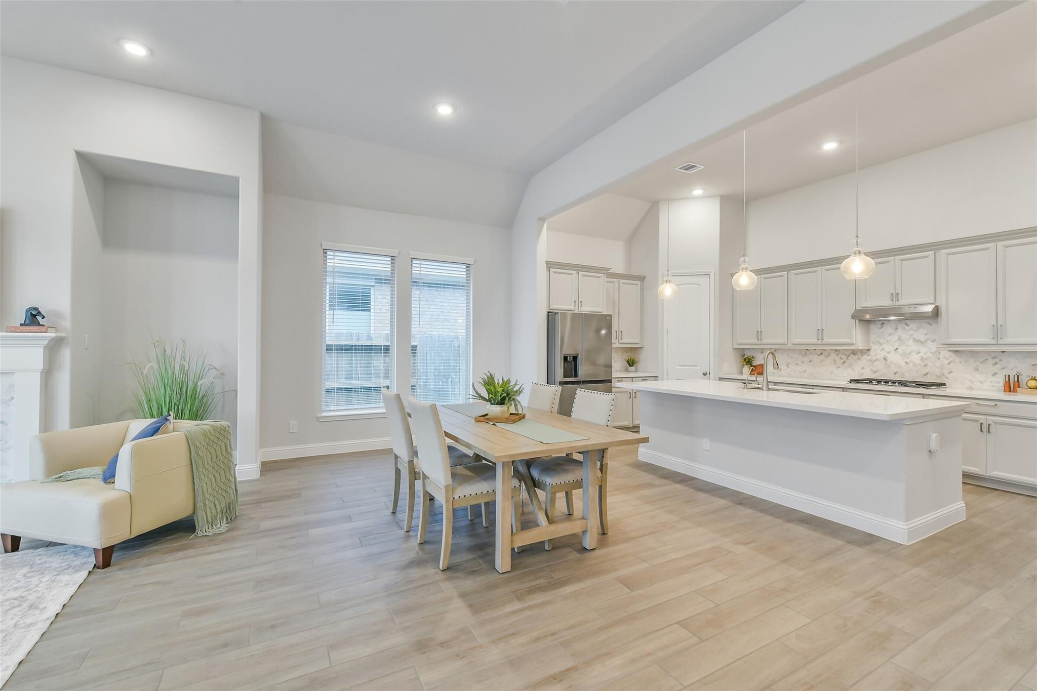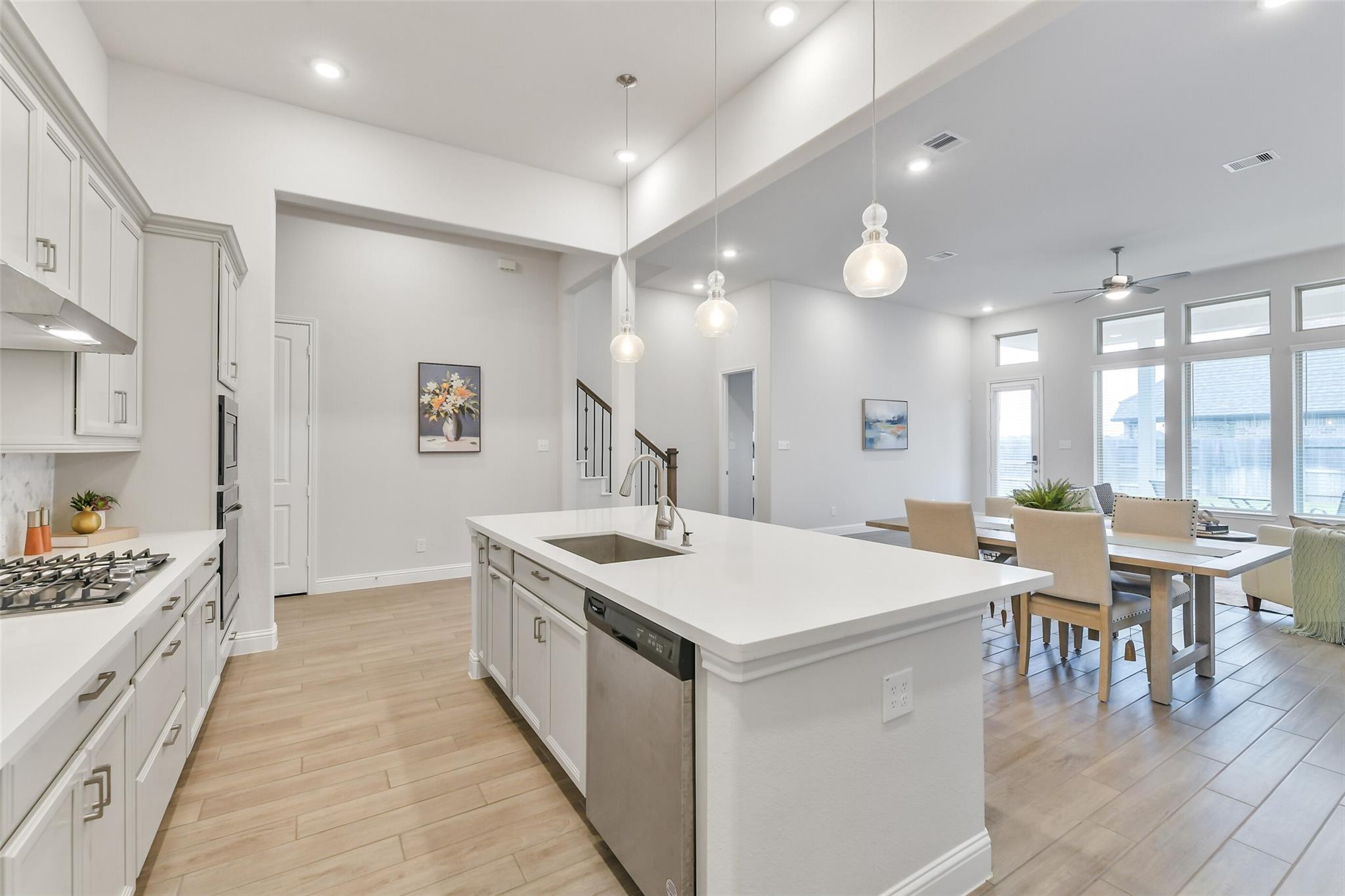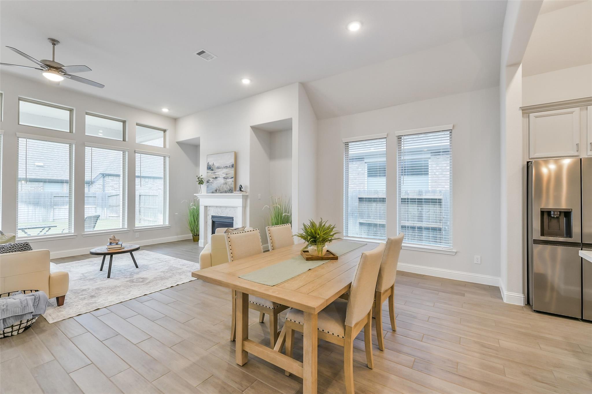 This Beazer Sedona wraps all into one beautiful package. Located in Amira, this smart home boasts 2 bedrooms and baths down, plus a study, and two more bedrooms, a full bath, and game room upstairs. With warm wood look tile throughout the main rooms, high ceilings, and walls of windows, this open floor plan is spacious and bright. The kitchen features quartz counters, island with breakfast bar, specialty cabinets, gas cooktop, designer backsplash, and pendant lighting. A full size sectional would fit in the generous living room with its floor to ceiling windows and gas fireplace. In the primary bedroom, a window seat and trayed ceiling add elegance, and the primary bath with its double sinks, soaking tub, large shower with bench, and oversized closet feels like luxury. French doors frame the study across the hall from a half bath and enormous laundry. An extended covered back porch is the perfect place to watch the amazing sunsets, with a yard large enough for a pool. Come take a look!