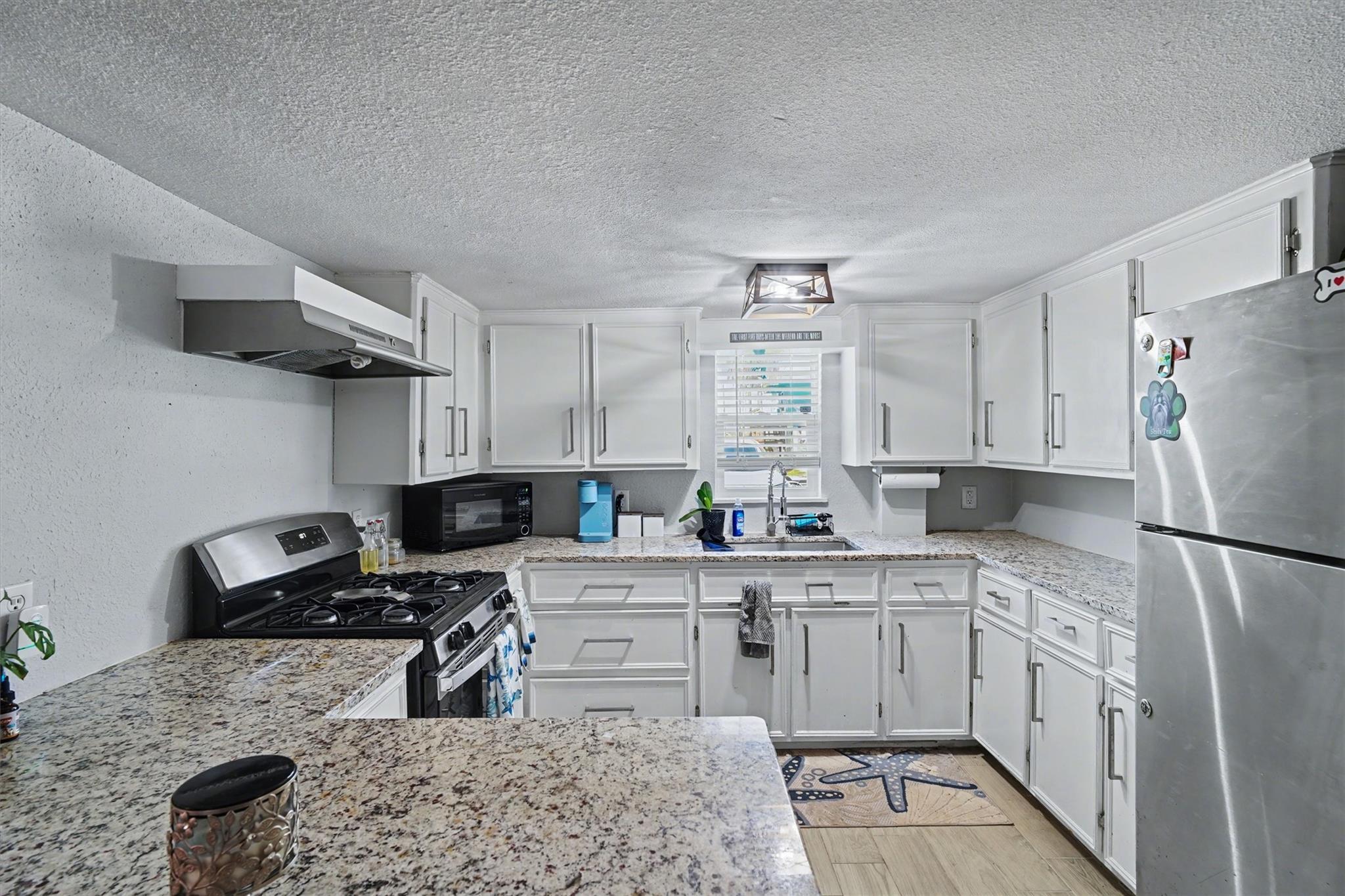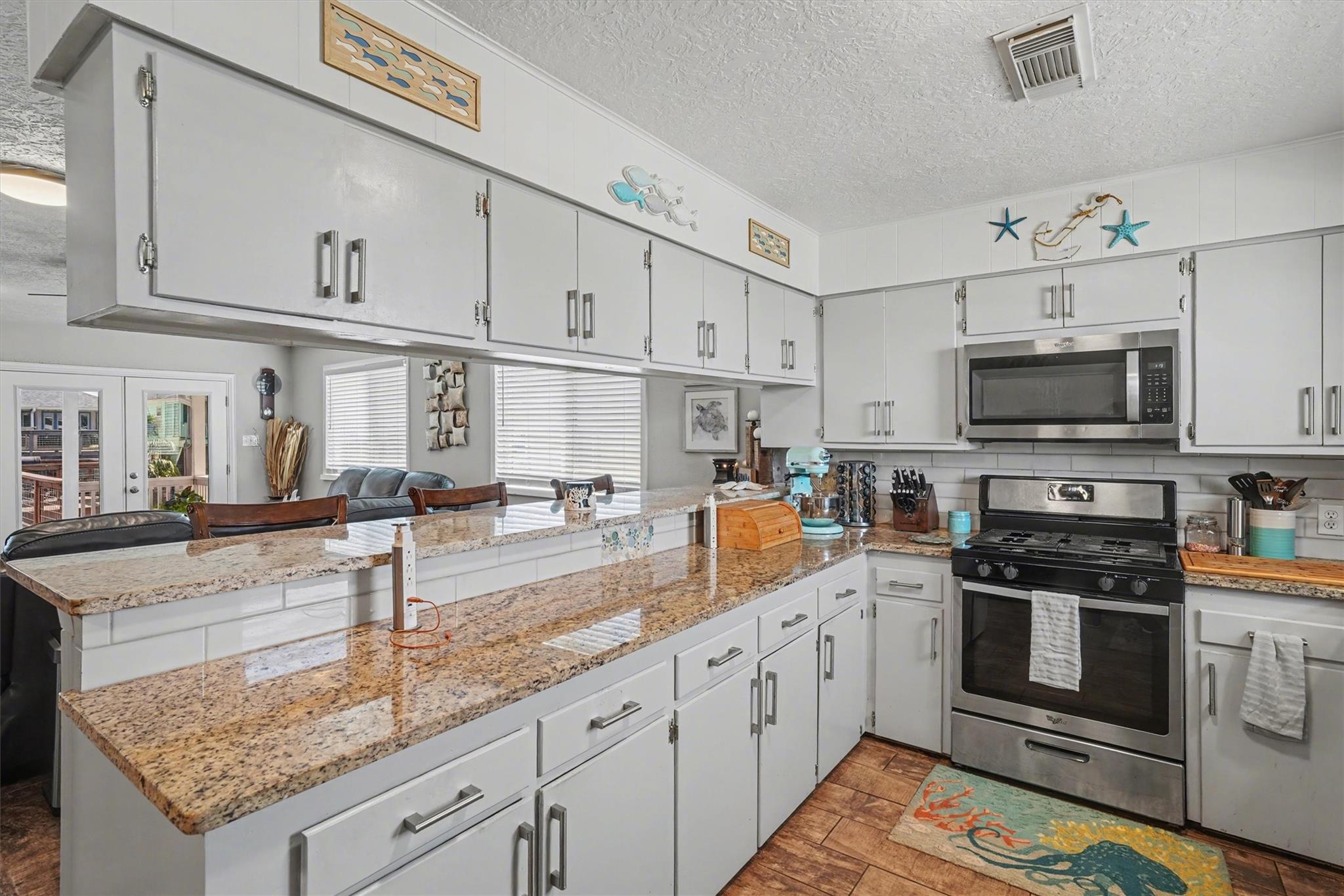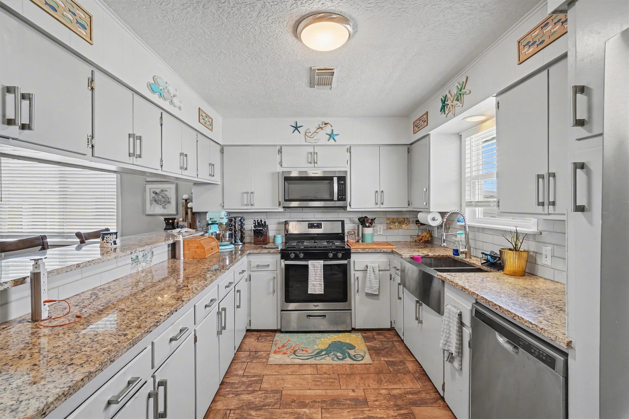 East facing totally remodeled waterfront home offering buyers the chance to enjoy coastal living without tackling updates. Roof & windows replaced in 2024. Upstairs features tile floors & a stunning kitchen remodel w/abundant cabinets, granite counters, stainless appliances & a buffet perfect for coffee bar or cocktail station. The living area w/fireplace overlooks the water for relaxing views. The upstairs bathroom remodel includes custom cabinetry, granite counters & a luxurious oversized walk-in shower. Interior & exterior stairs provide easy access. Downstairs offers a versatile flex room ideal for a bedroom, gameroom, home gym or private living quarters, plus a full kitchen w/granite & a full bath. The home offers updated concrete on the water side, providing tons of outdoor entertainment space for enjoying waterfront living The upper party deck & boathouse serve dual purposes for boat protection & waterfront entertaining, while the water side provides plentiful afternoon shade.