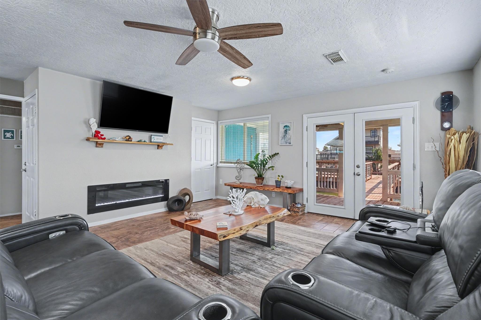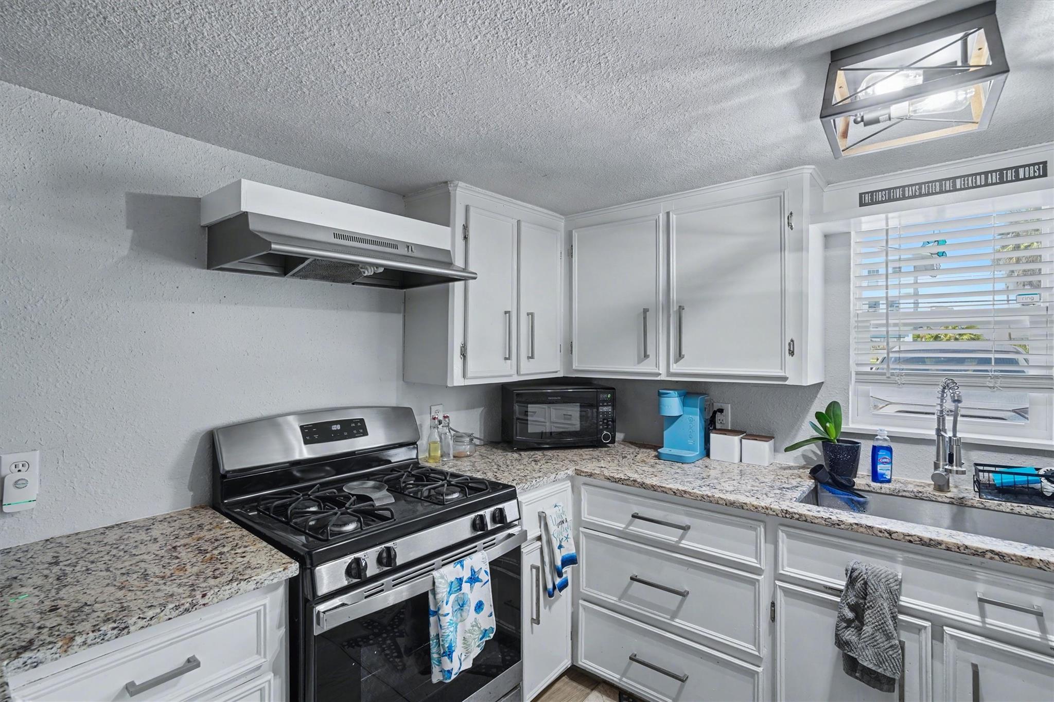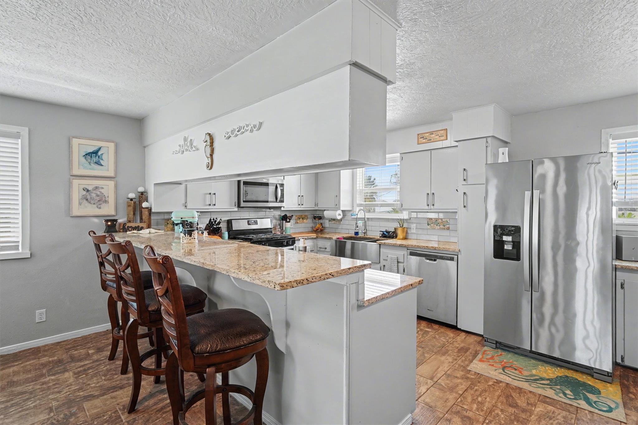 East facing totally remodeled waterfront home offering buyers the chance to enjoy coastal living without tackling updates. Roof & windows replaced in 2024. Upstairs features tile floors & a stunning kitchen remodel w/abundant cabinets, granite counters, stainless appliances & a buffet perfect for coffee bar or cocktail station. The living area w/fireplace overlooks the water for relaxing views. The upstairs bathroom remodel includes custom cabinetry, granite counters & a luxurious oversized walk-in shower. Interior & exterior stairs provide easy access. Downstairs offers a versatile flex room ideal for a bedroom, gameroom, home gym or private living quarters, plus a full kitchen w/granite & a full bath. The home offers updated concrete on the water side, providing tons of outdoor entertainment space for enjoying waterfront living The upper party deck & boathouse serve dual purposes for boat protection & waterfront entertaining, while the water side provides plentiful afternoon shade.
