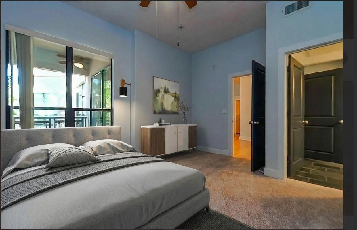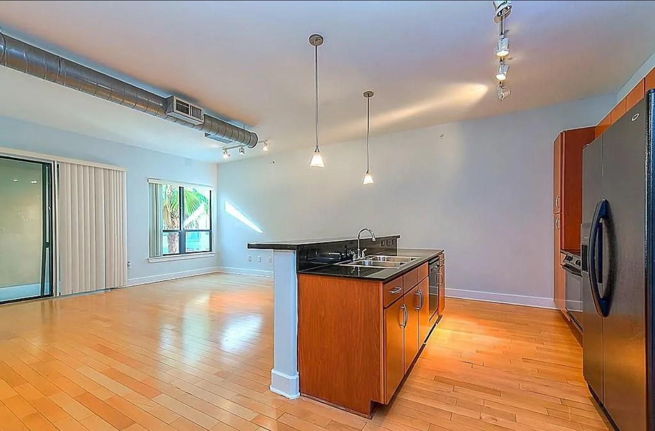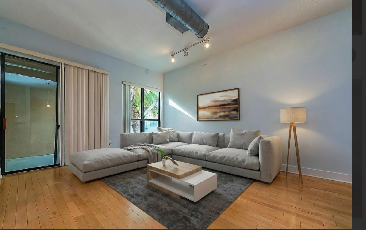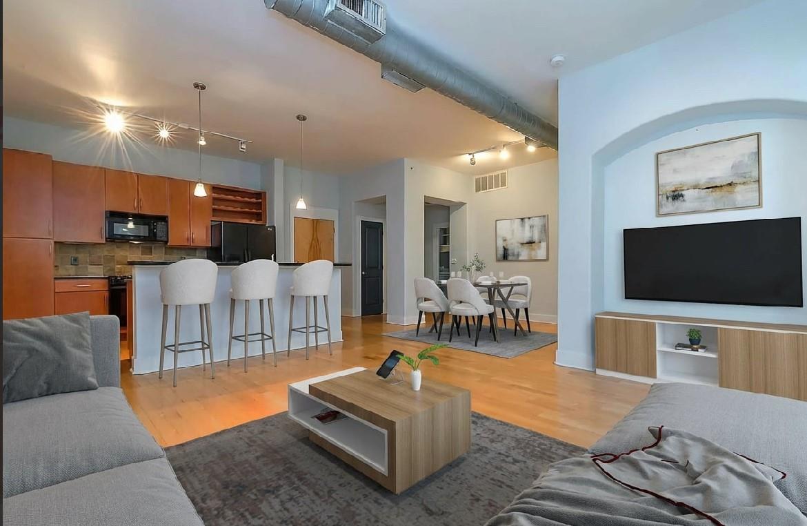 Experience elevated living in this highly sought-after M-7 floor plan, perched on the top floor with a private balcony overlooking the resort-style pool. Privately positioned on a corner of the fourth floor, this exceptionalism condo is bathed in natural light. High ceilings, rich hardwood flooring in the living areas, and a thoughtfully designed, kitchen flows seamlessly into an expansive living and dining space—ideal for refined entertaining and everyday comfort. Primary bedroom serves as a serene retreat, complete with an en-suite spa-inspired bathroom featuring double vanities, a garden soaking tub, and a separate walk-in shower. The residence comes fully appointed with a refrigerator, washer, and dryer for effortless living. Recent enhancements Included:HVAC system replaced in 2022Dishwasher replaced in 2021 Washer and dryer replaced in 2021 Residents have access to resort-caliber amenities, swimming pools, coffee bar, theater, conference room, dog park, fitness center.