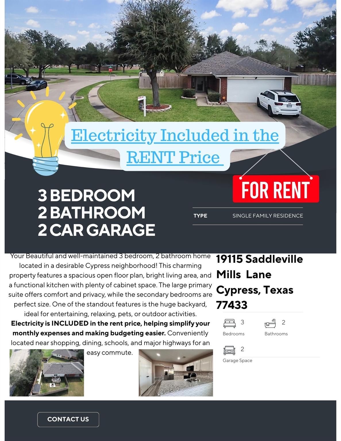 /monthBeautiful and well-maintained 3 bedroom, 2 bathroom home located in a desirable Cypress neighborhood! This charming property features a spacious open floor plan, bright living area, and a functional kitchen with plenty of cabinet space. The large primary suite offers comfort and privacy, while the secondary bedrooms are perfect size. One of the standout features is the huge backyard, ideal for entertaining, relaxing, pets, or outdoor activities. Electricity is INCLUDED in the rent price, helping simplify your monthly expenses and making budgeting easier. Conveniently located near shopping, dining, schools, and major highways for an easy commute. Community Park Across the culdesac community.