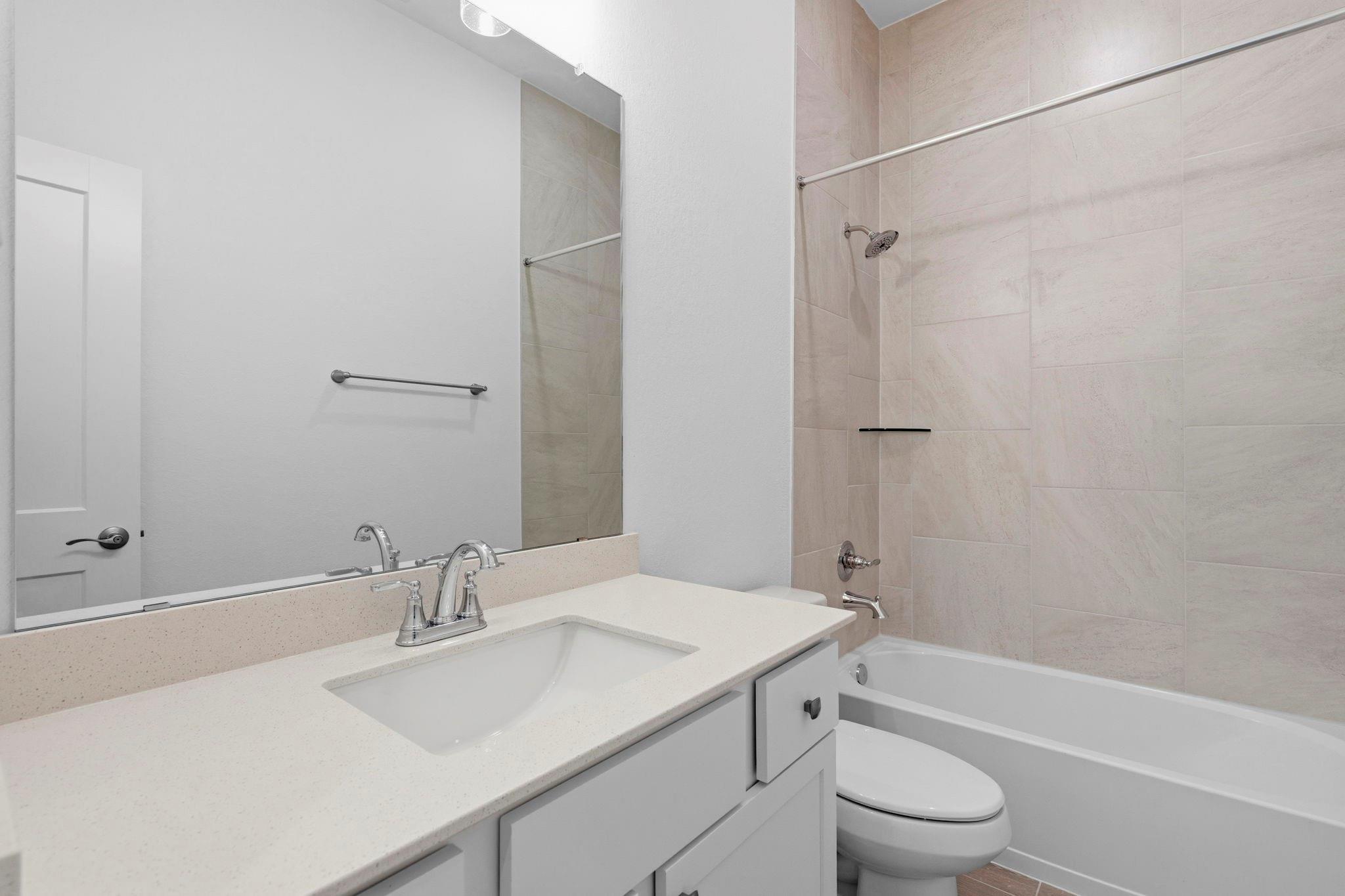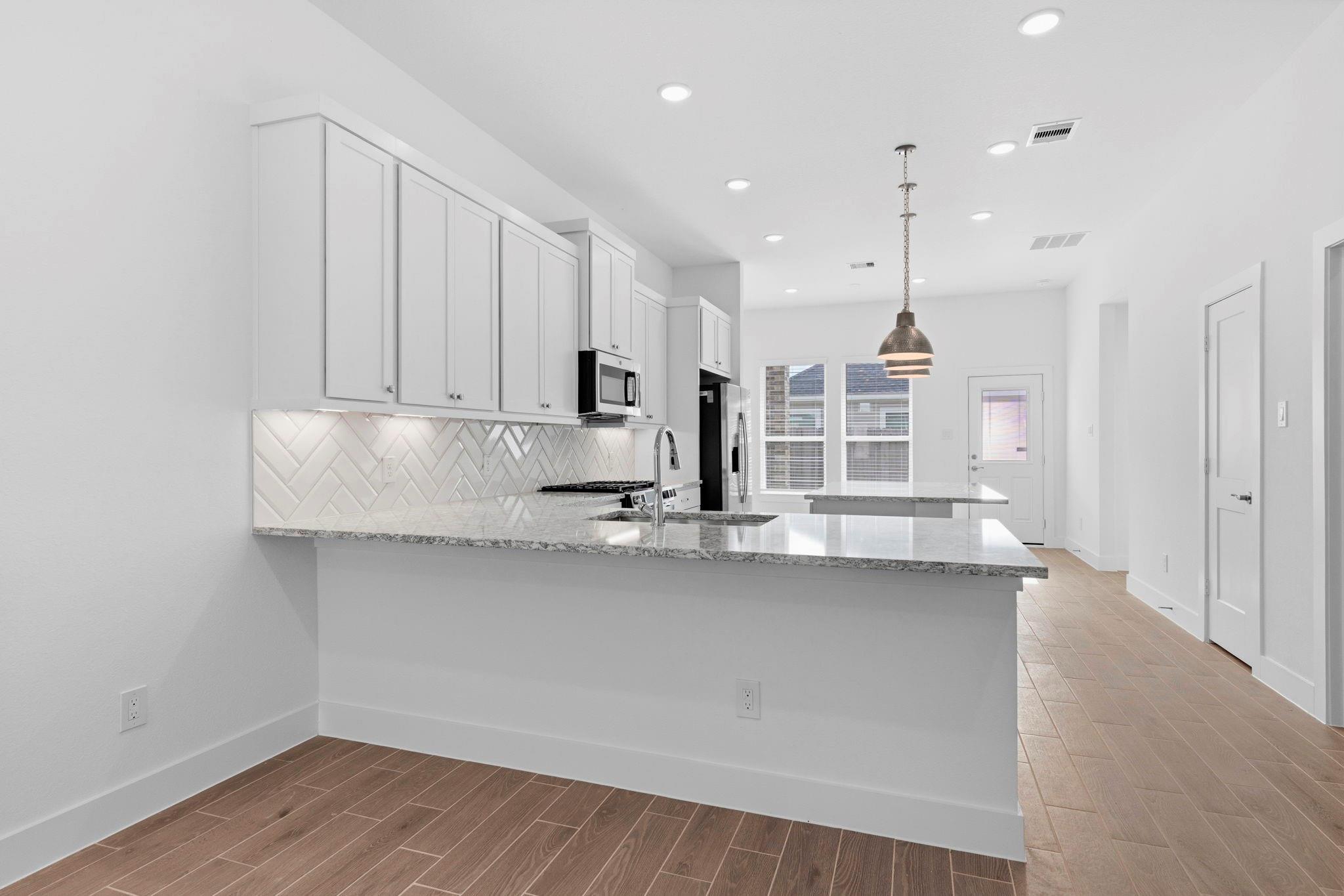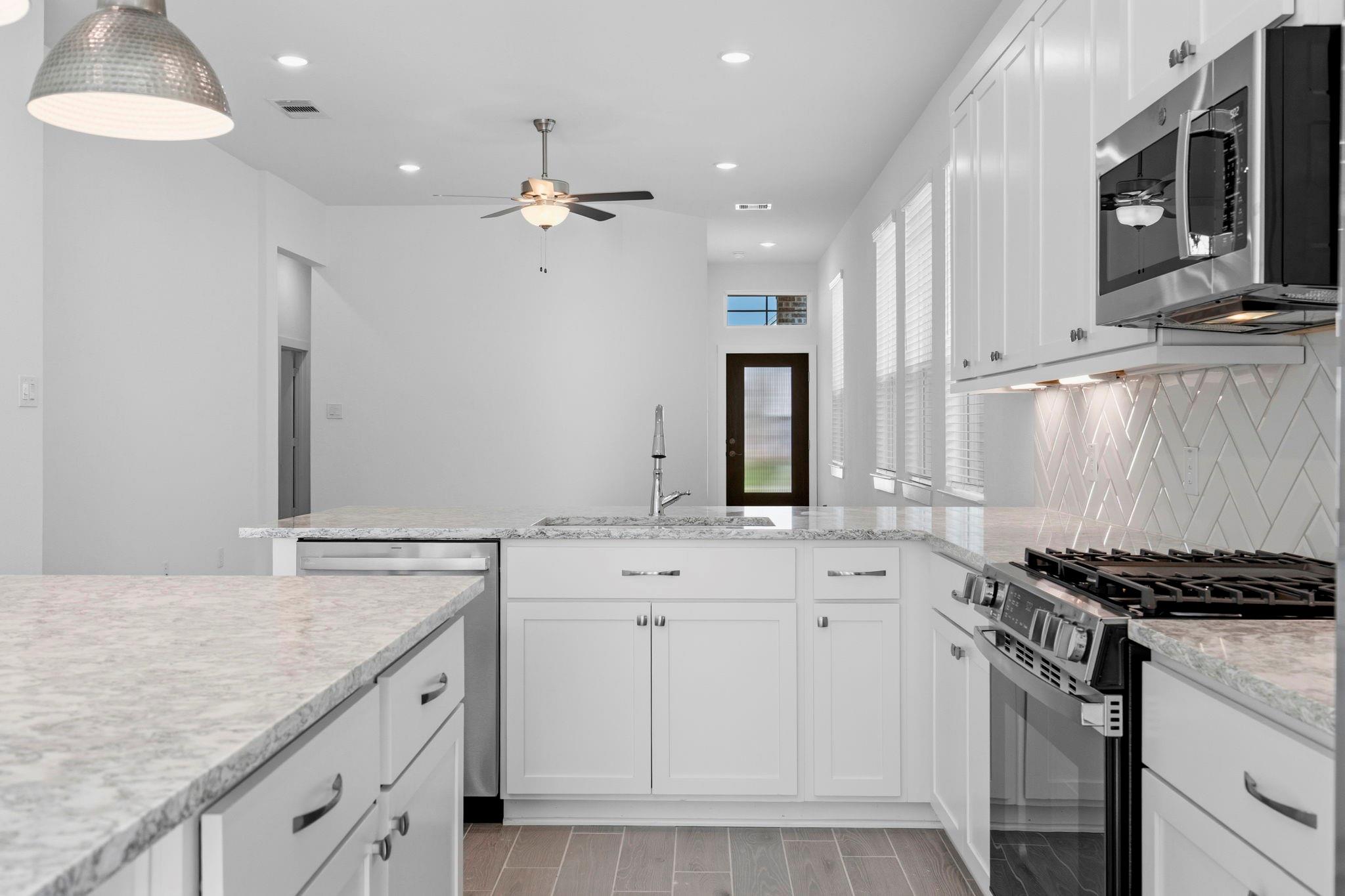 Light and bright designer finishes including wood look tile flooring throughout, 42" kitchen cabinets with under cabinet lighting and accent hardware. Large kitchen island with pendant lights. Herringbone tile backsplash. Farmhouse style undermount sink with single basin. Separate tub & shower in Primary Retreat. Located on a cul-de-sac street and walking distance to the entertainment pavilion and amenity center. Full sprinkler system. Blinds, garage door openers & stainless fridge included! Schedule your tour today!